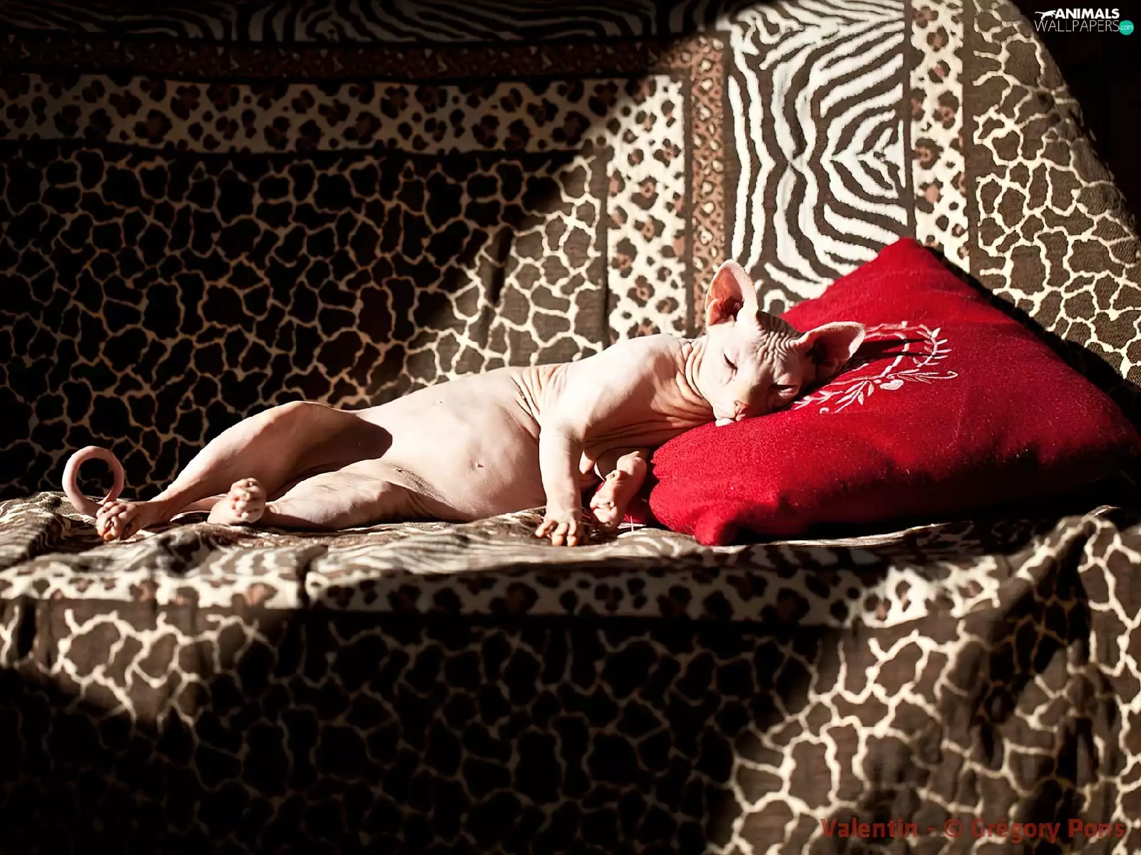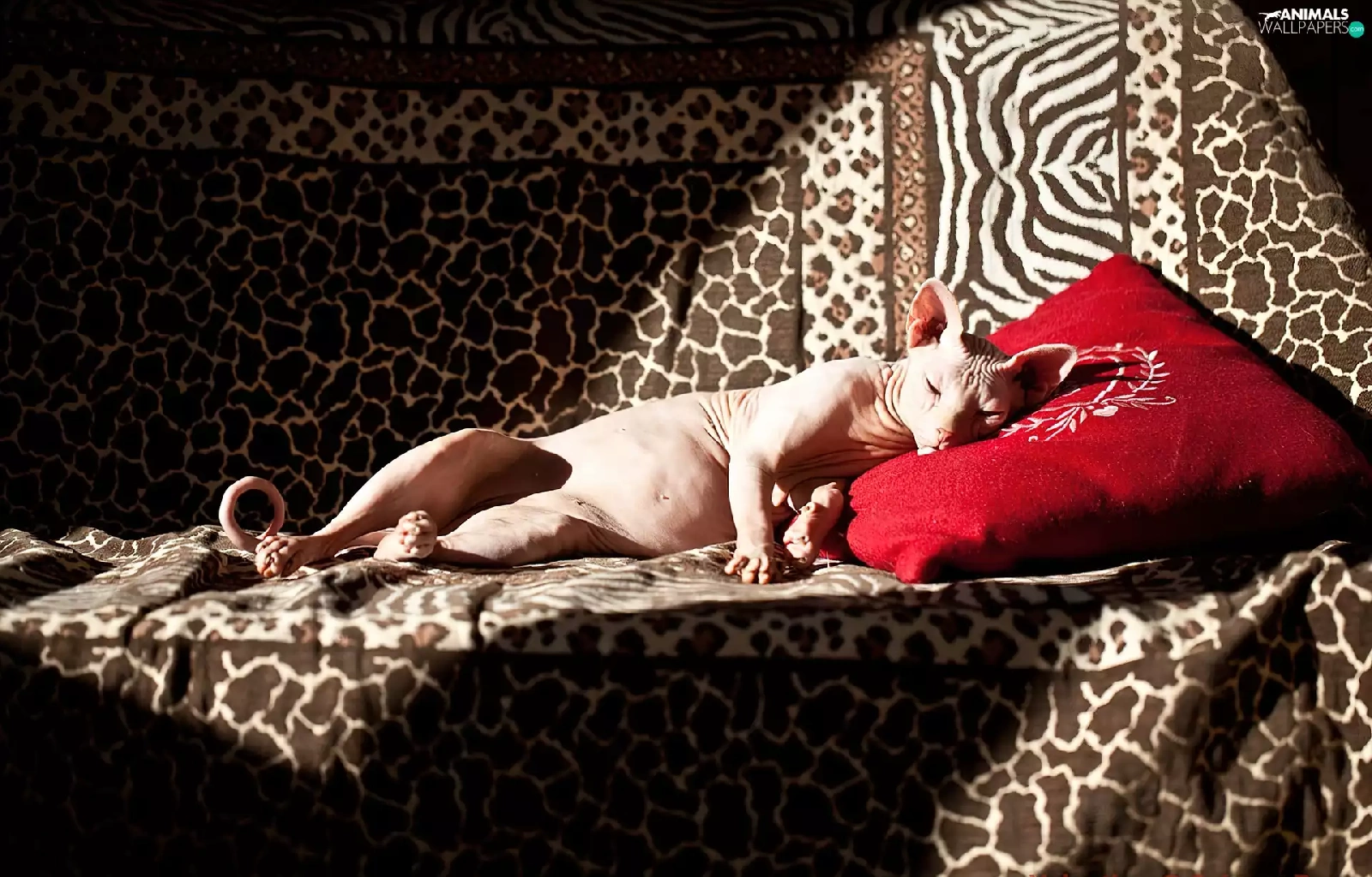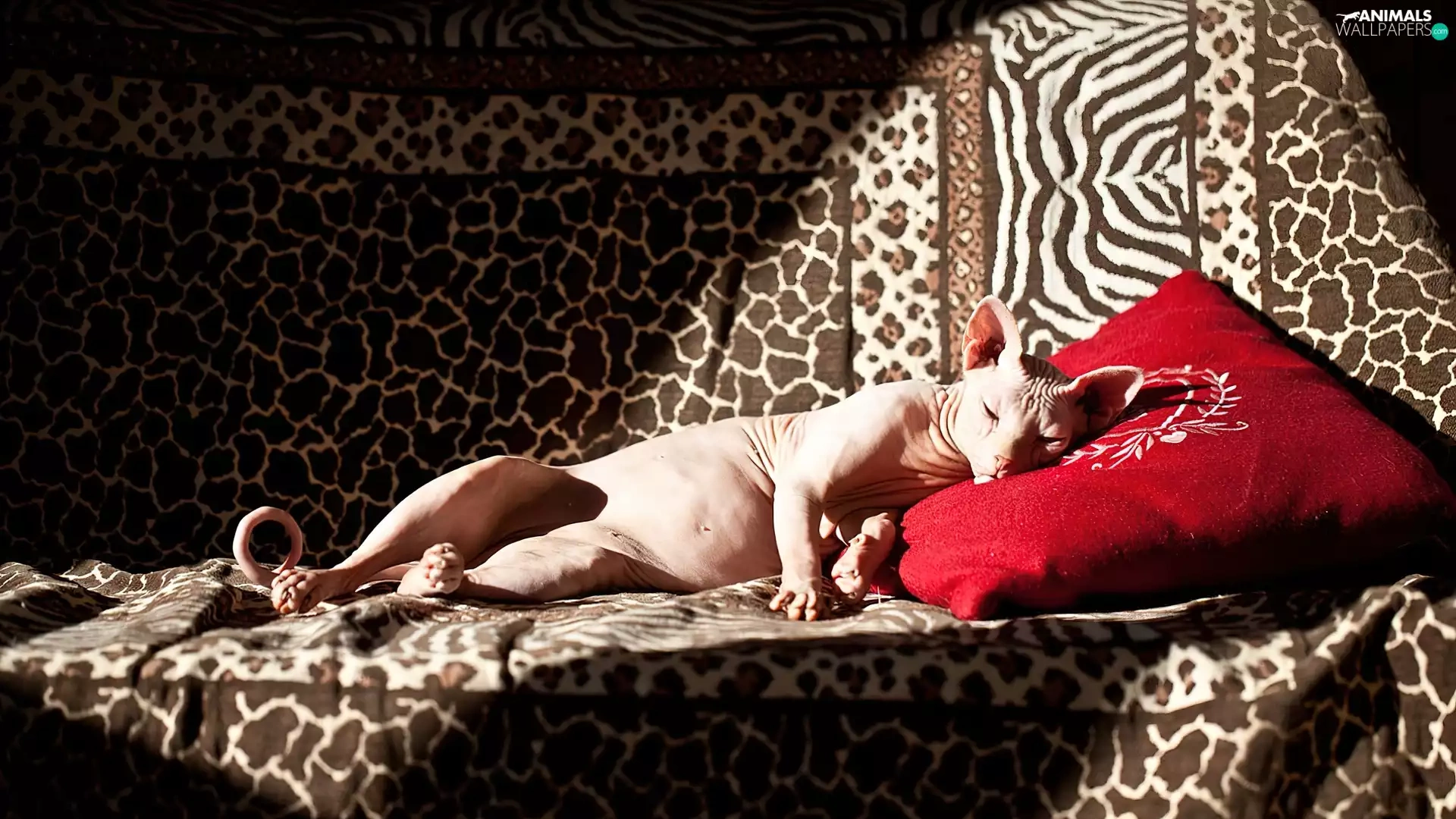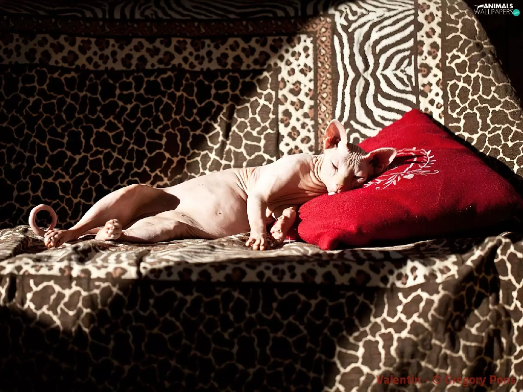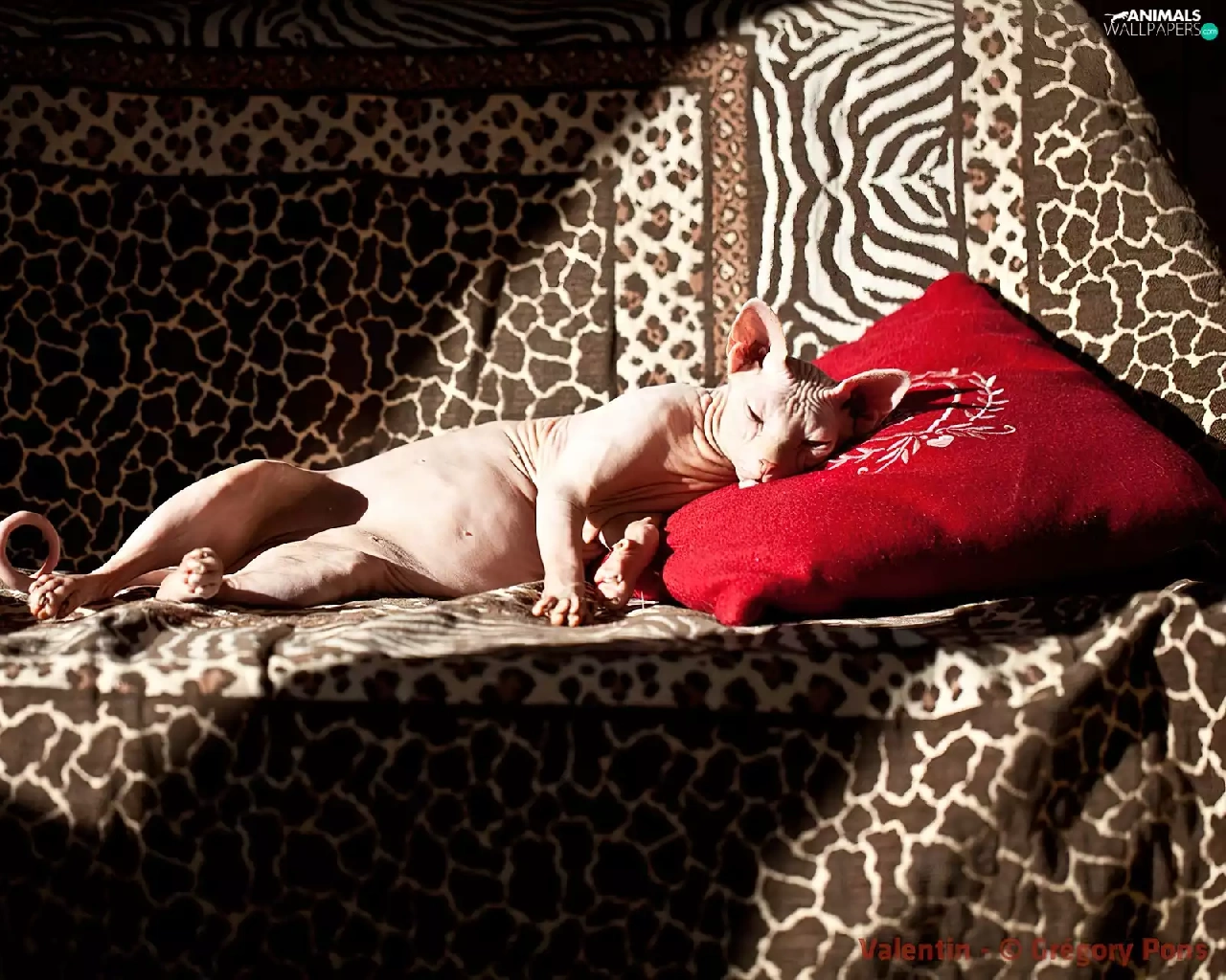 Red, Pillow, sphinx, Sofa, kitten