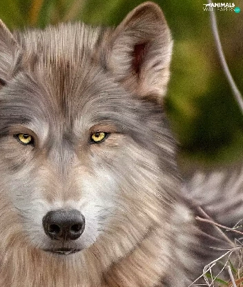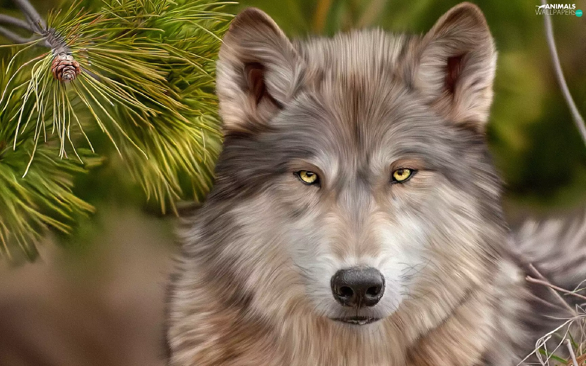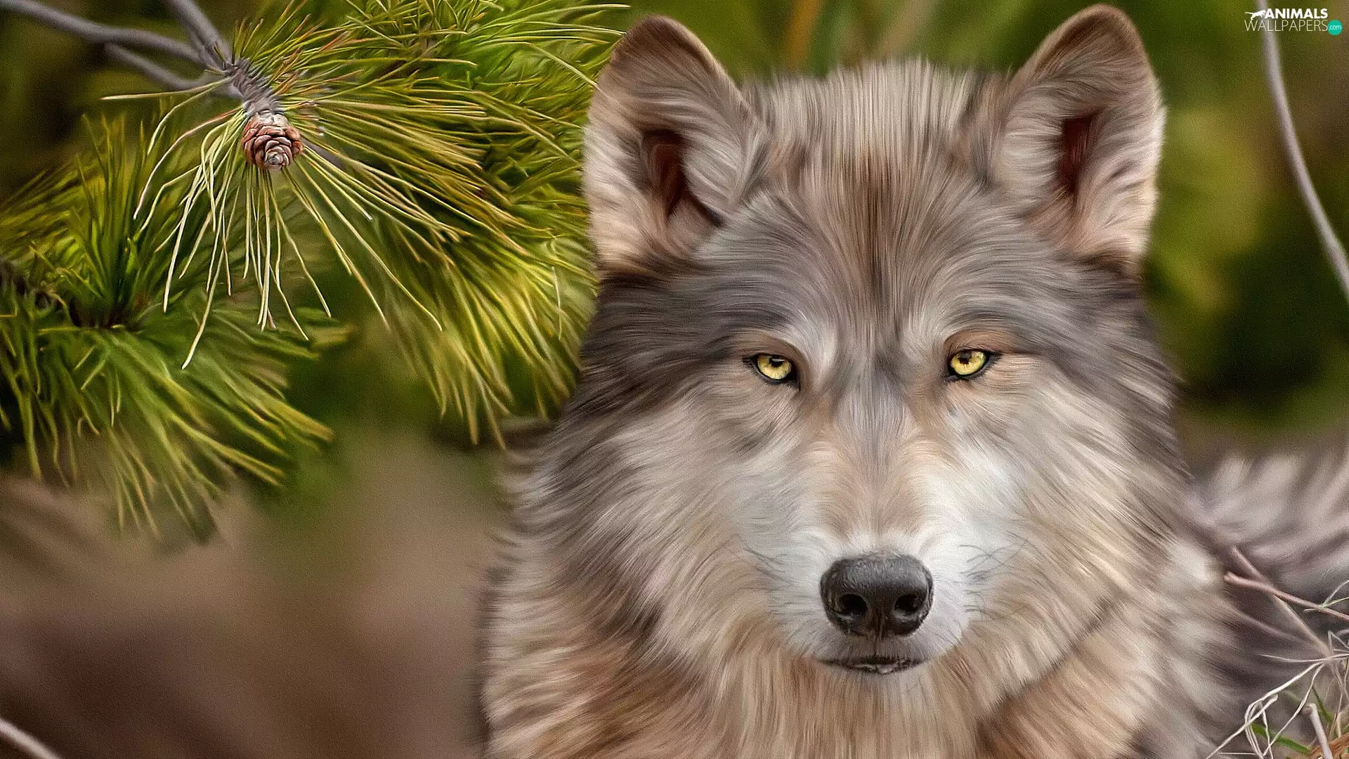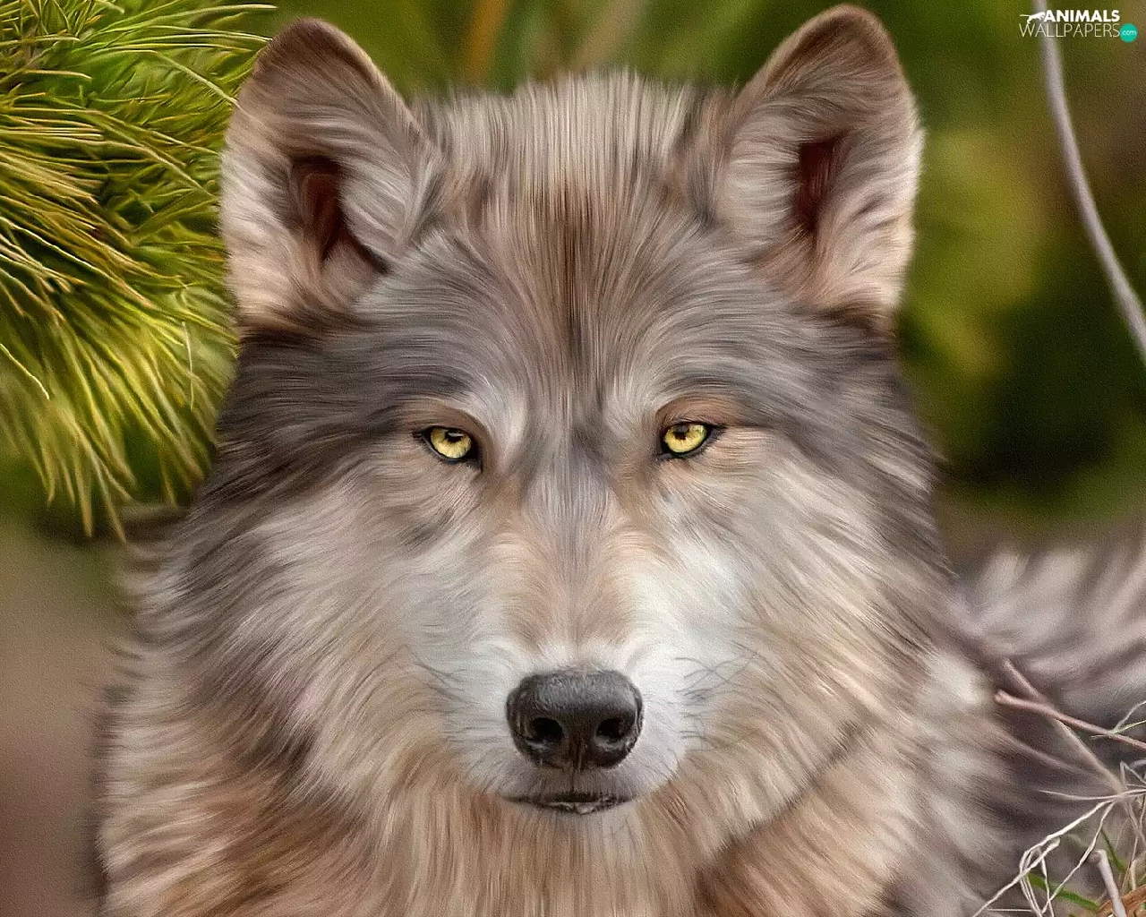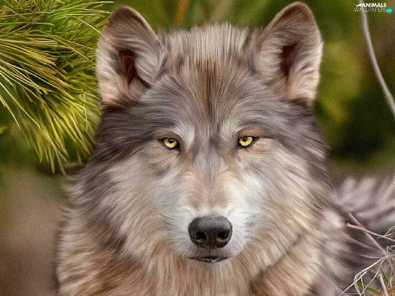 Wolf, Twigs, graphics, pine