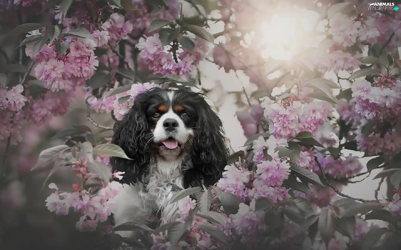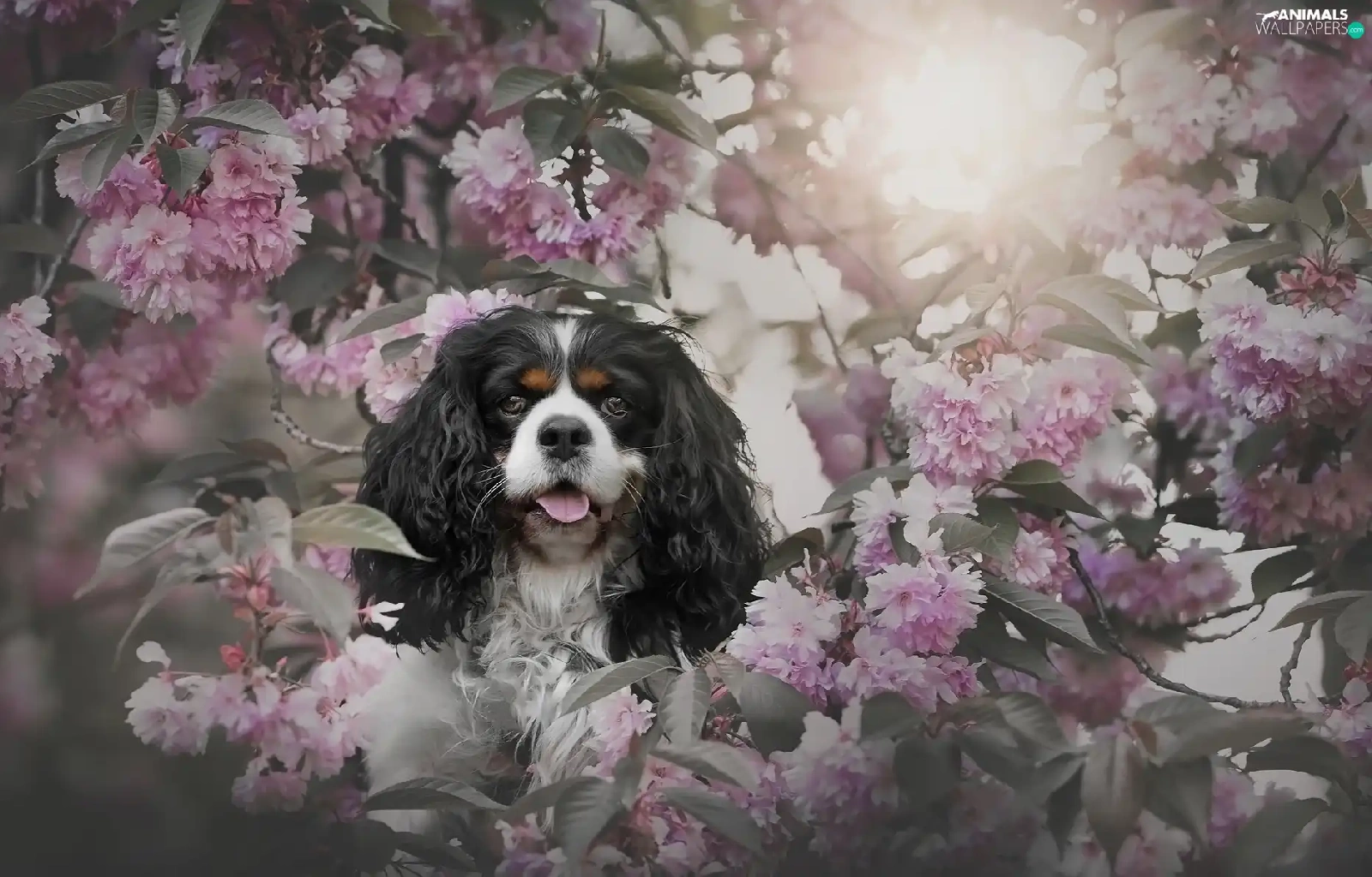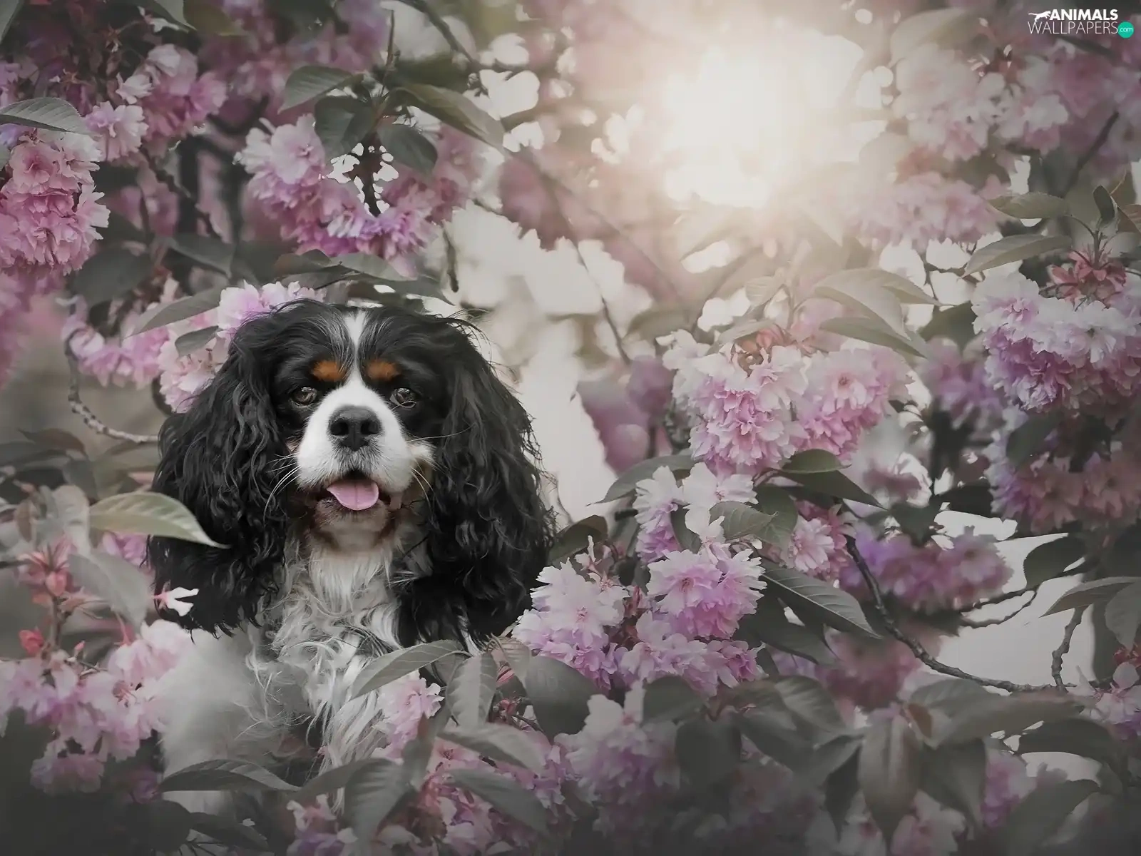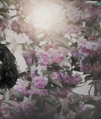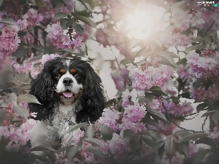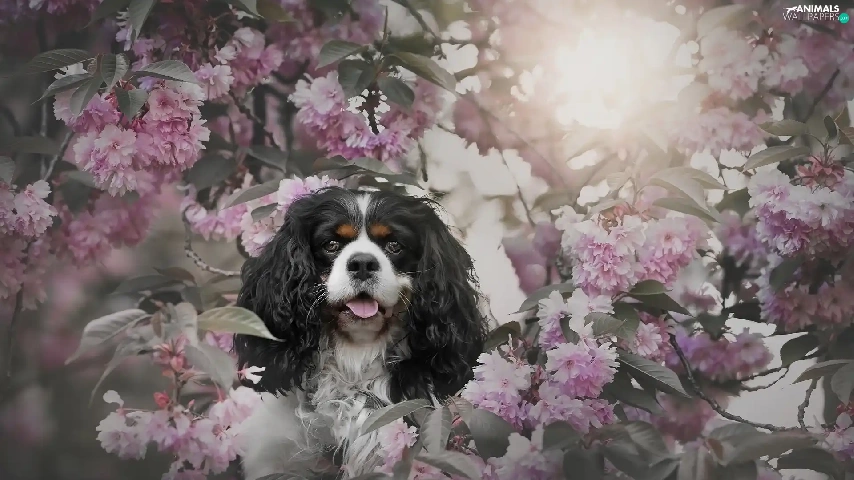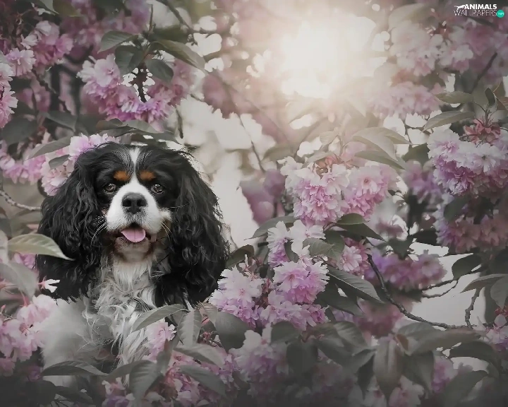 Flowers, Cavalier King Charles spaniel, cherry, Pink, dog, Fruit Tree, Twigs