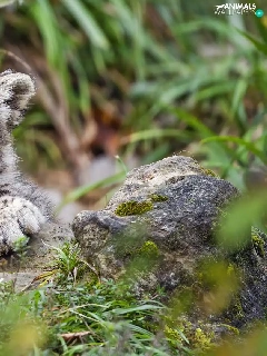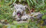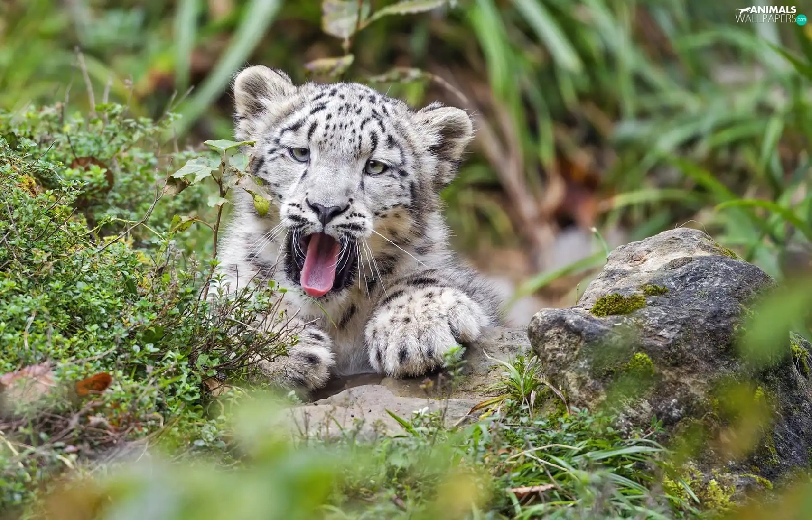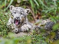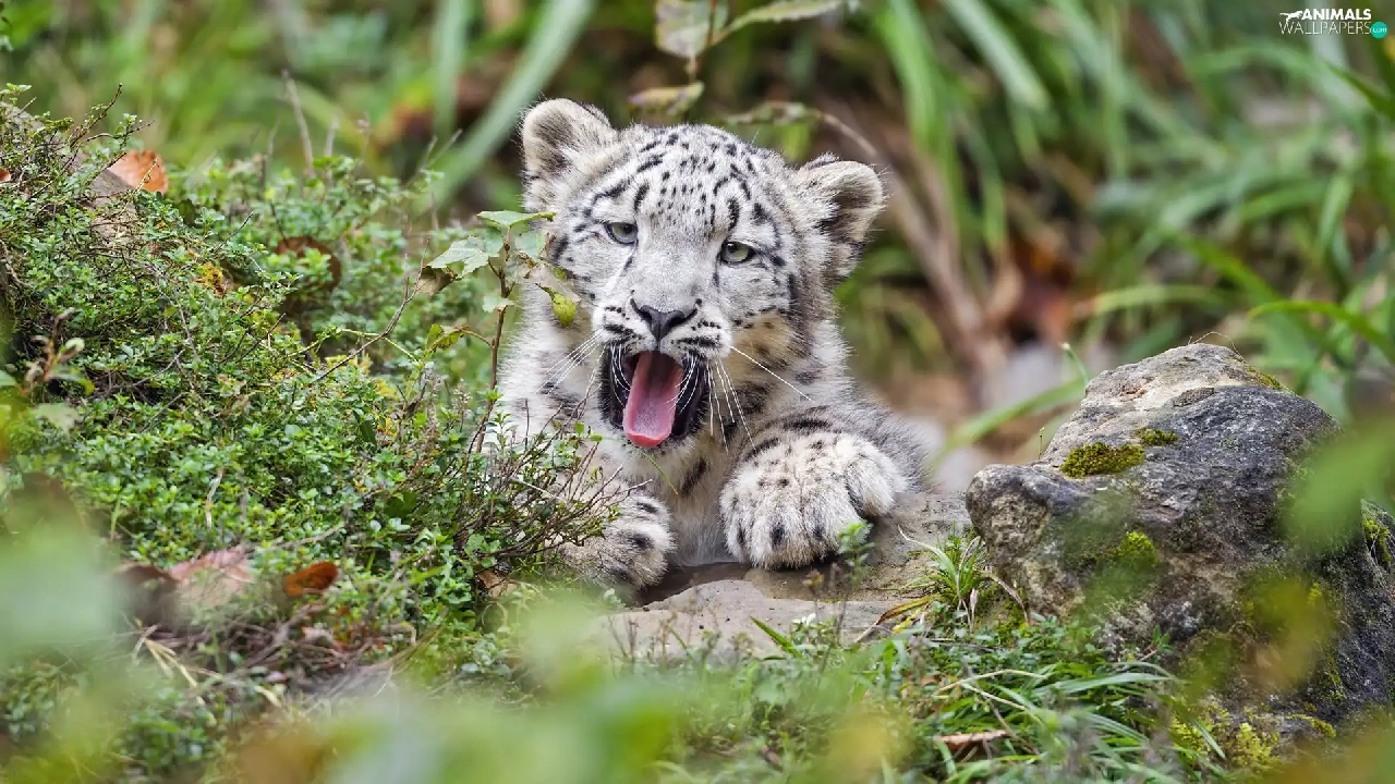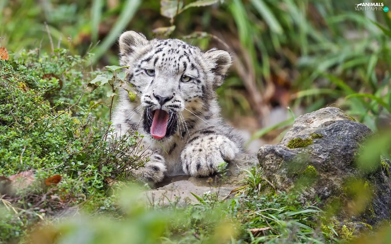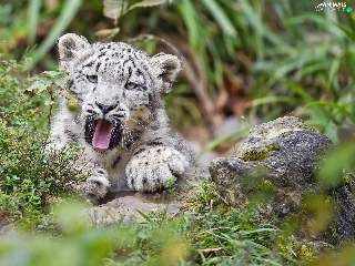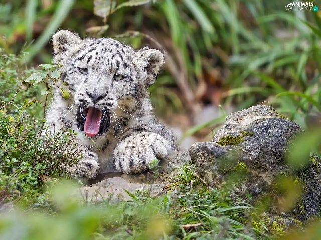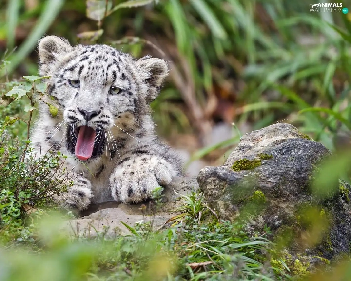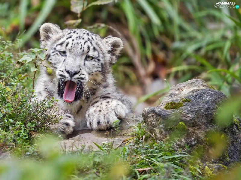 yawning, Plants, Rocks, snow leopard