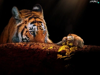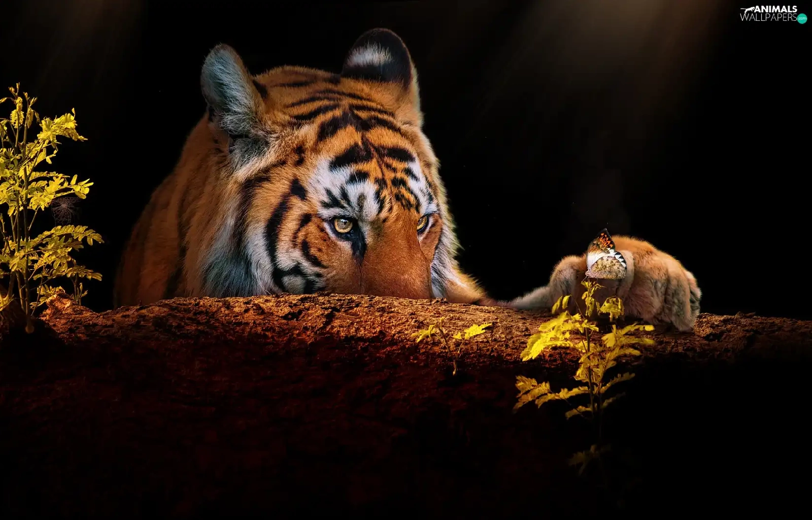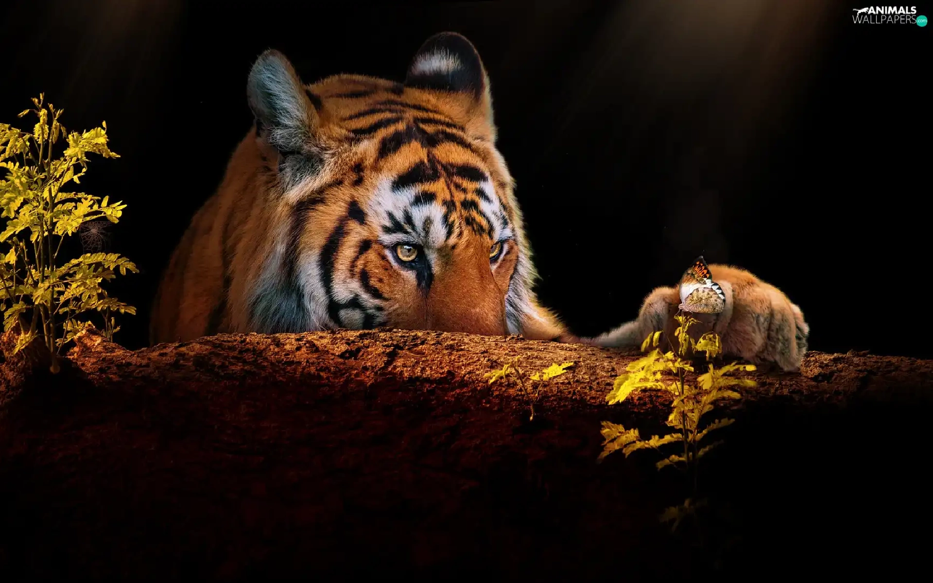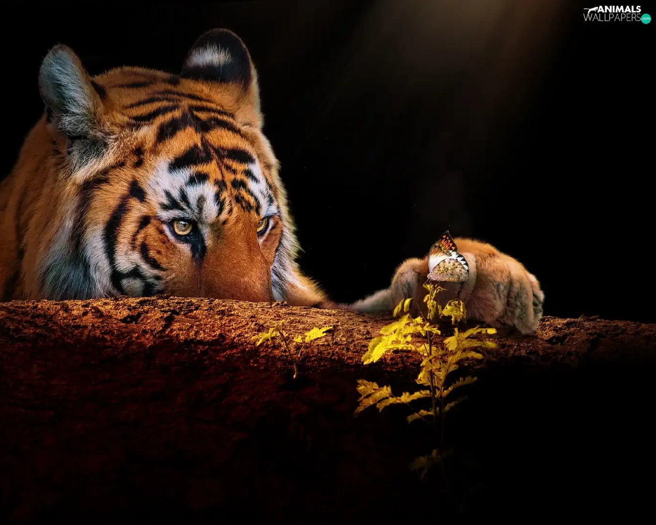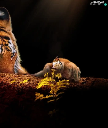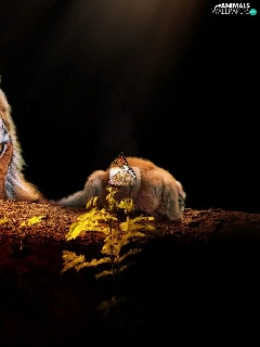 trees, tiger, butterfly, Plants, paw, snag