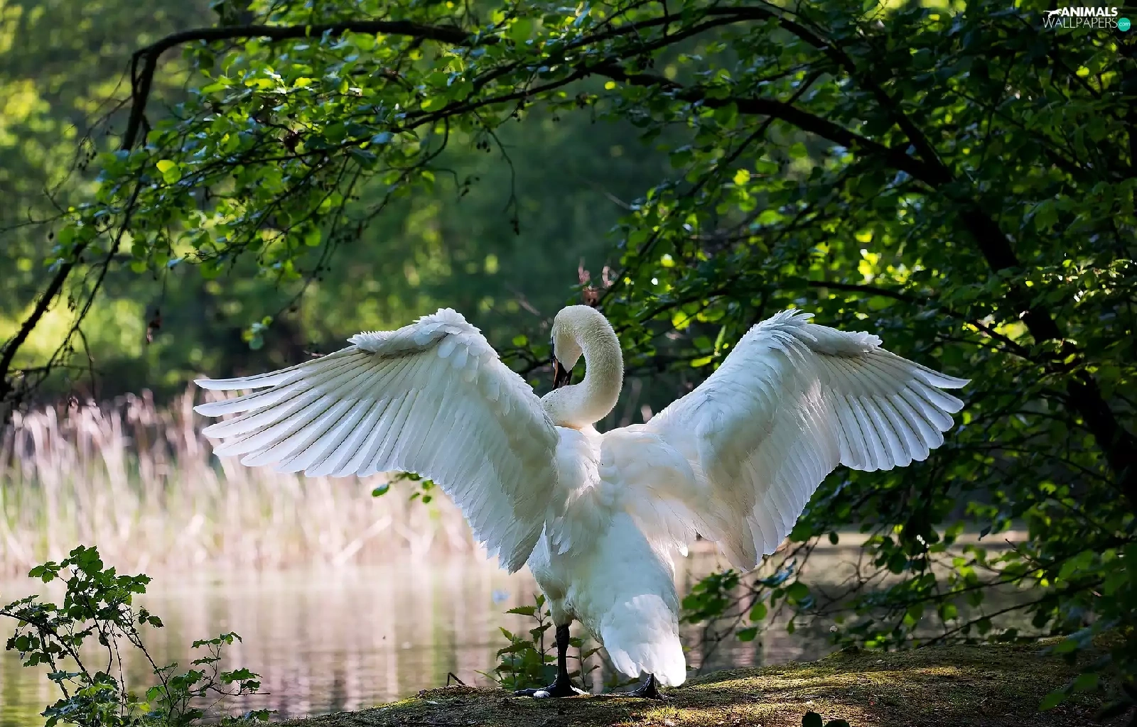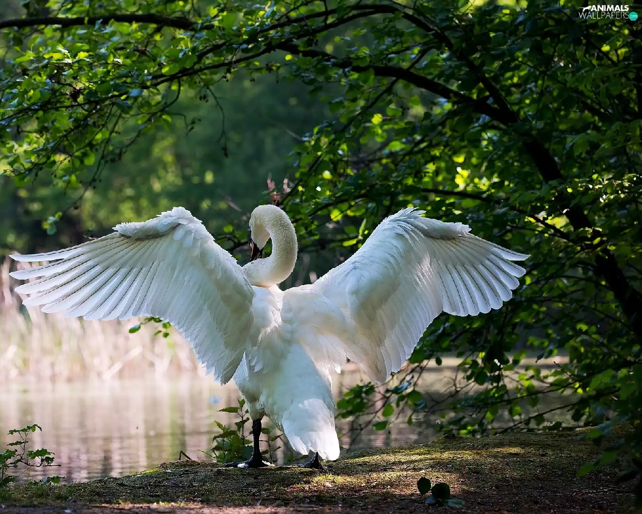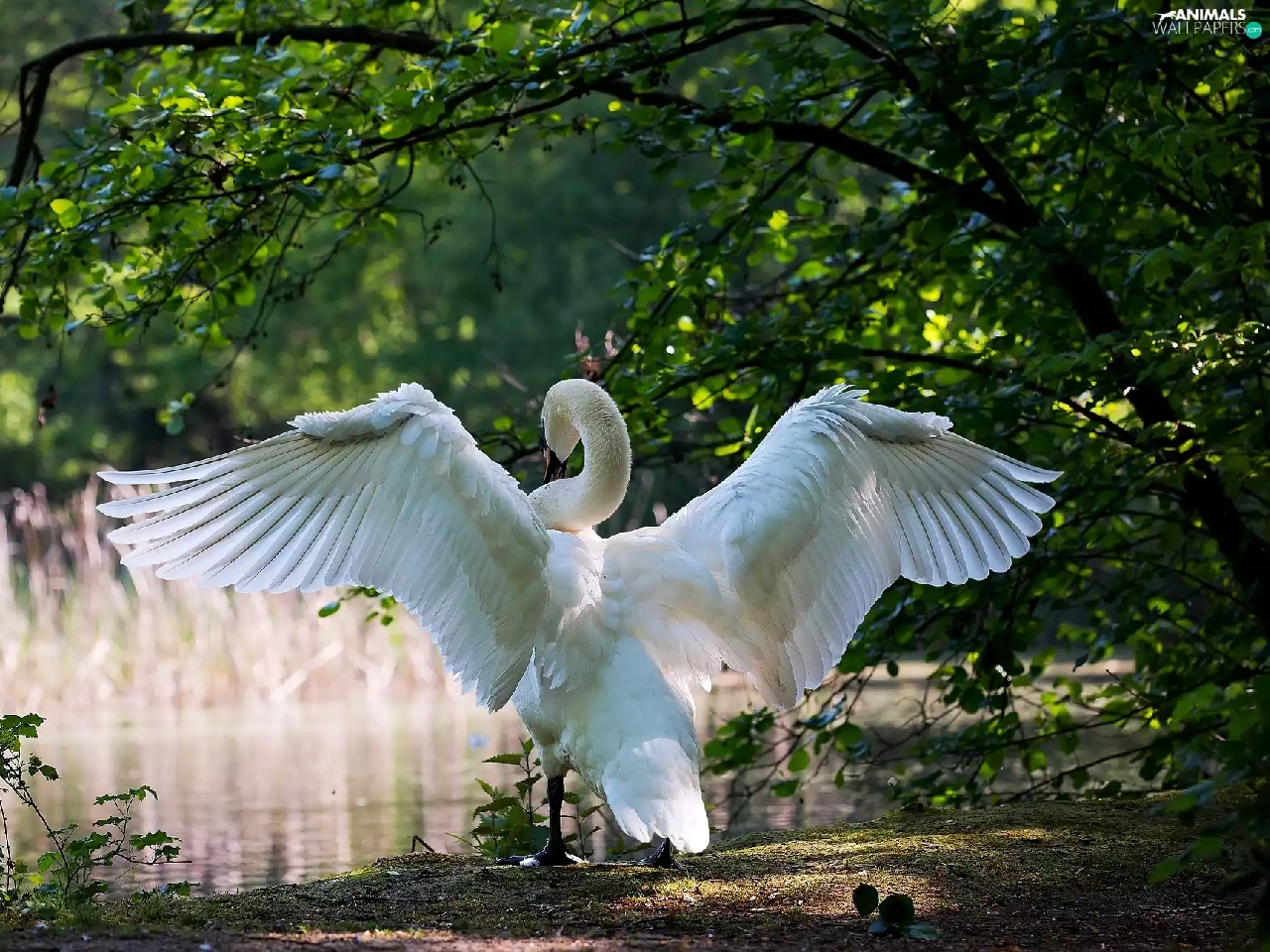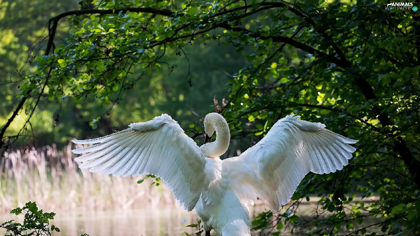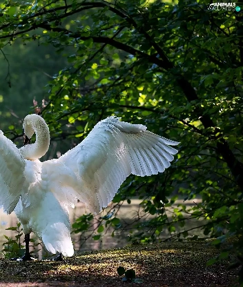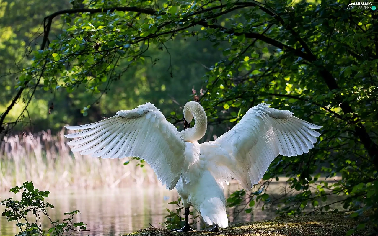 trees, viewes, Park, Pond - car, Swans