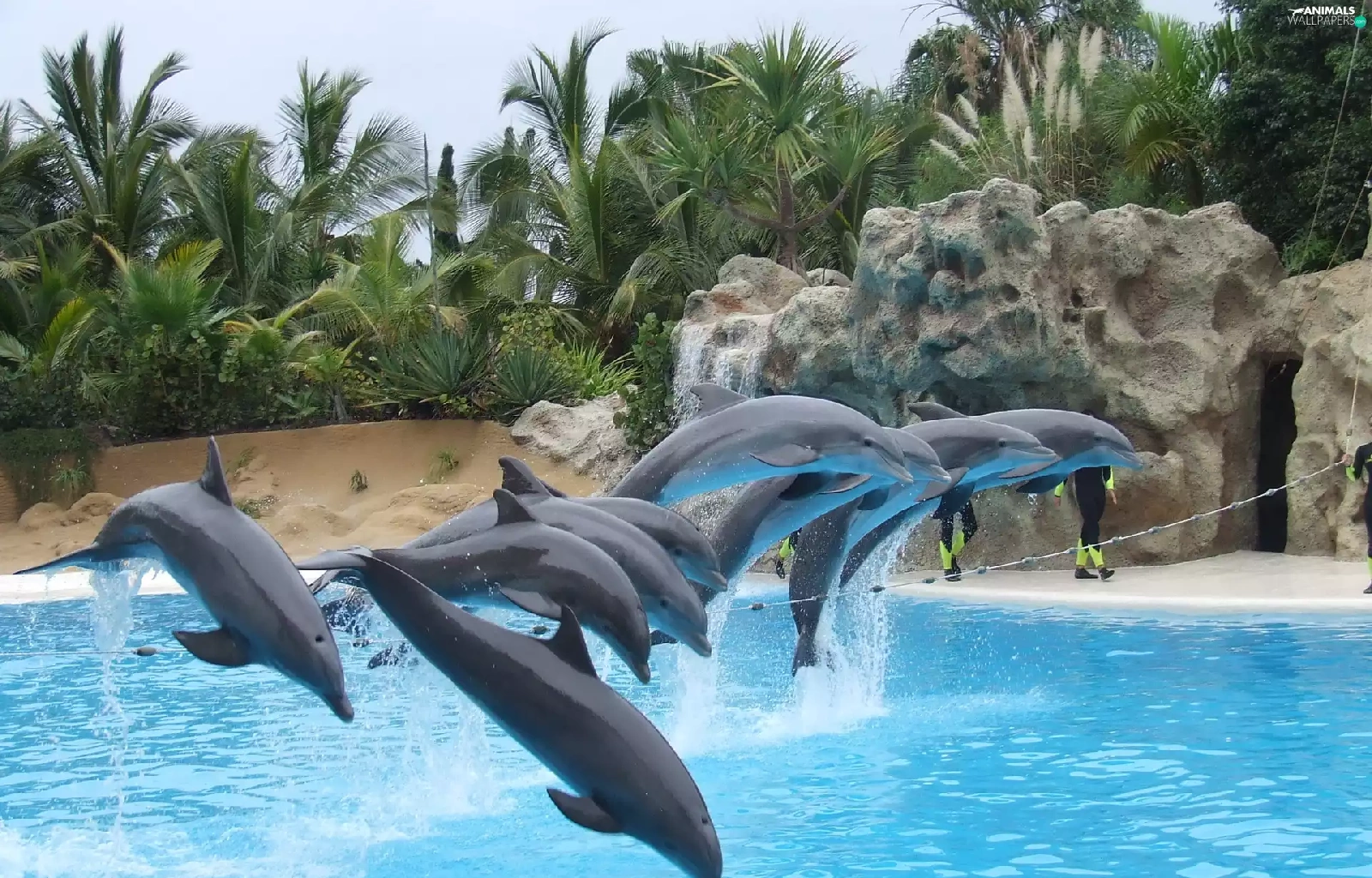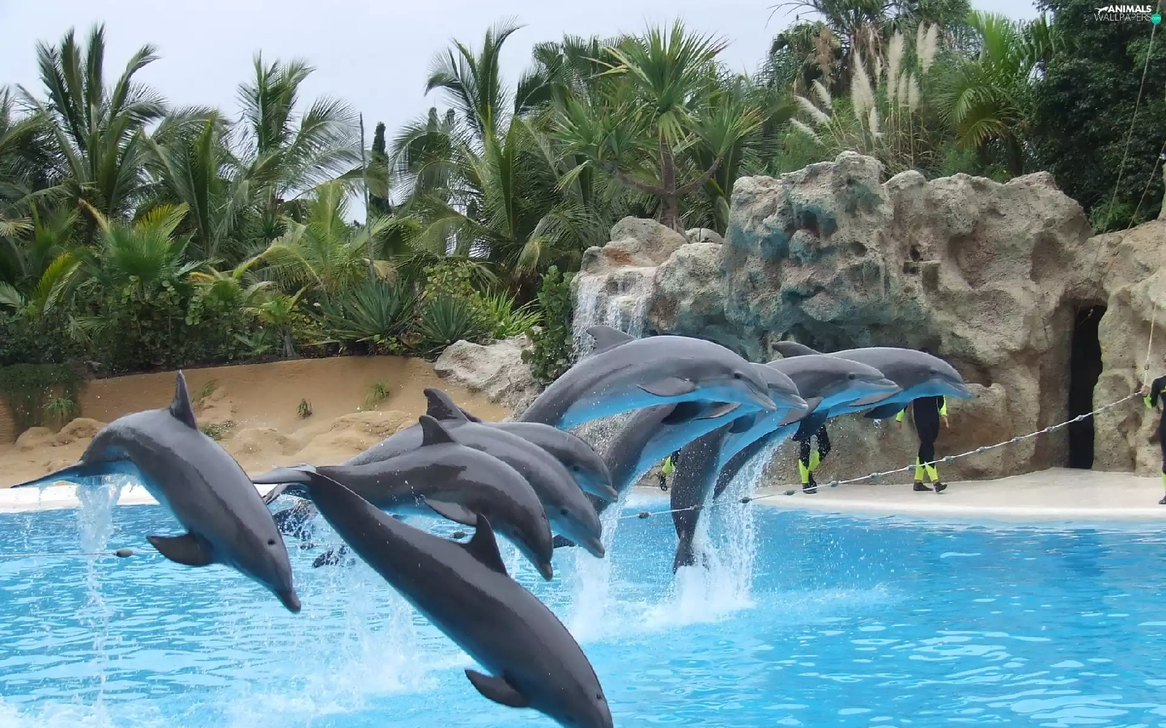 dolphins, rocks, Palms, Pool