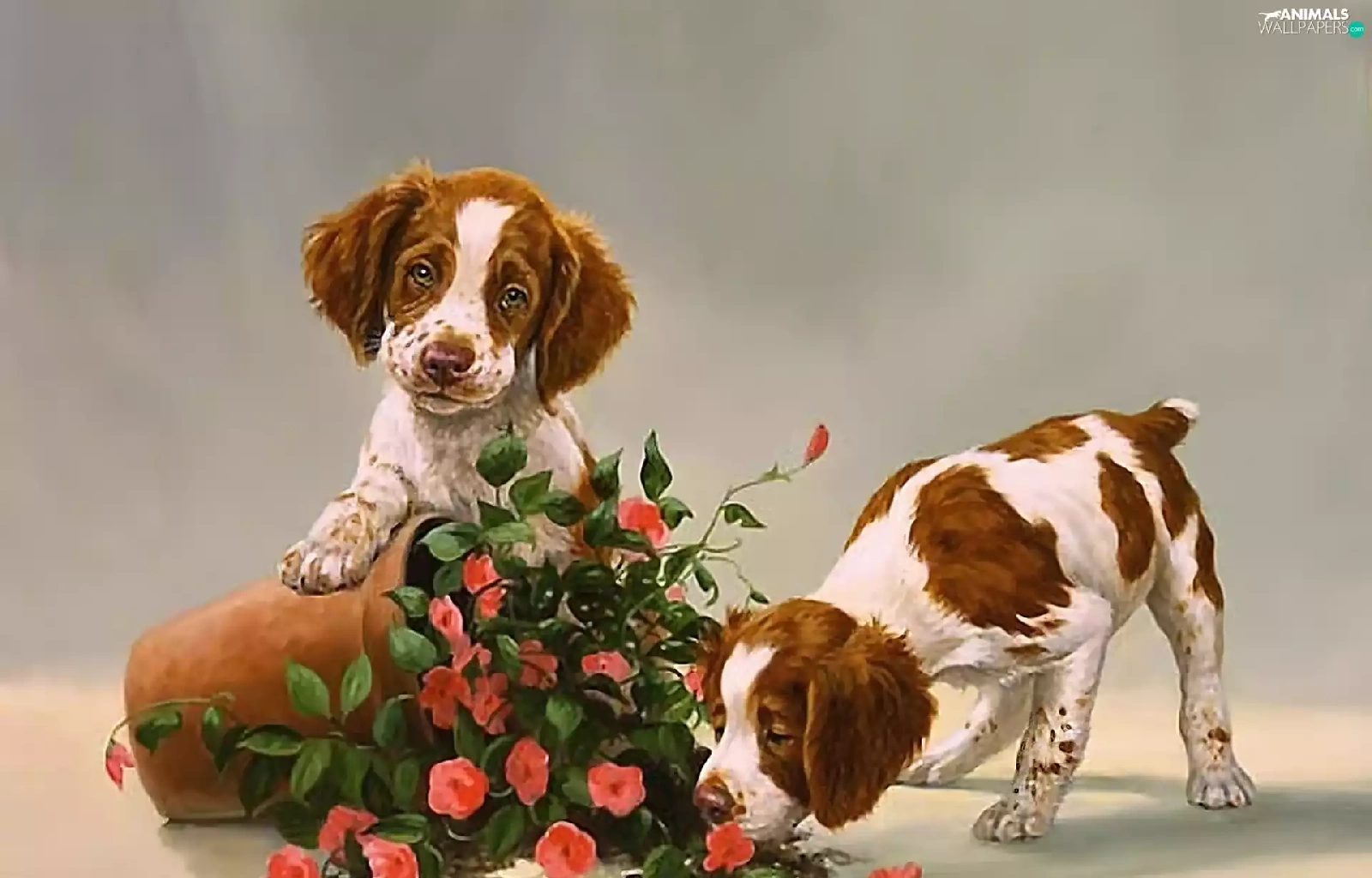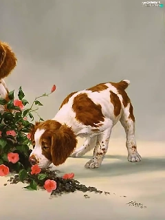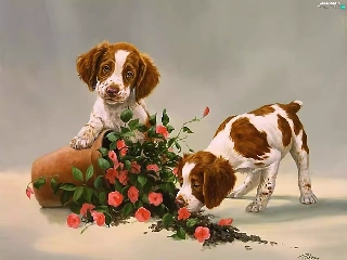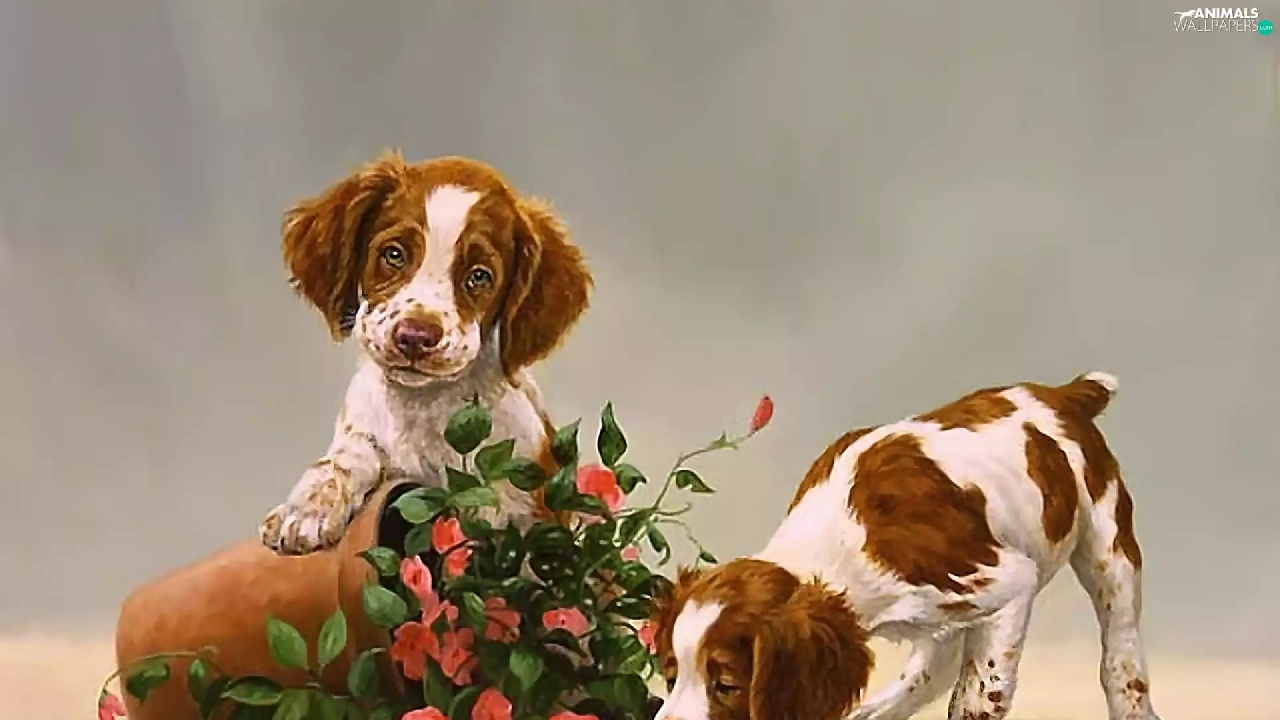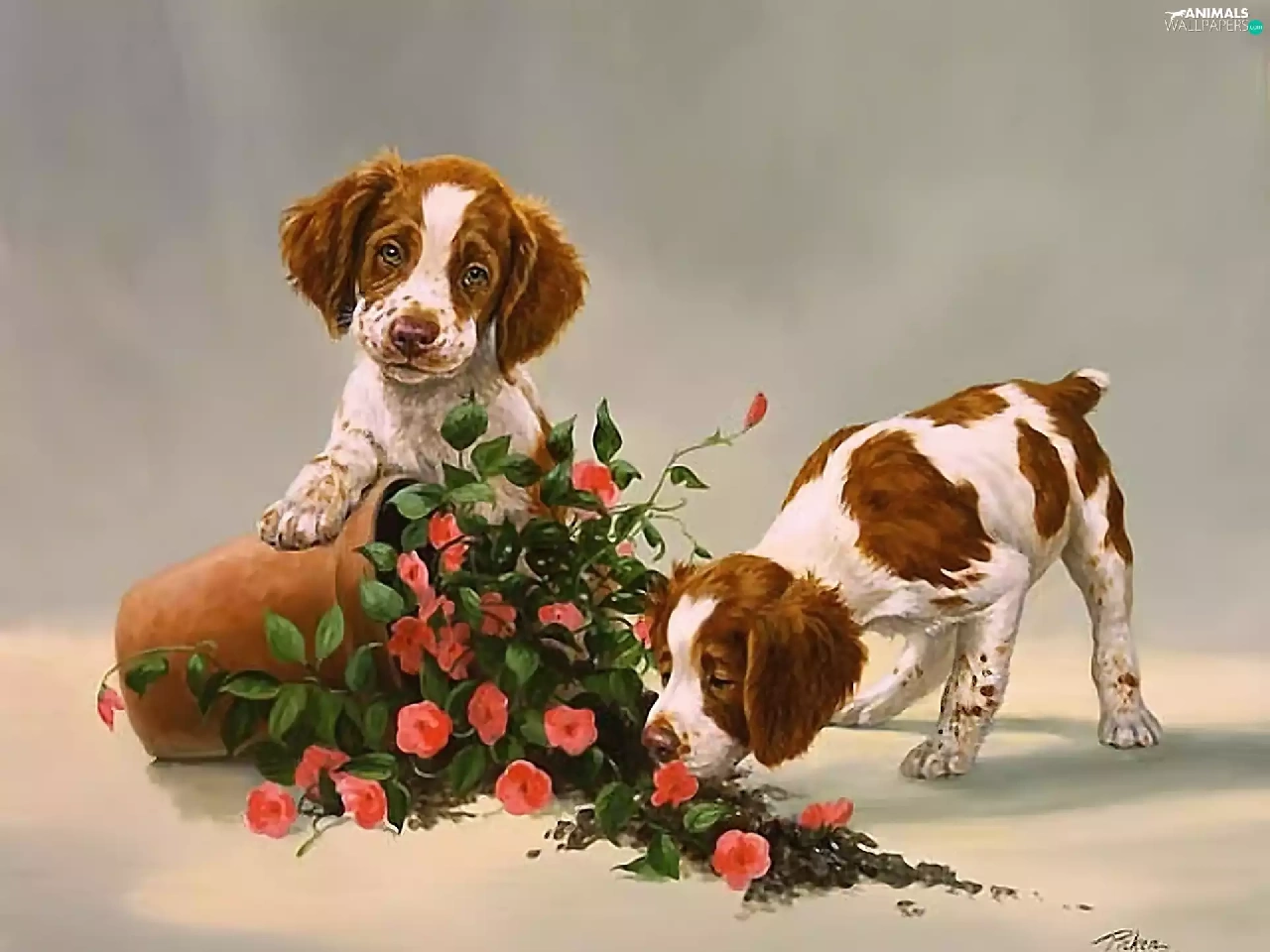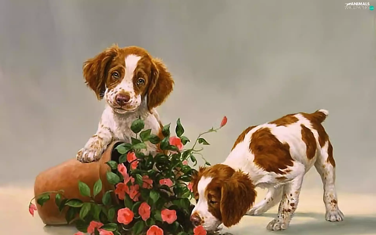 puppies, Two cars, pot, Flowers, overturned, Dogs