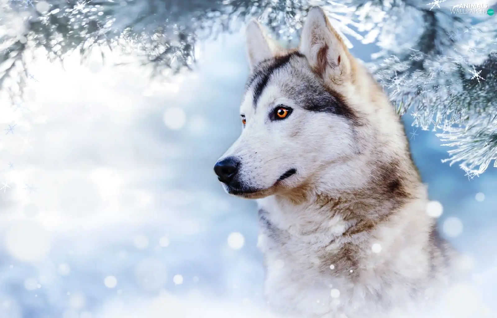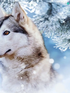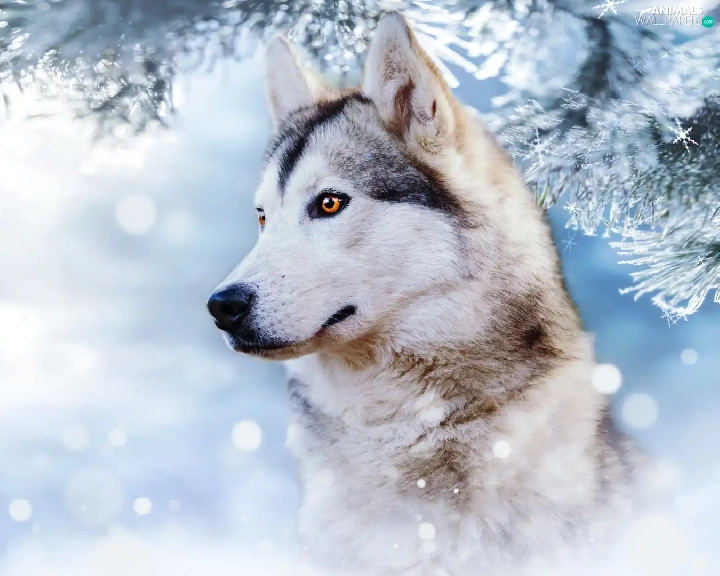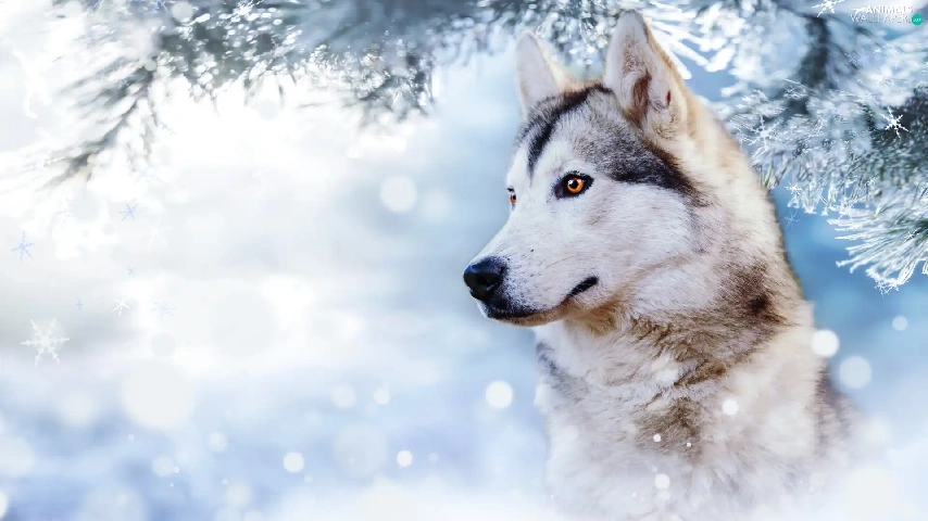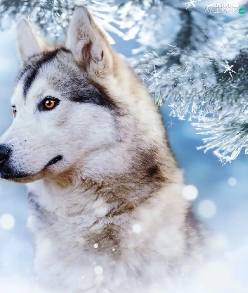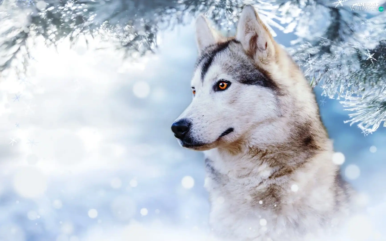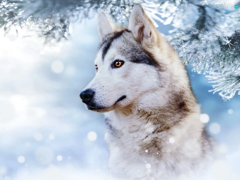 winter, dog, branch, profile, snow, Siberian Husky