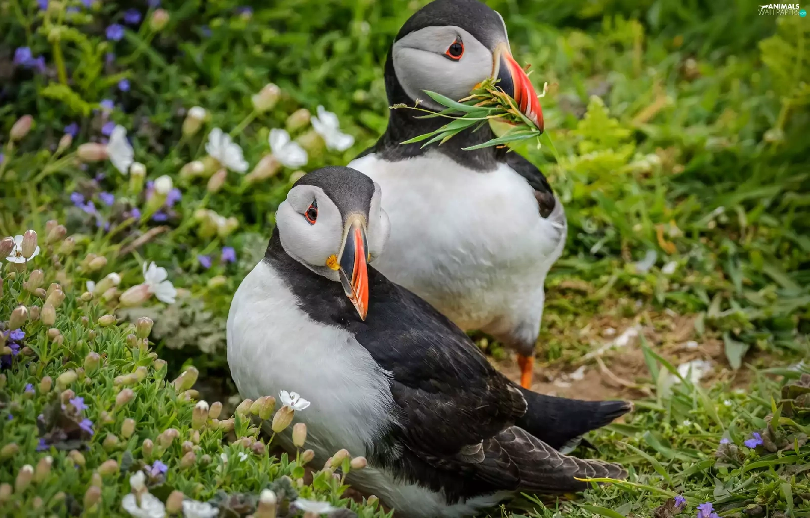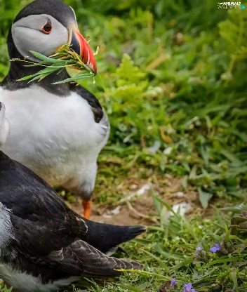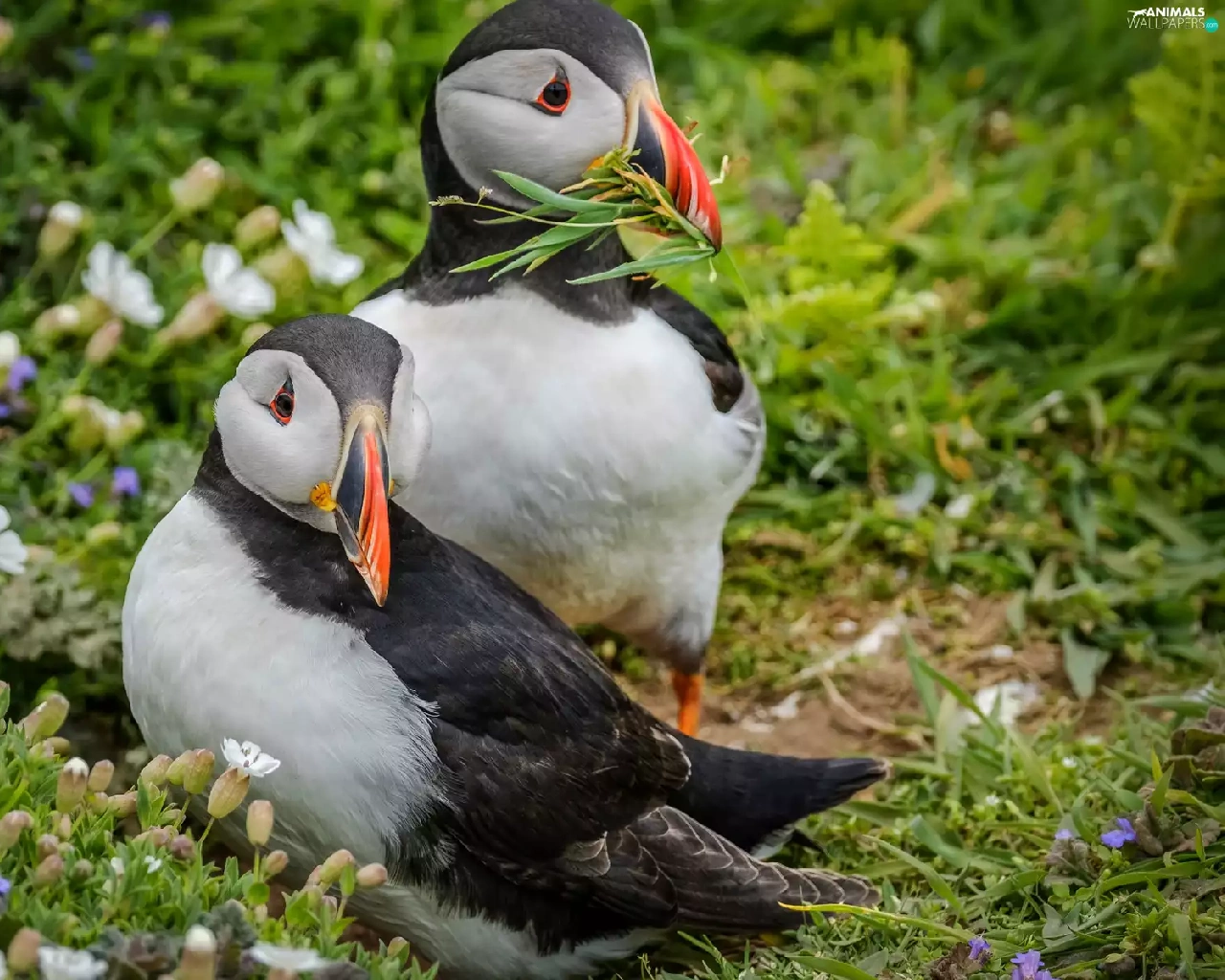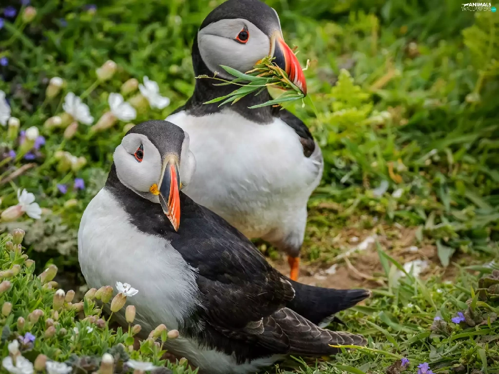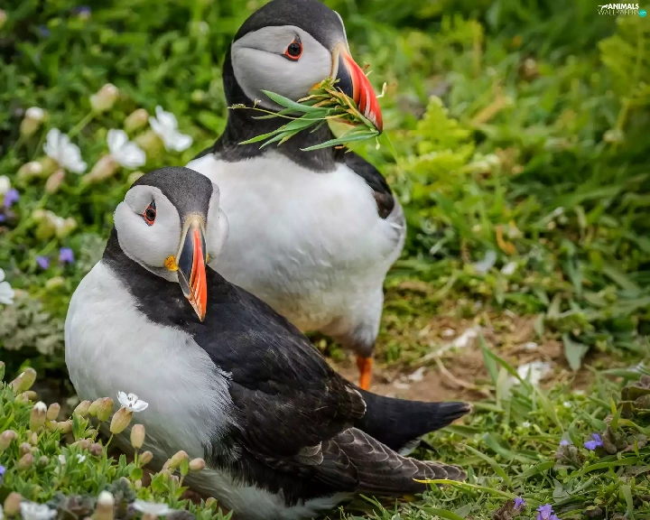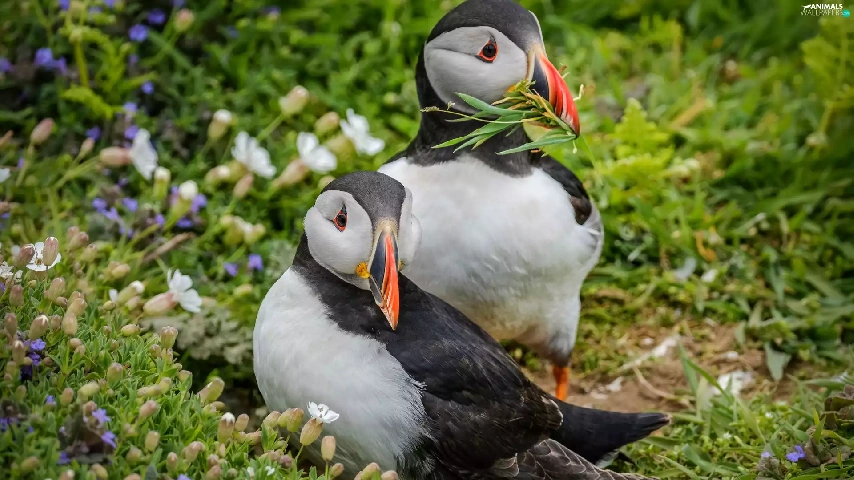 birds, Puffins, grass, Two cars
