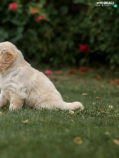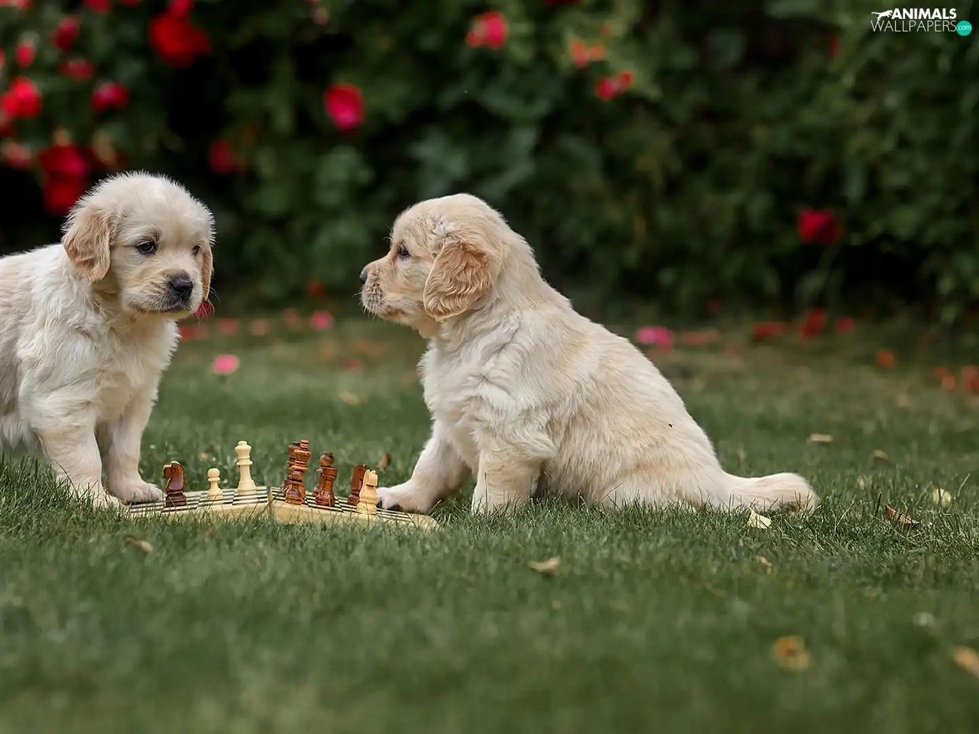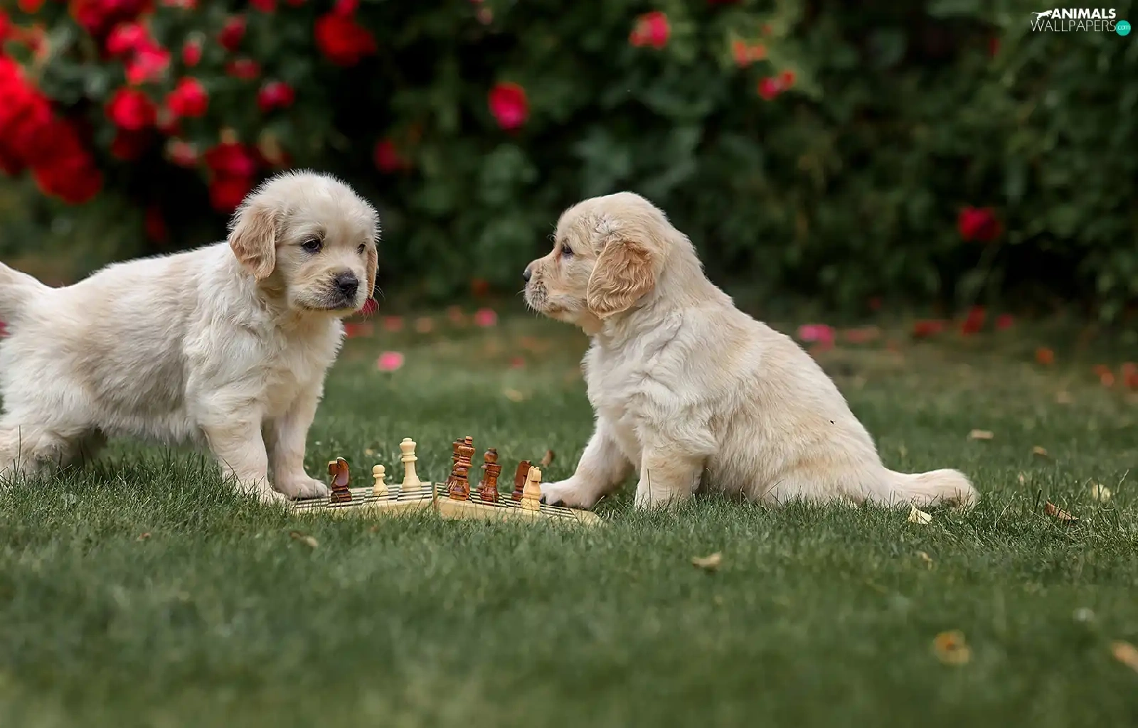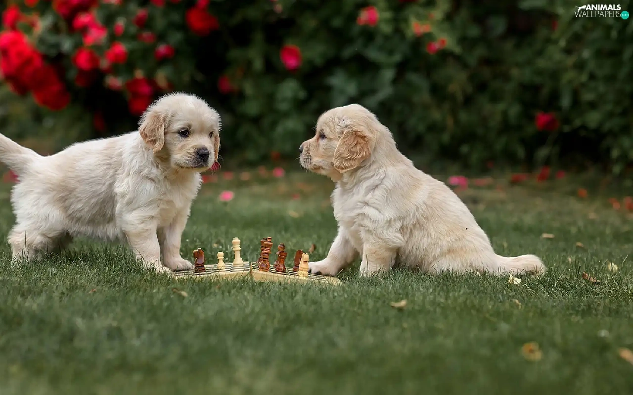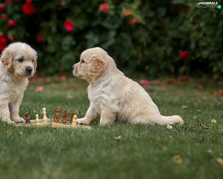 Dogs, Two cars, chess, grass, Golden Retrievery, puppies