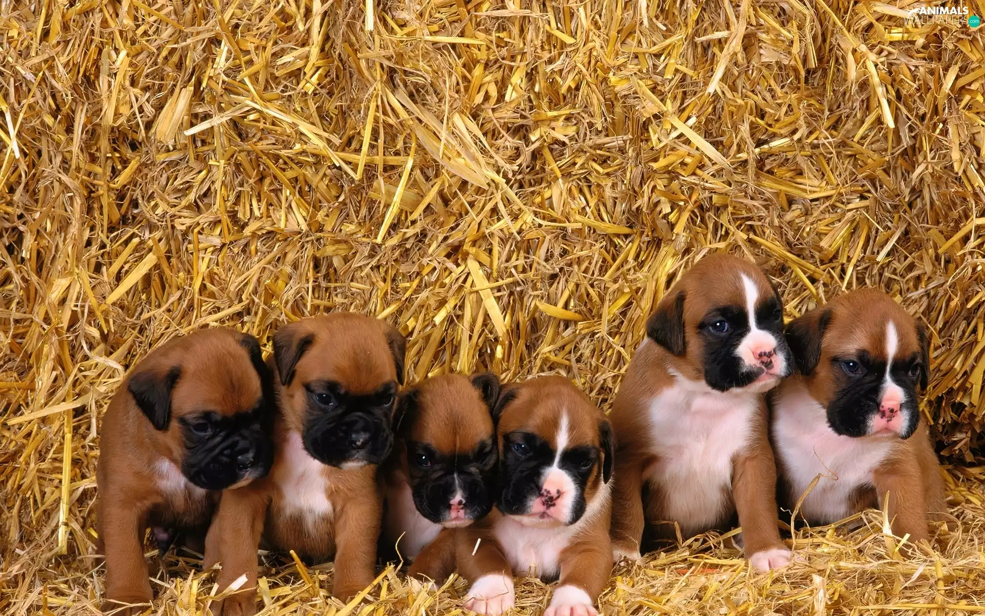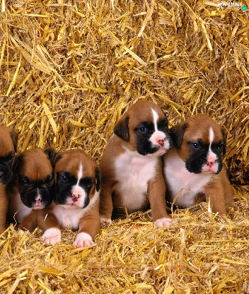 young, boxers, straw, puppies