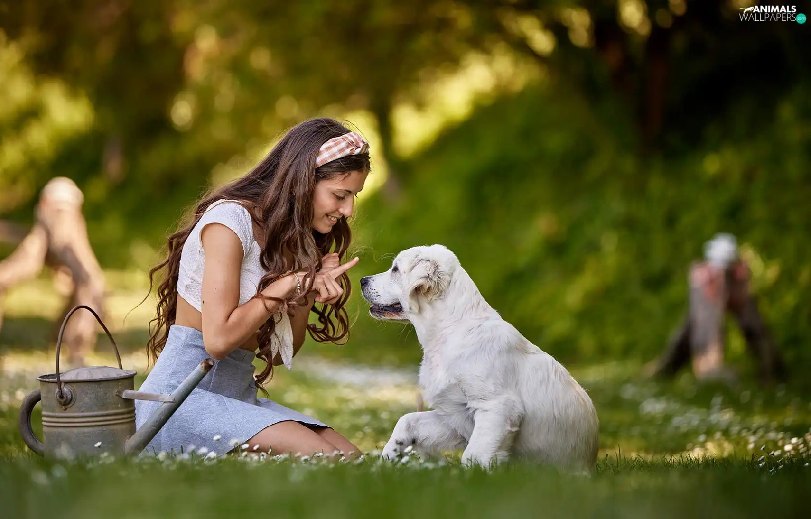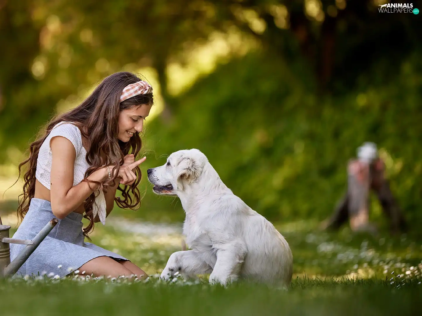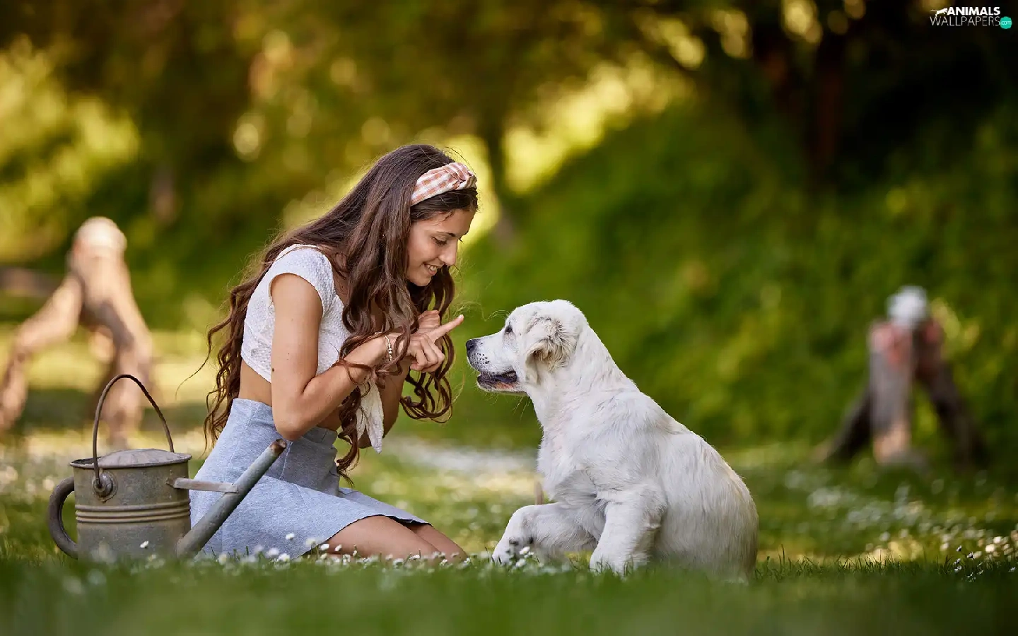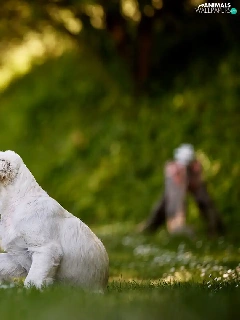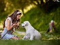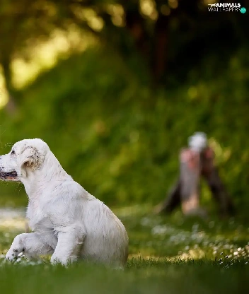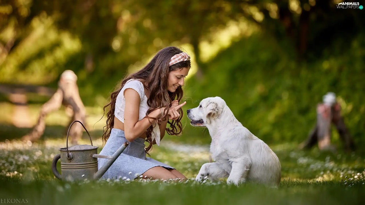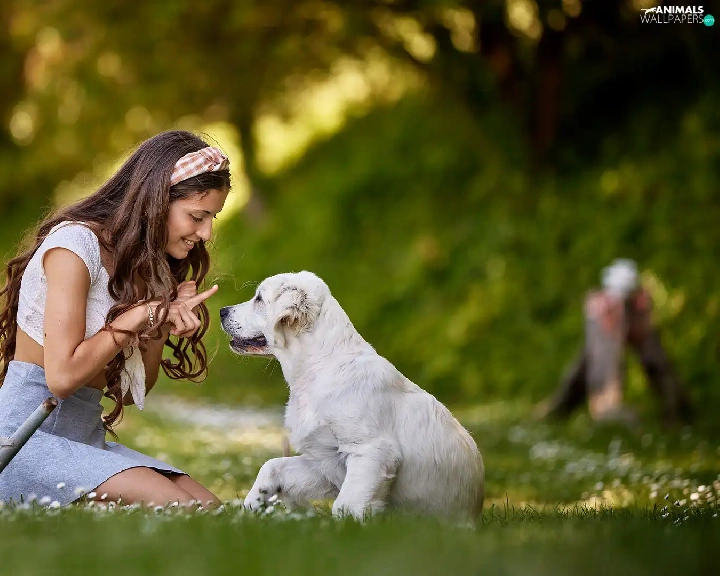 girl, Puppy, Golden Retriever, Meadow