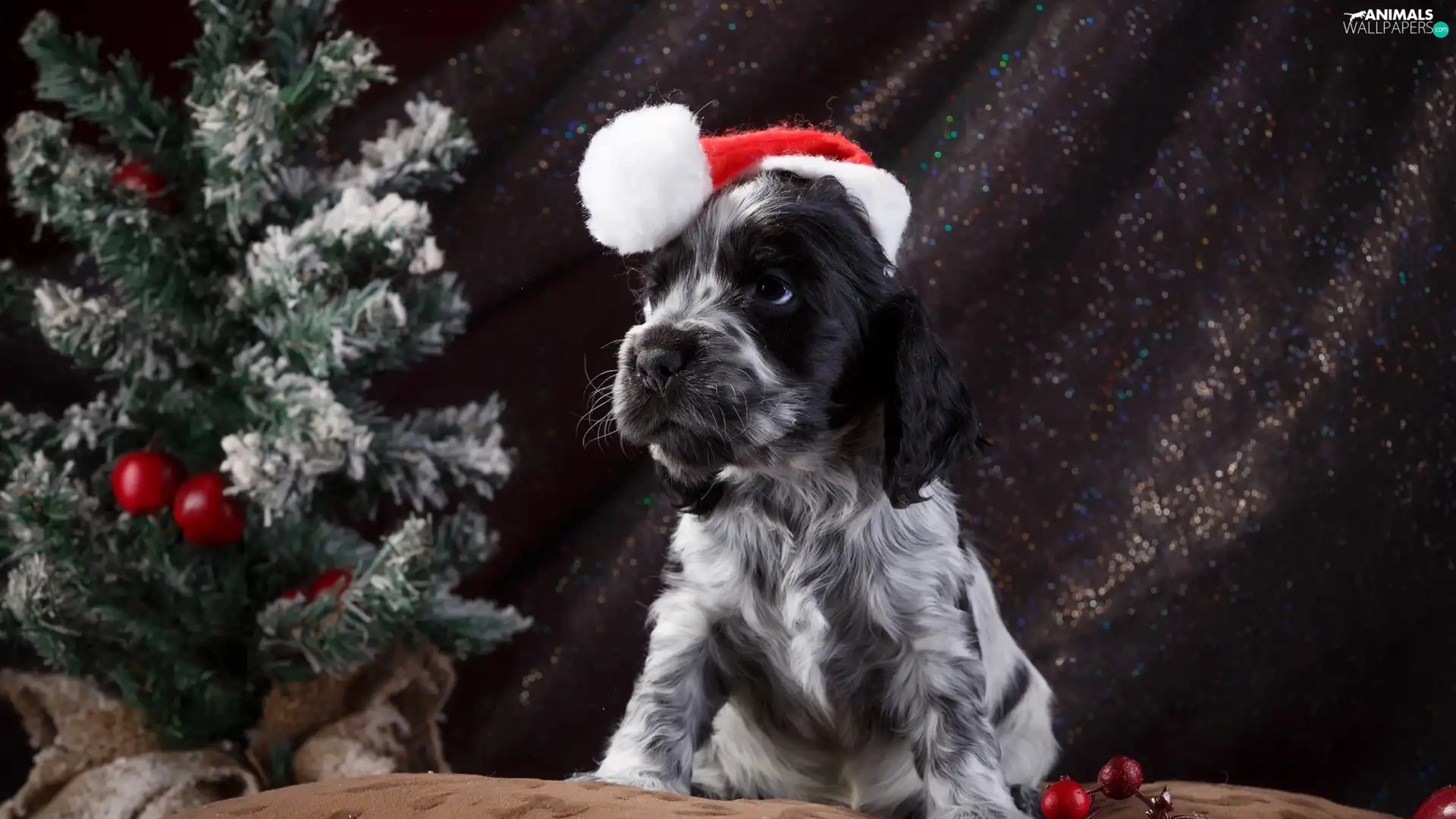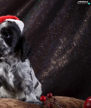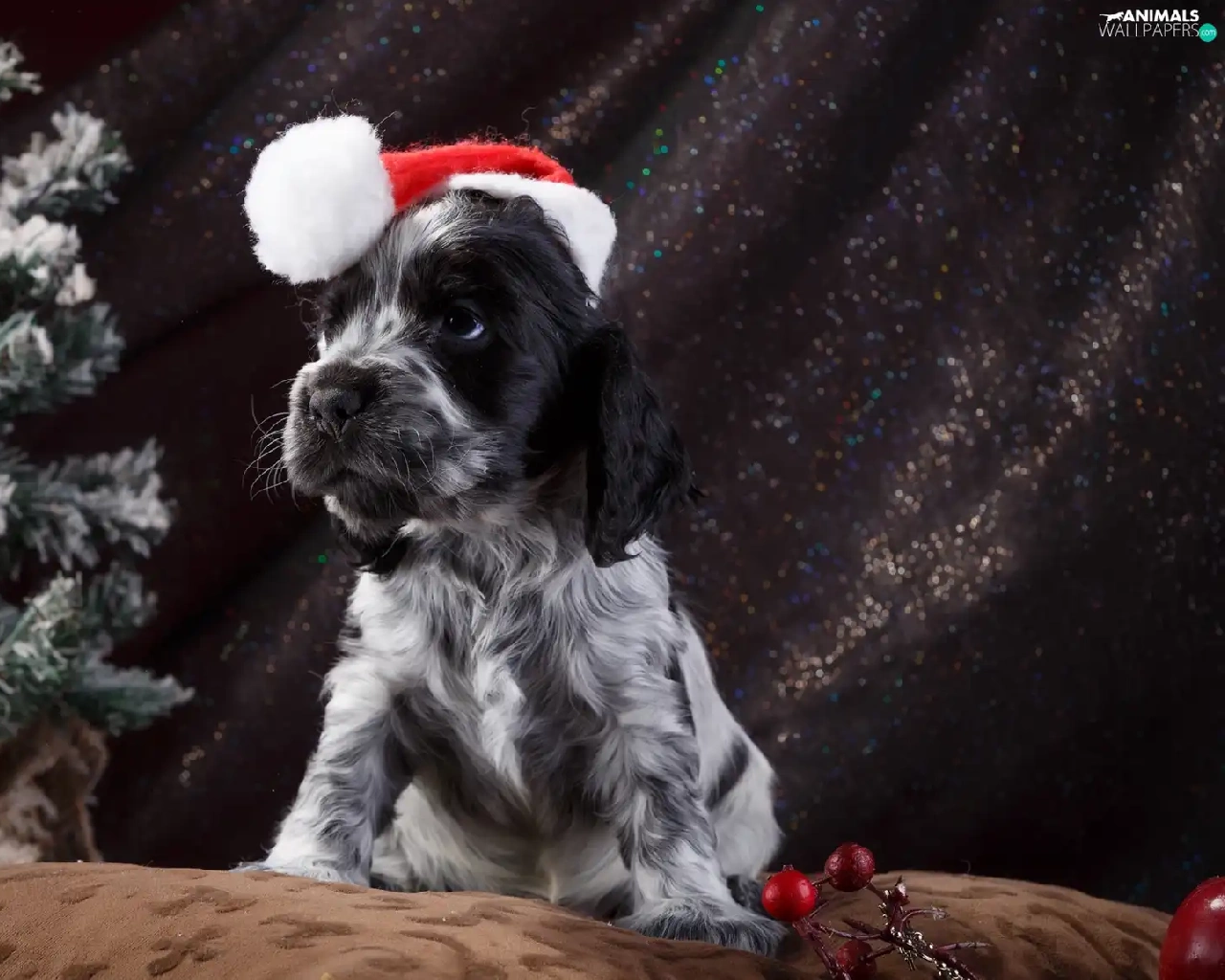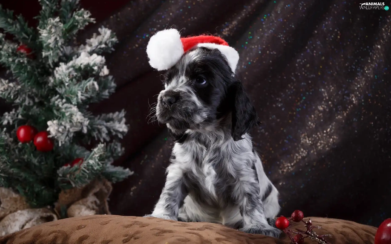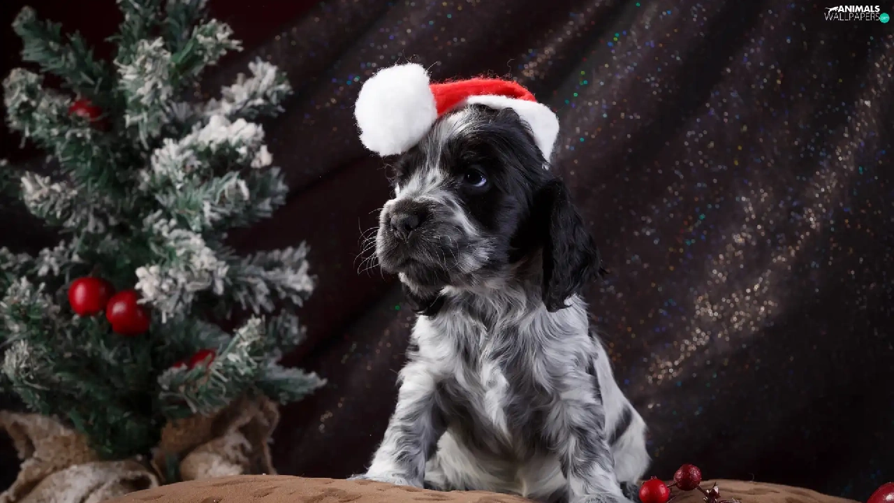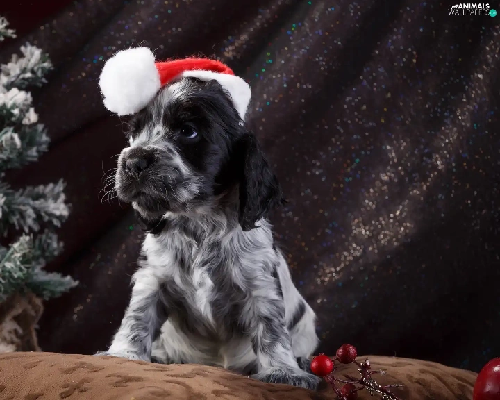 English Springer Spaniel, dog, Nicholas, christmas tree, Hat, Puppy