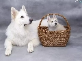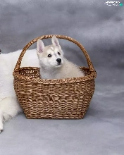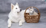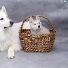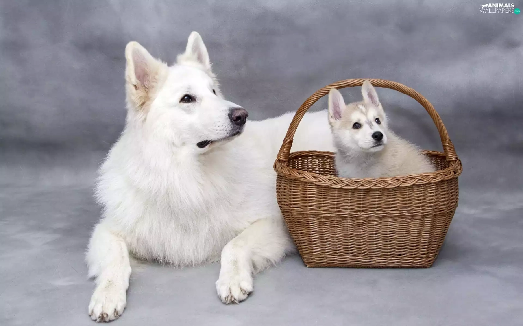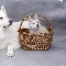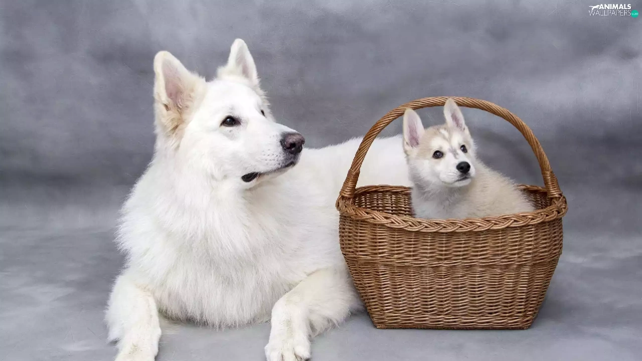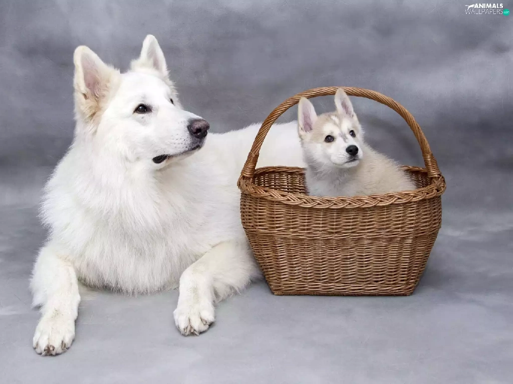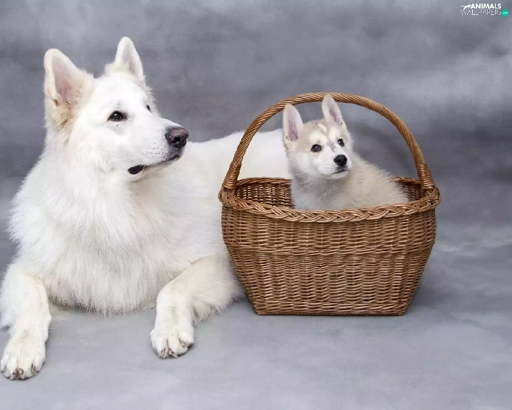 Puppy, dog, wicker, basket, Siberian Husky, White Swiss Shepherd