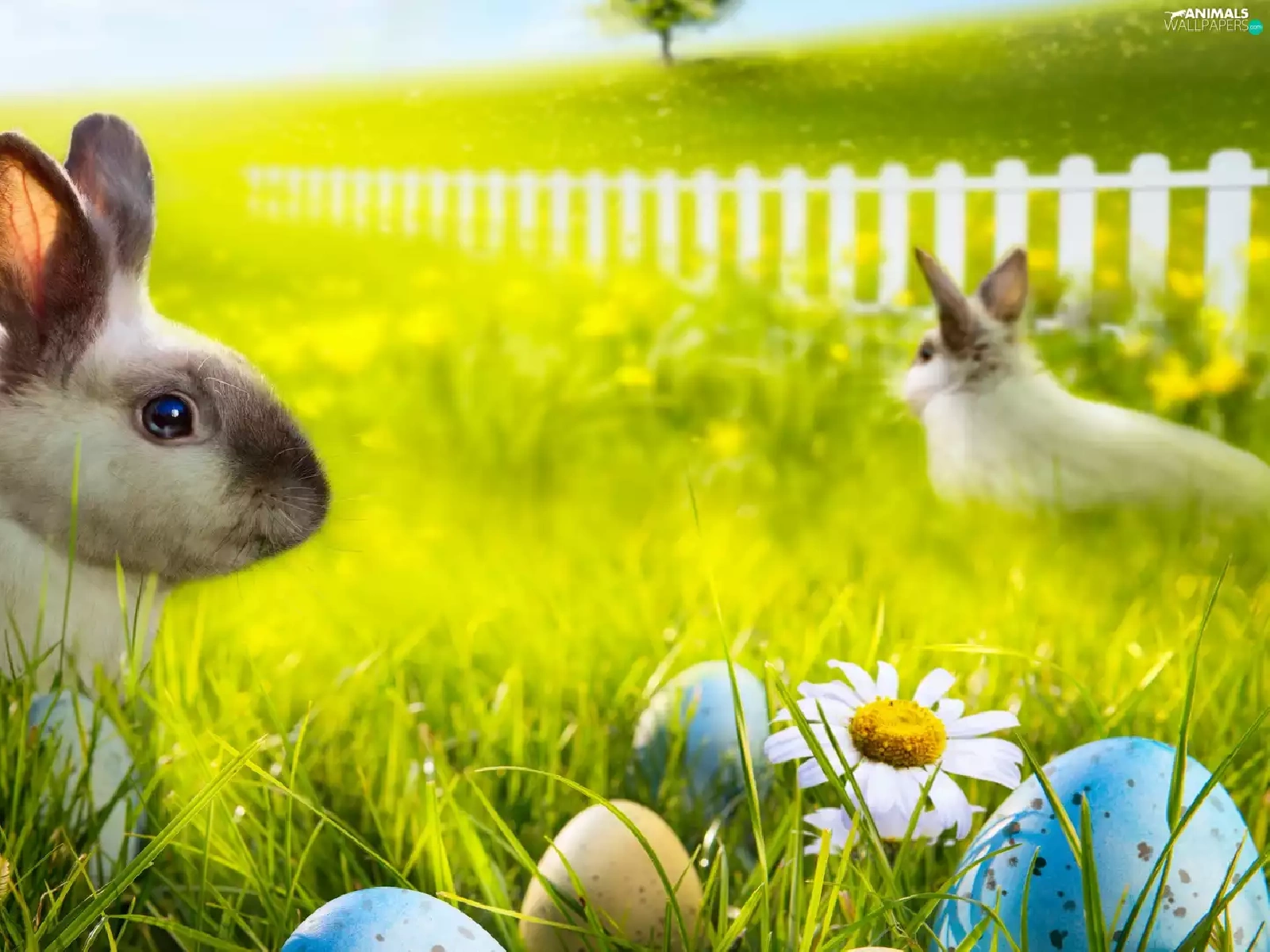 Easter, Meadow, eggs, Rabbits