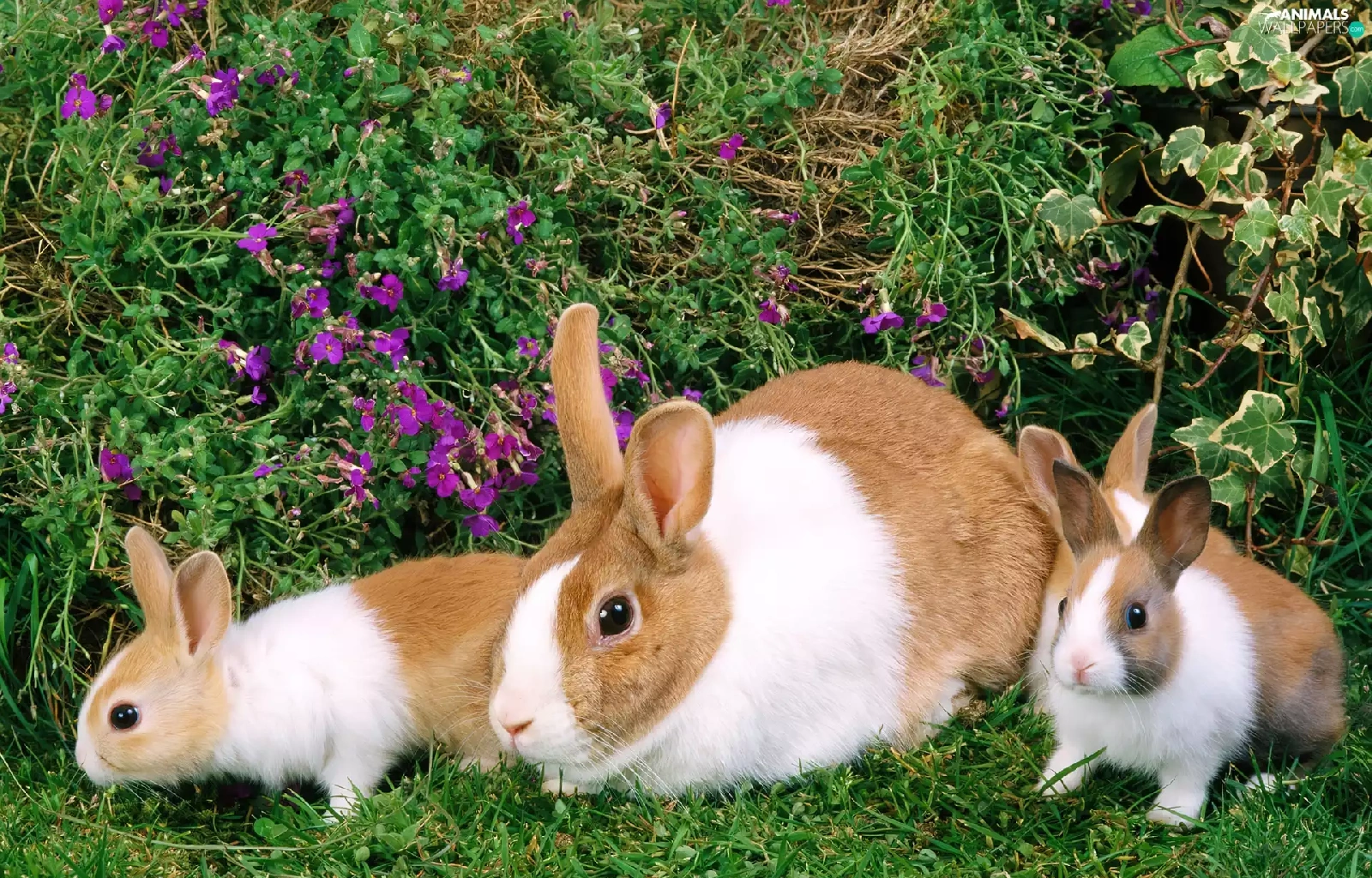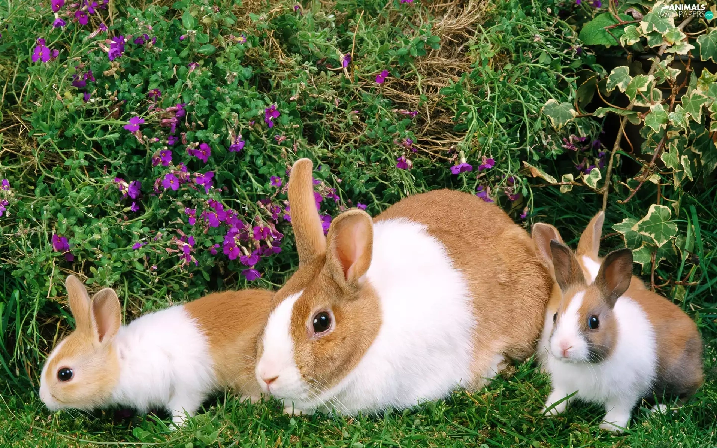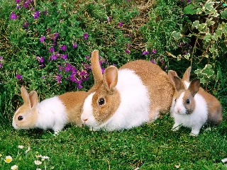 Three, grass, Flowers, Rabbits