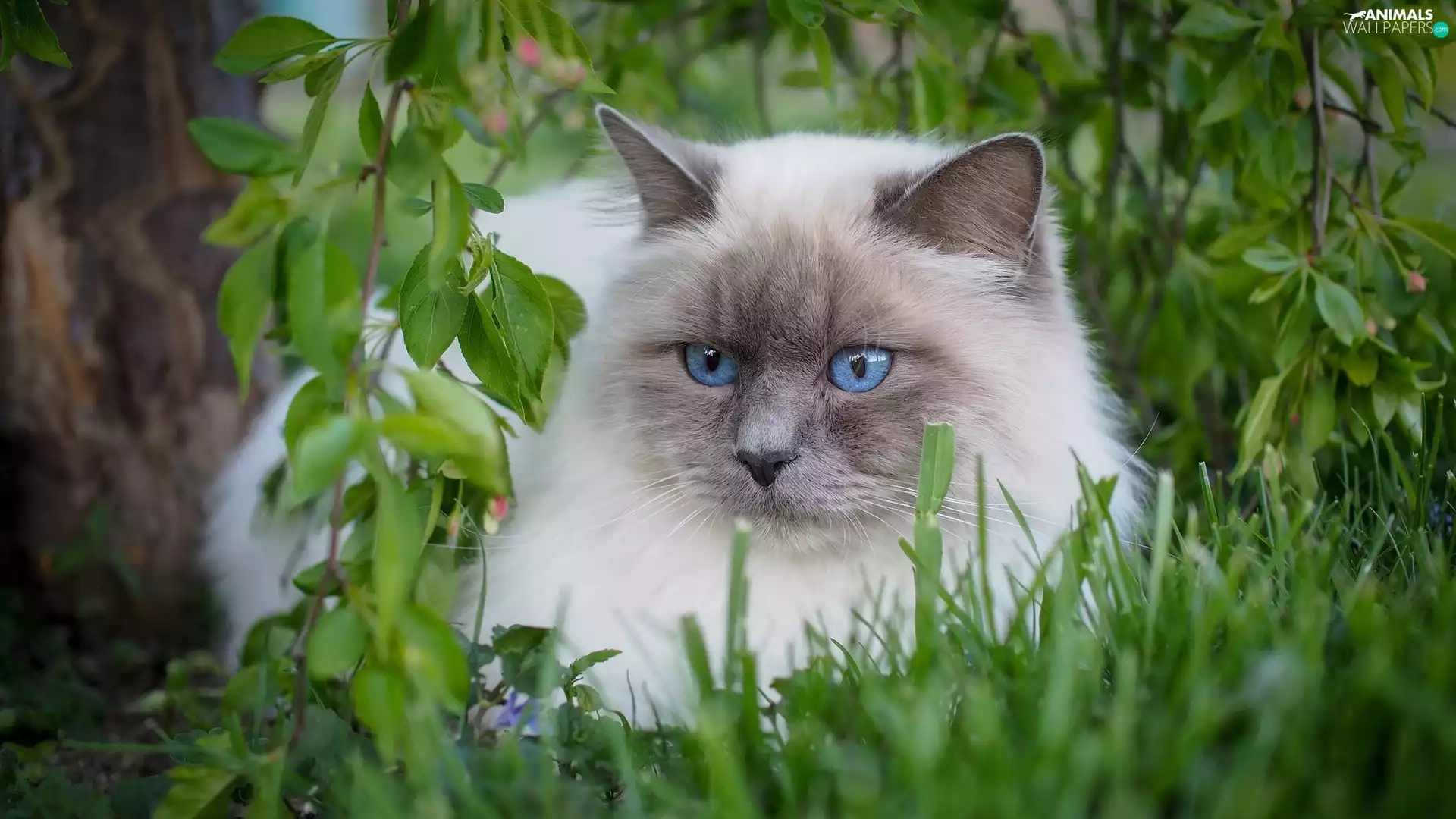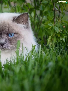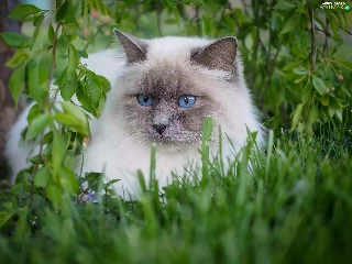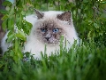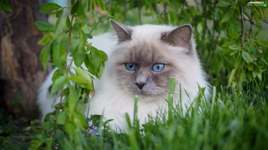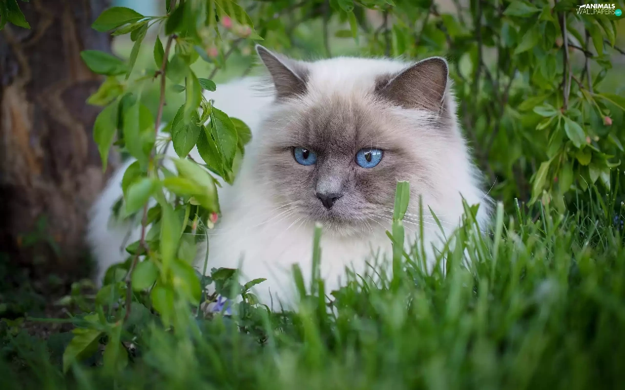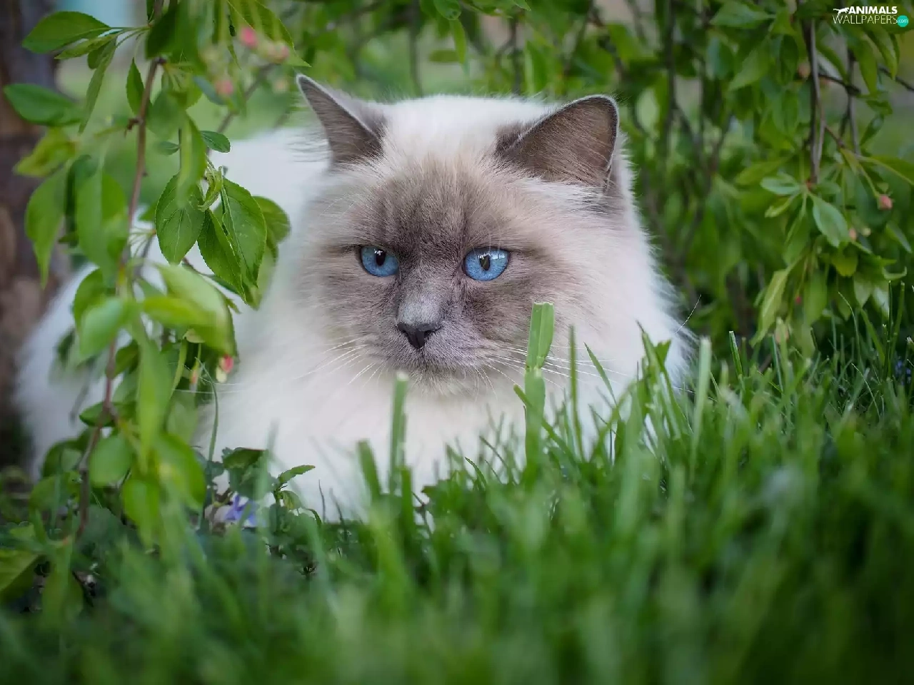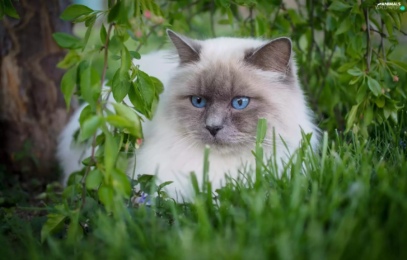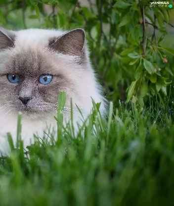 Ragdoll Cat, fluffy, Eyes, grass, Blue, white and gray