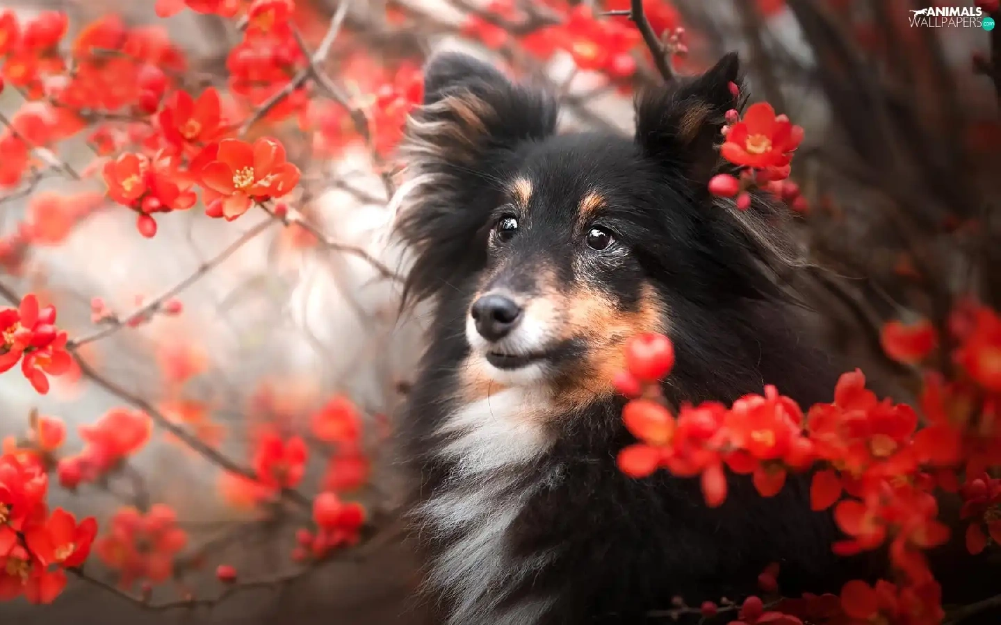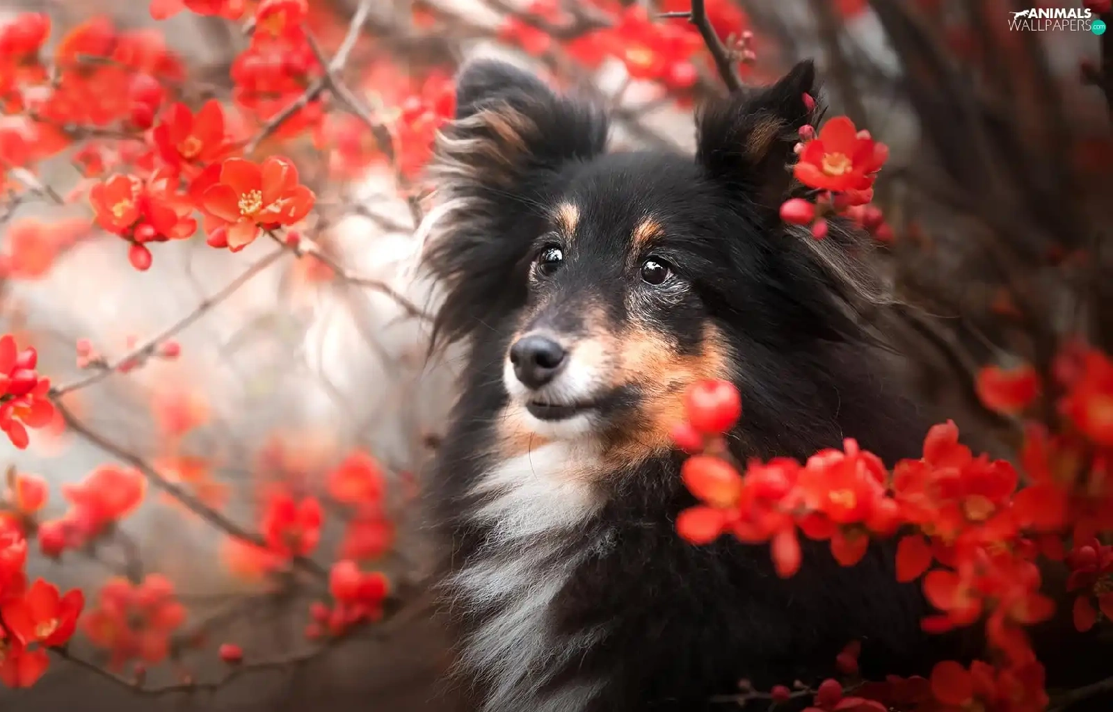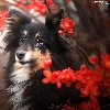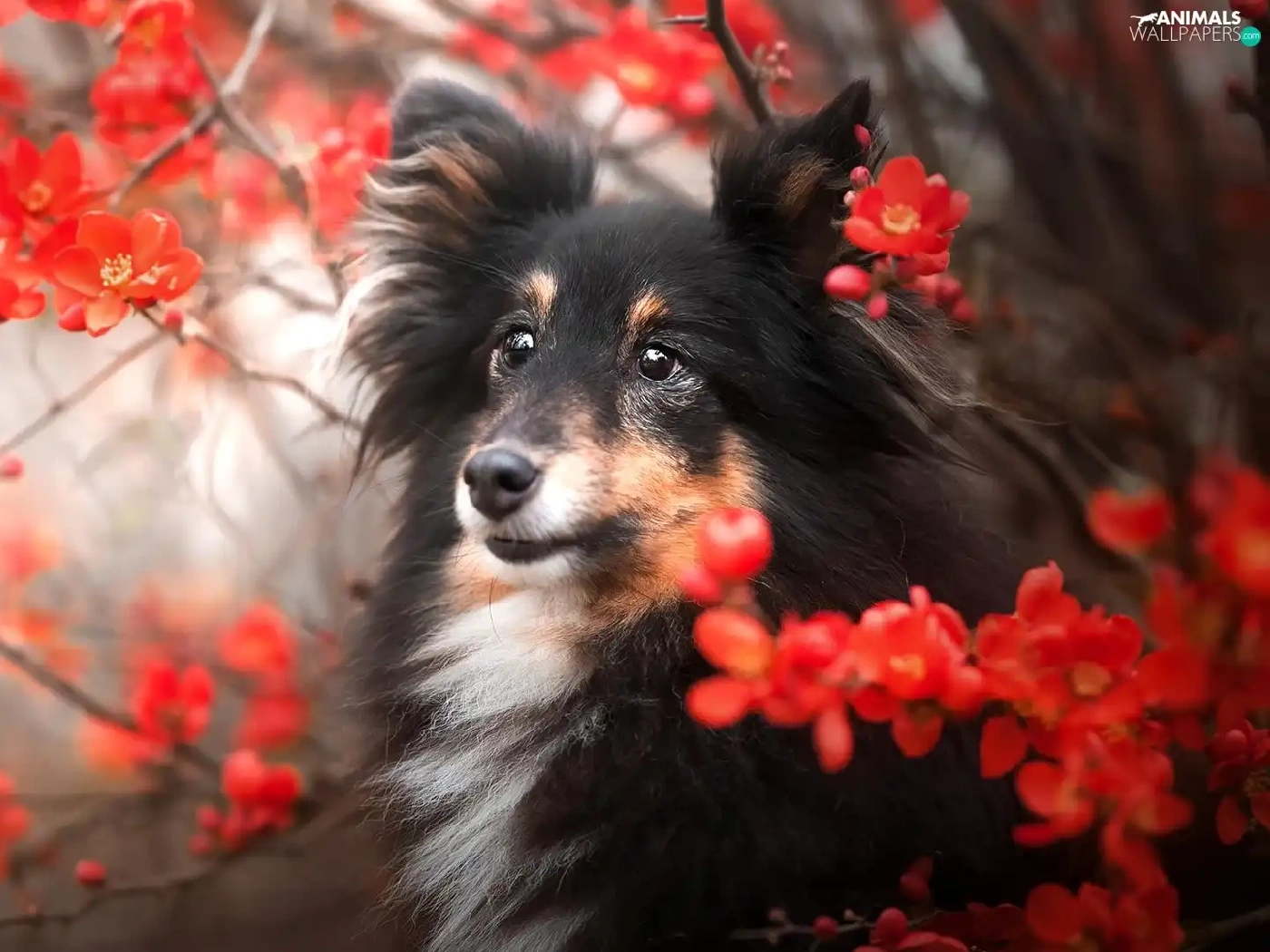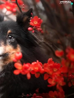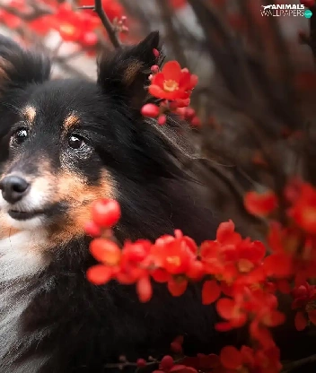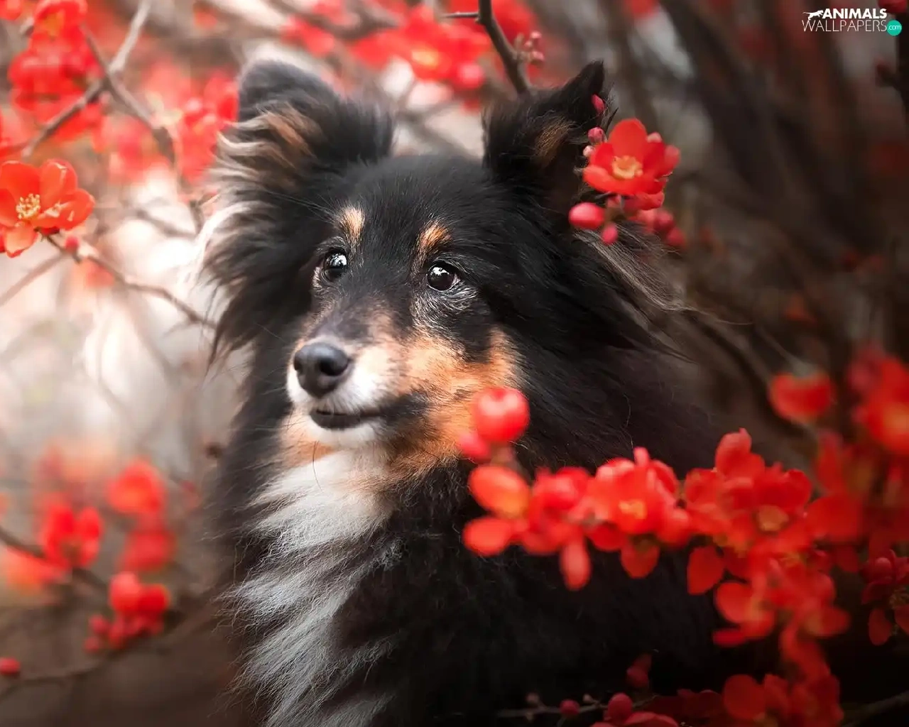 dog, Red, Flowers, shetland Sheepdog
