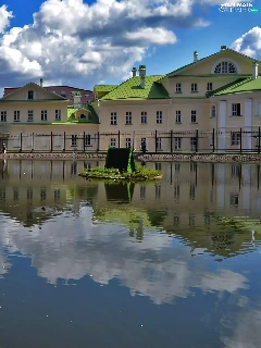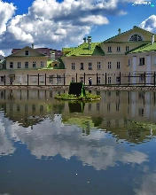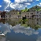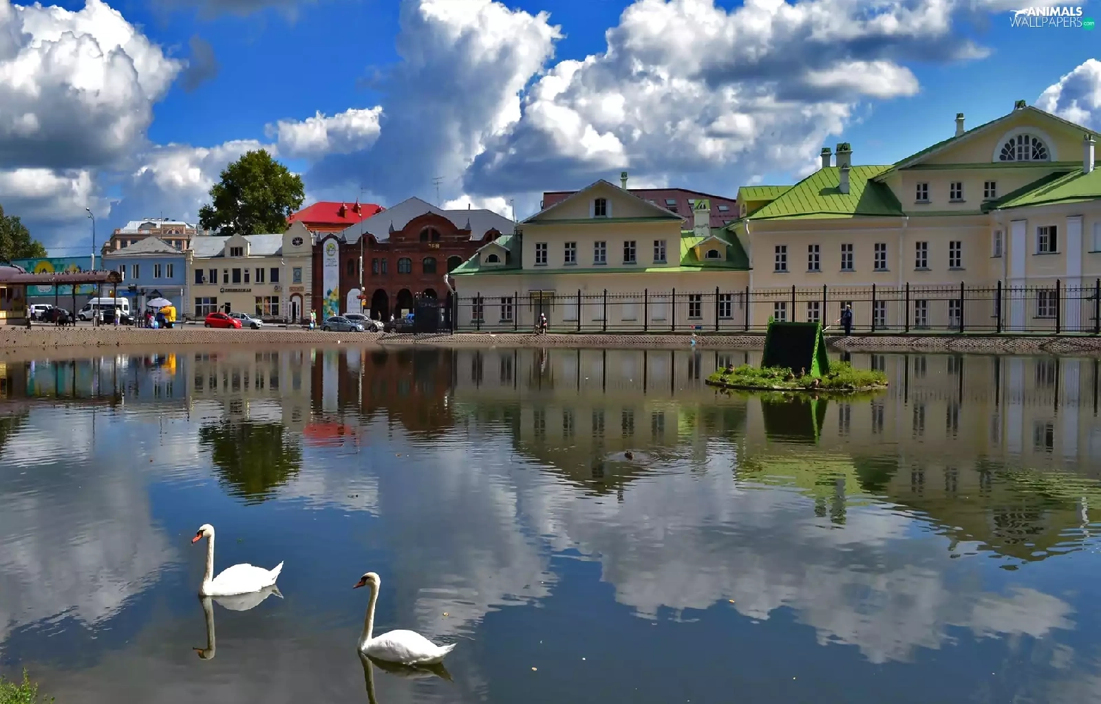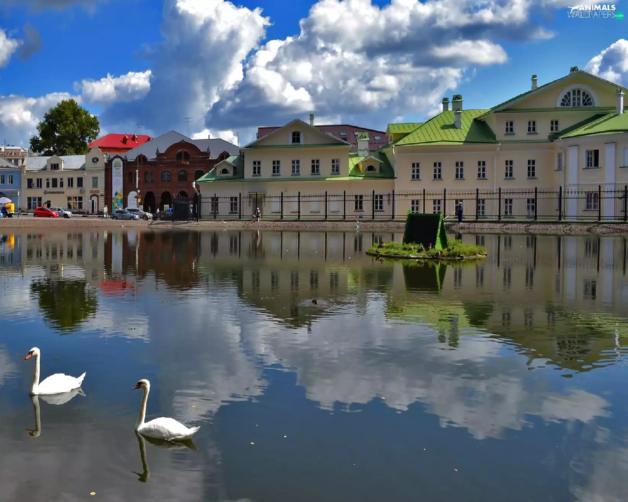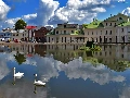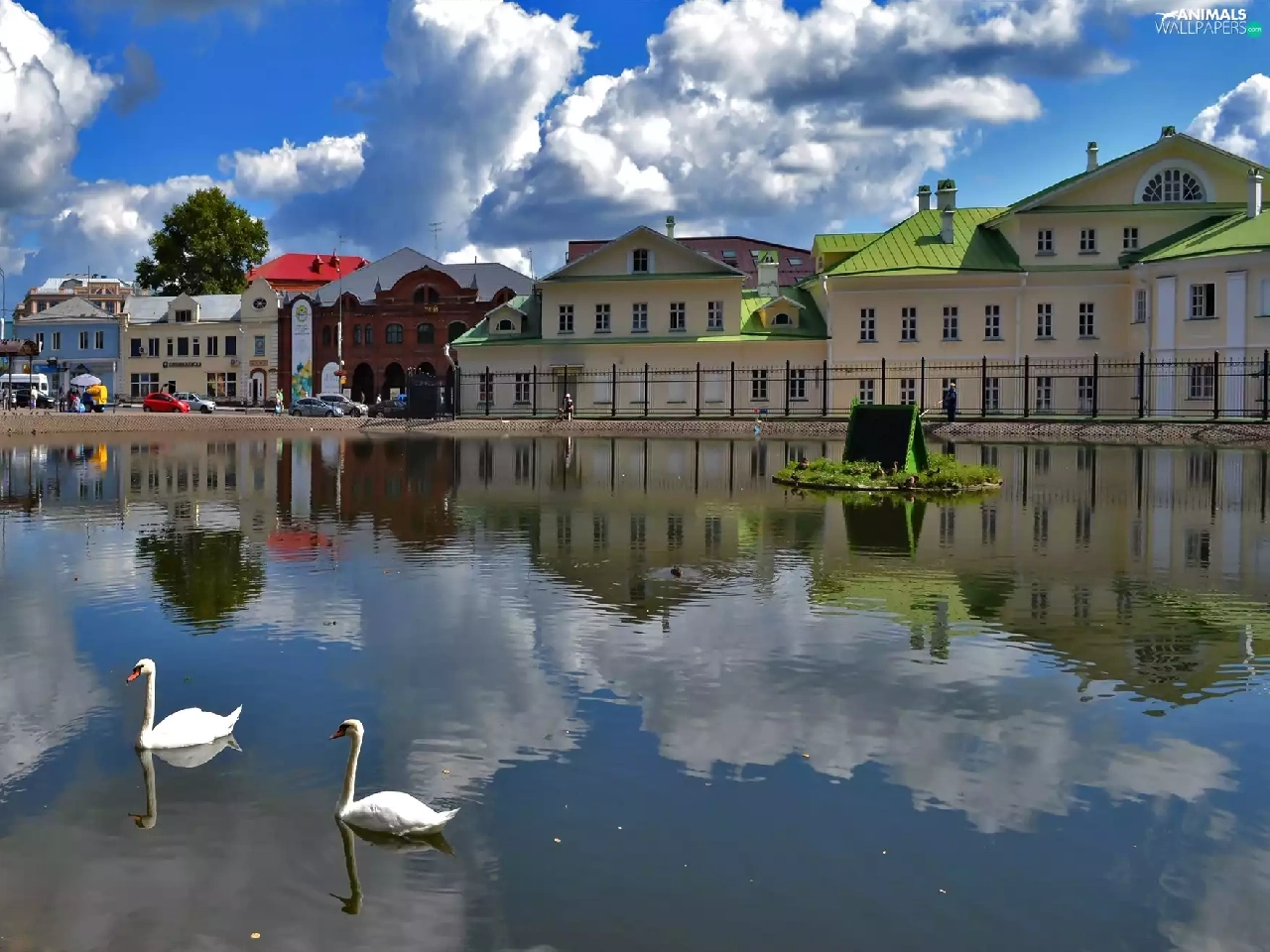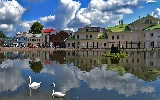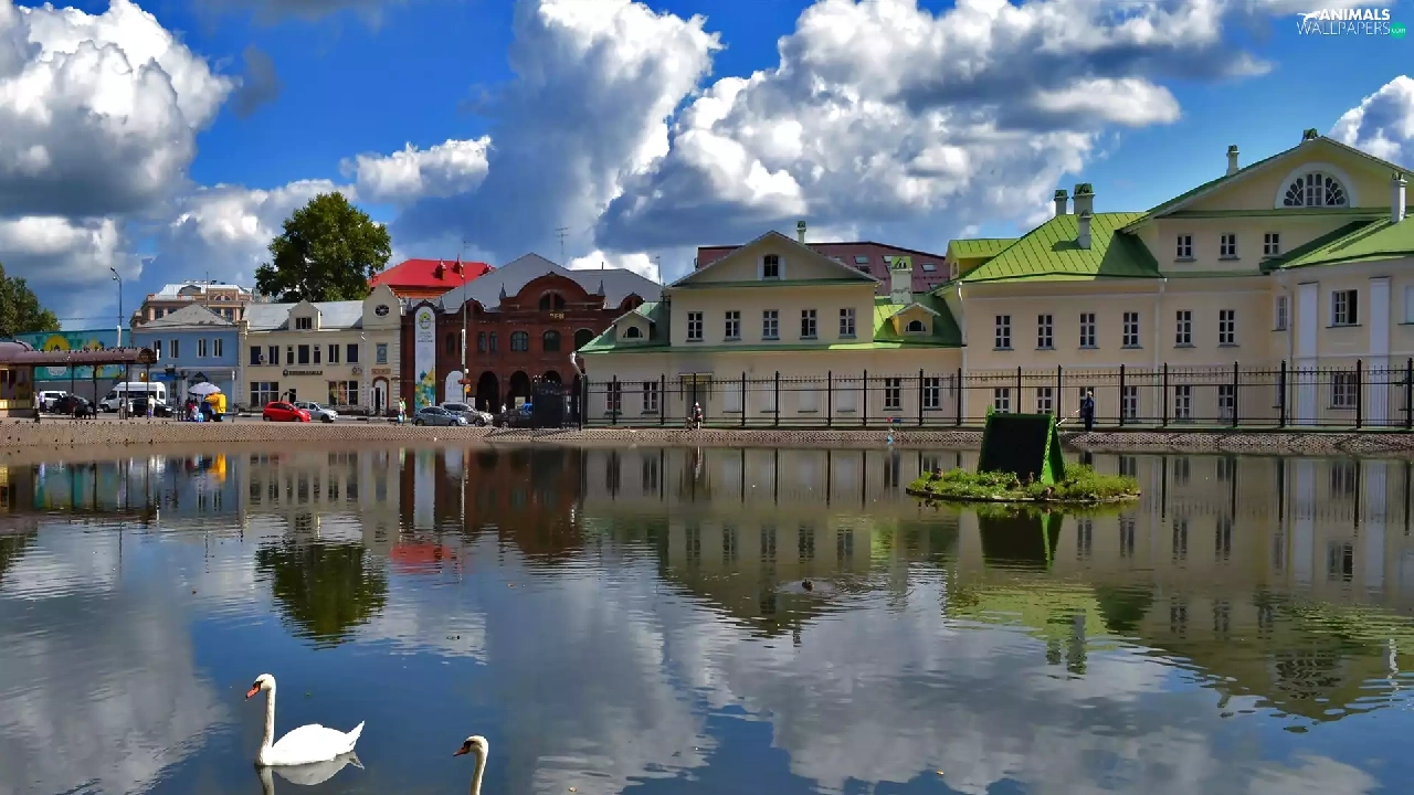 clouds, reflection, Swan, River, Houses