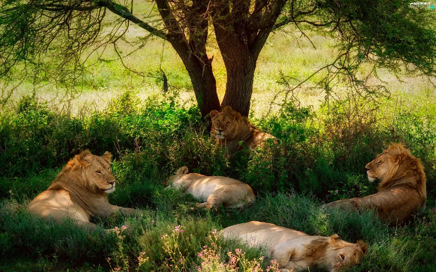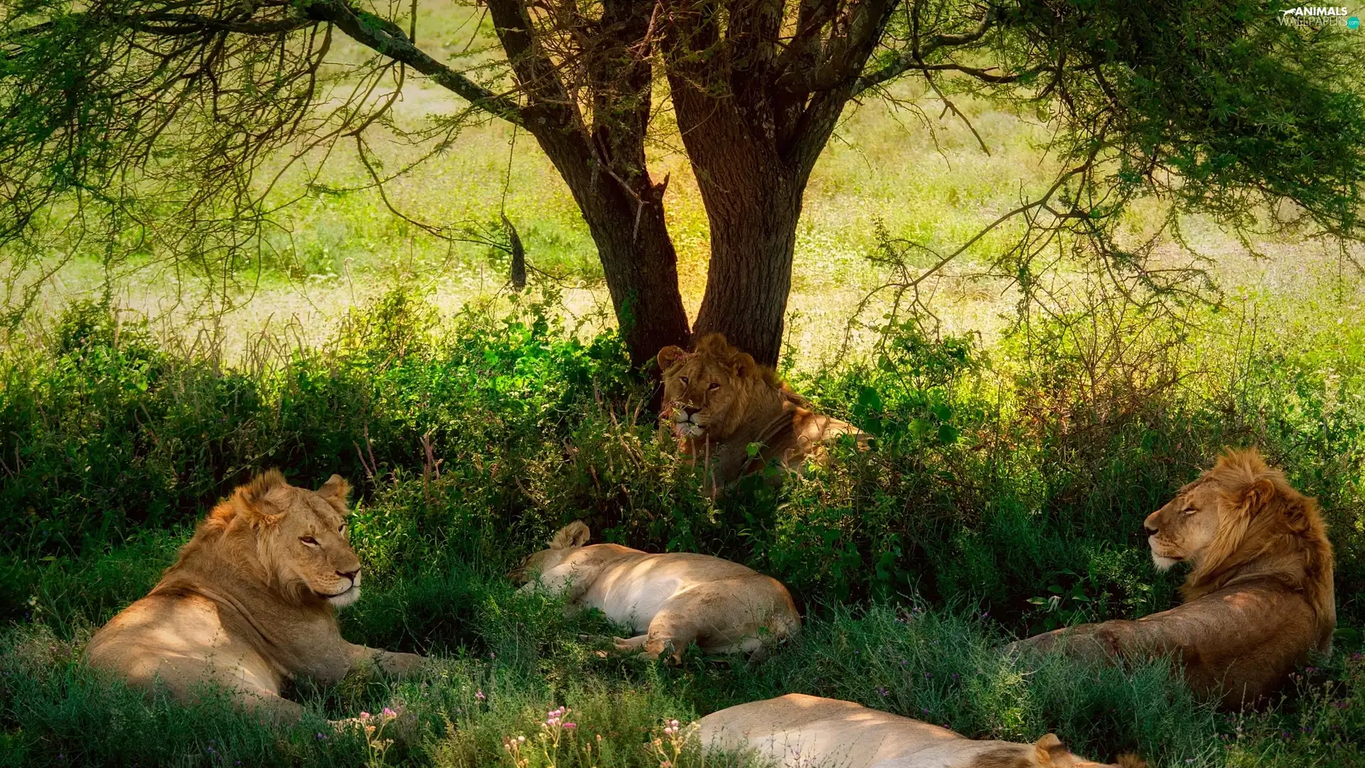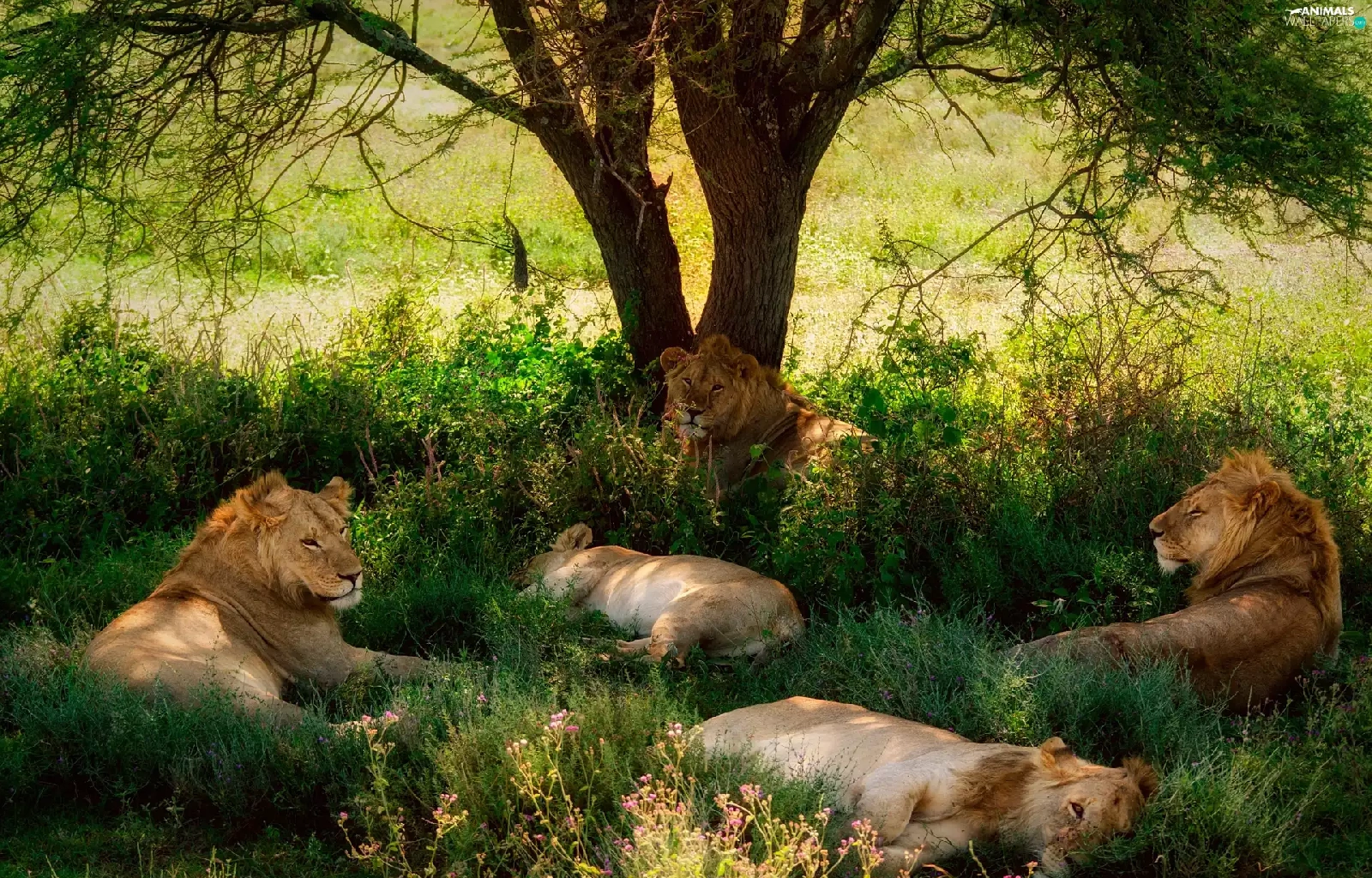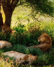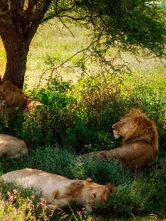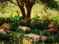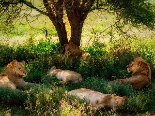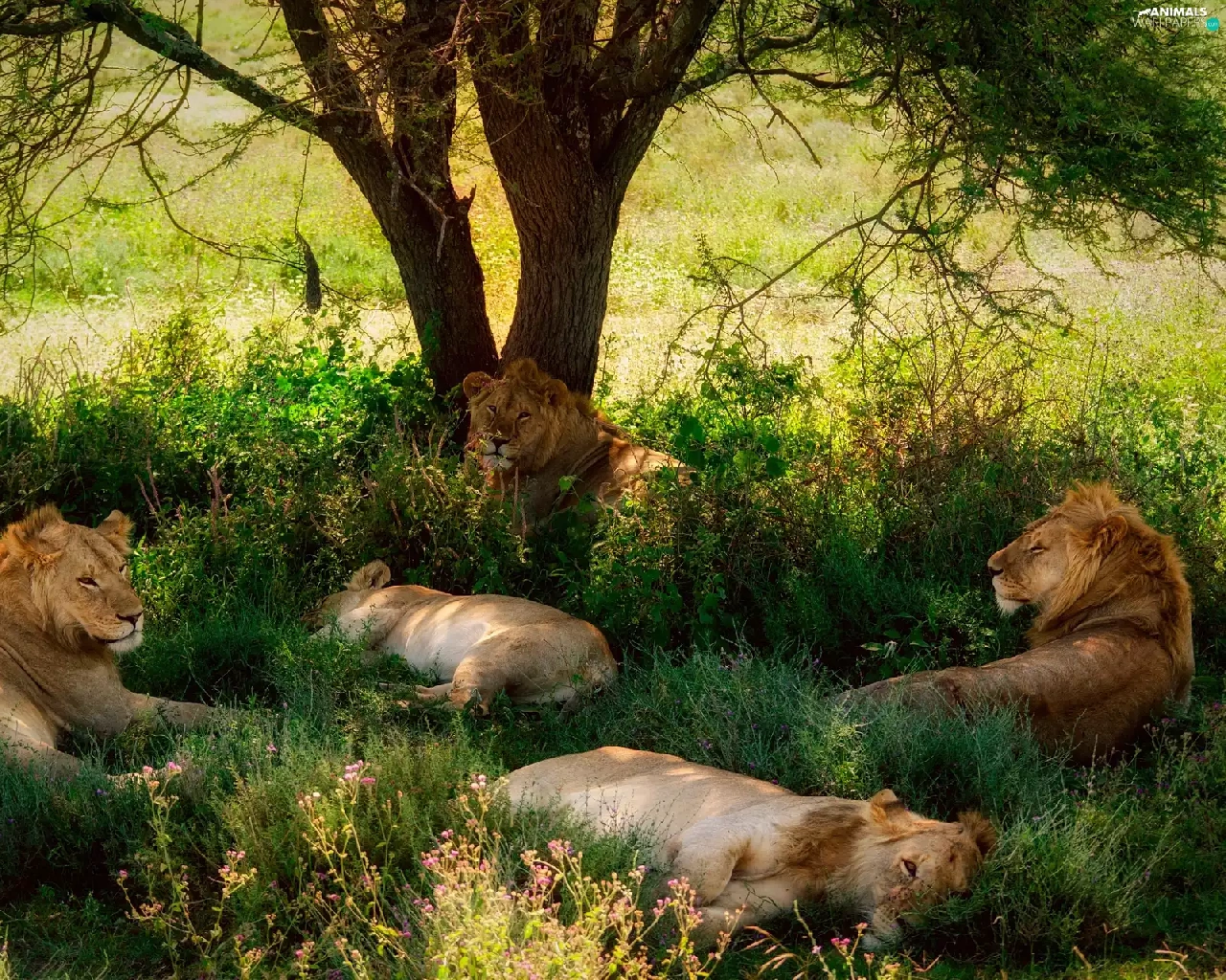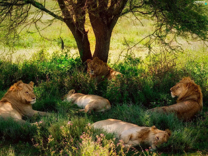 resting, lions, trees