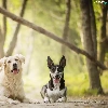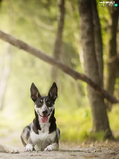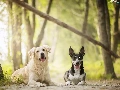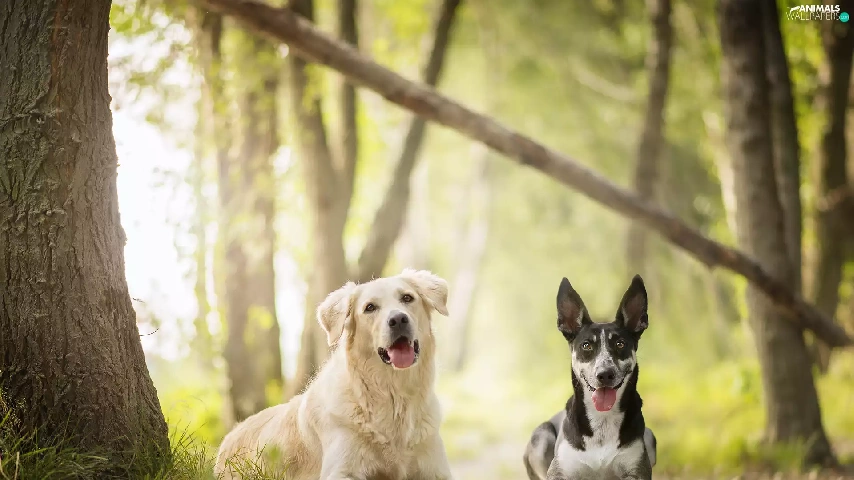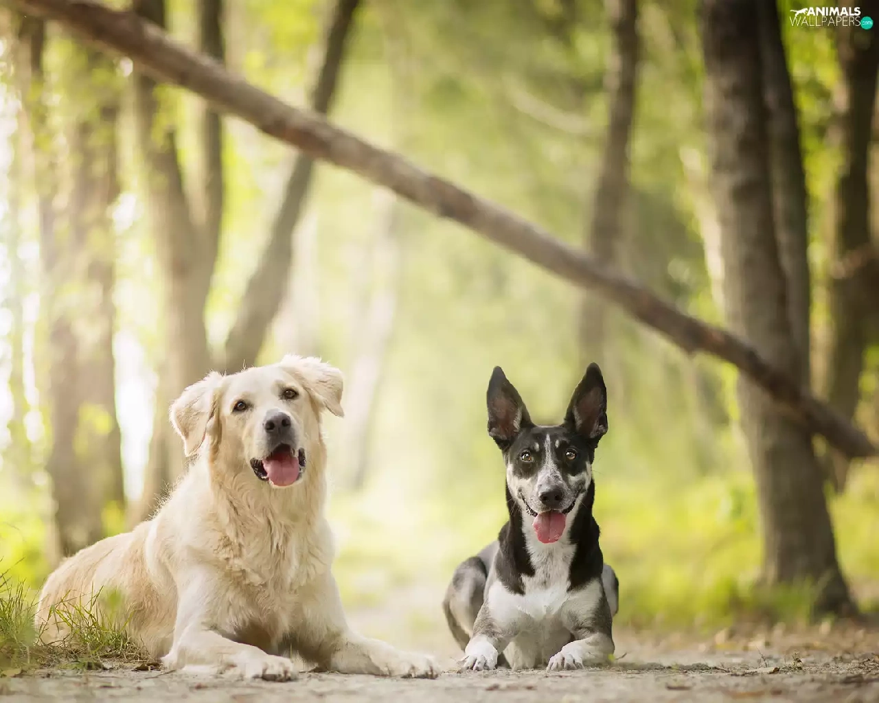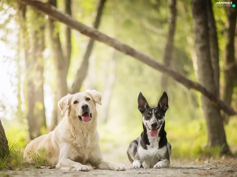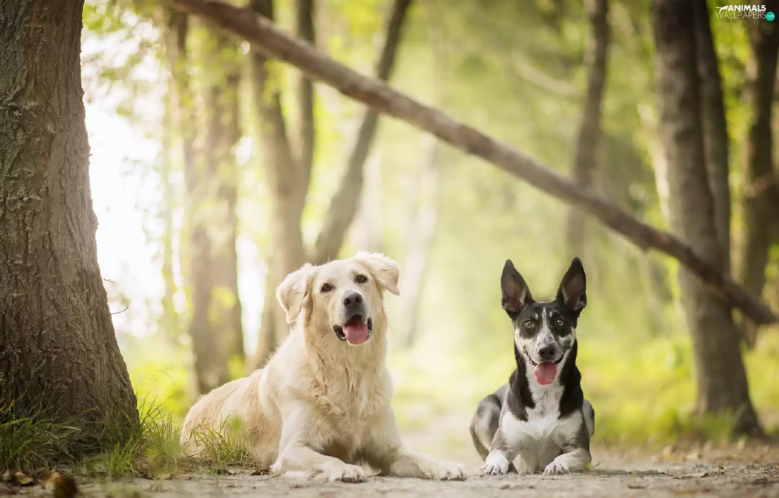 trees, viewes, Australian cattle dog, forest, Golden Retriever