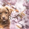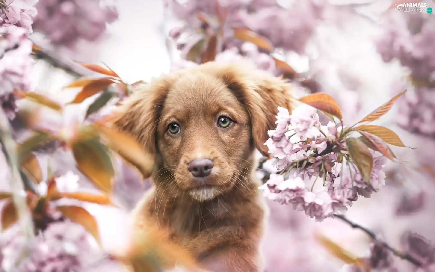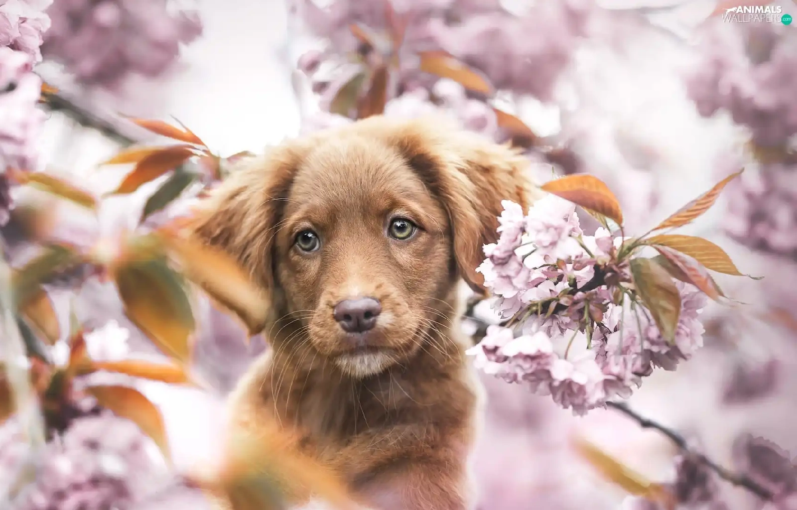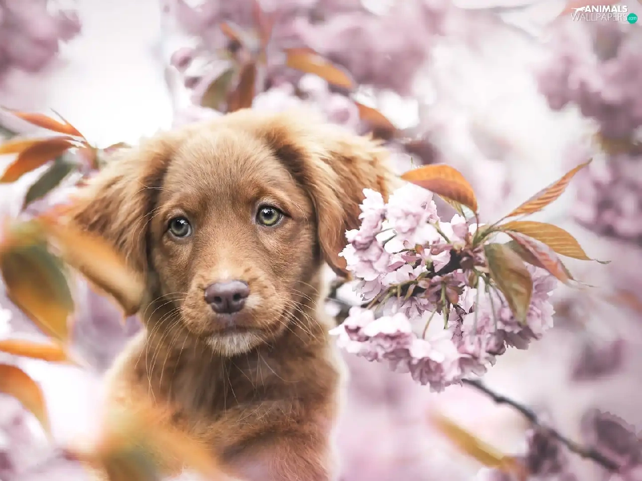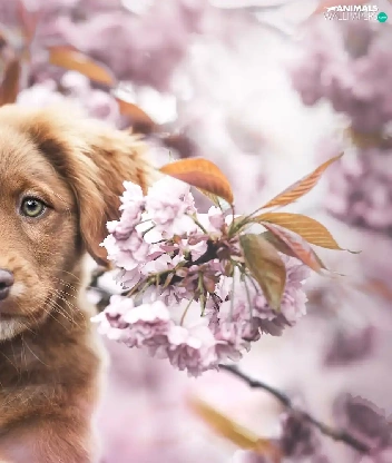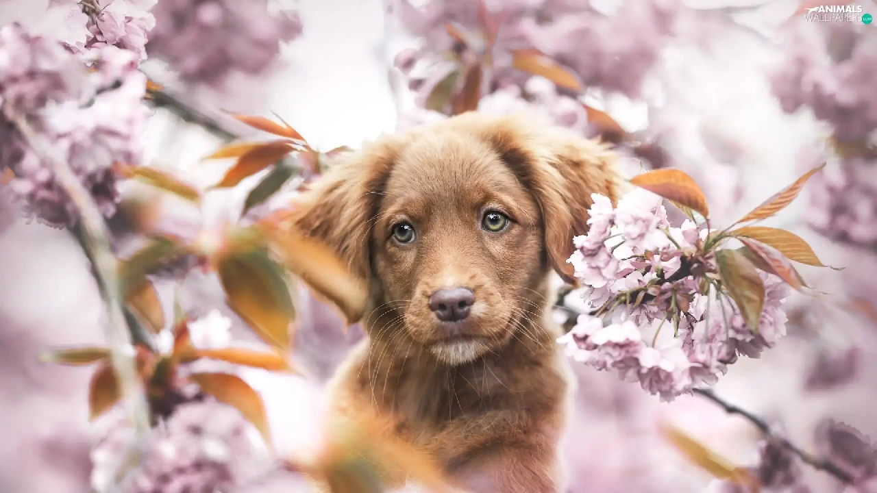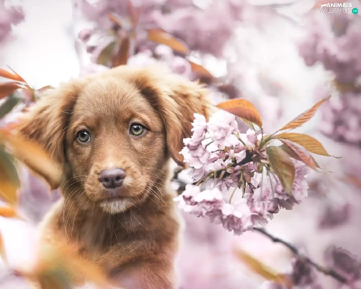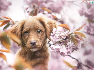 Retriever Nova Scotia, Brown, Fruit Tree, Puppy, dog, Flowers, blur
