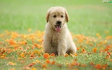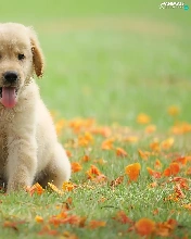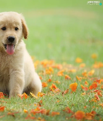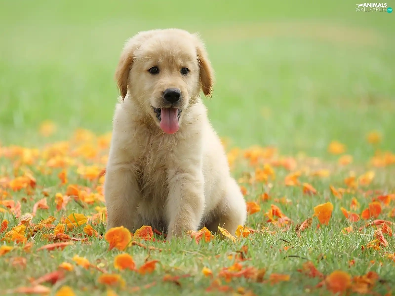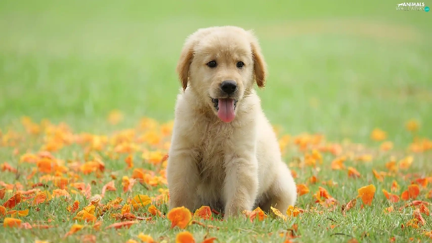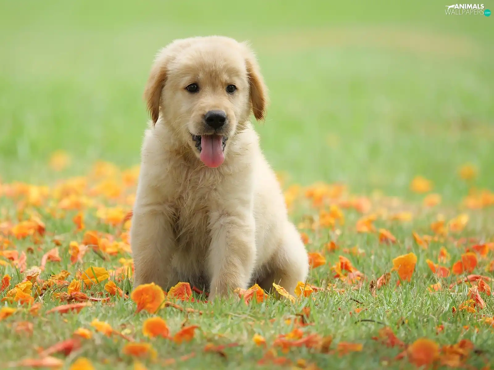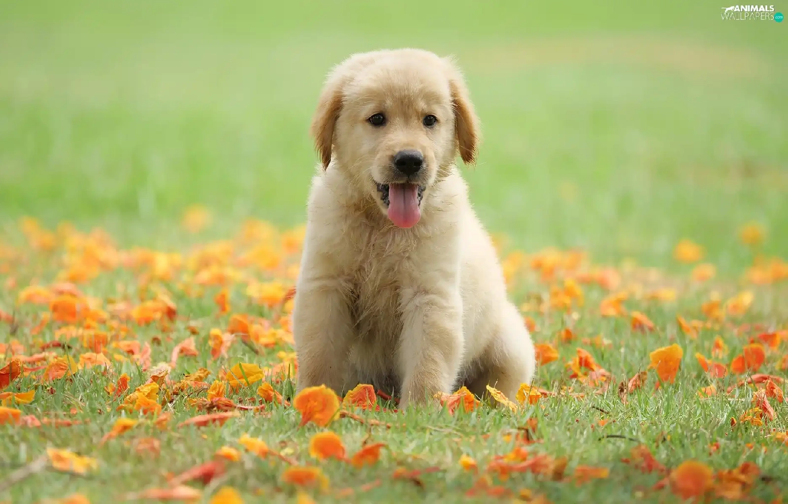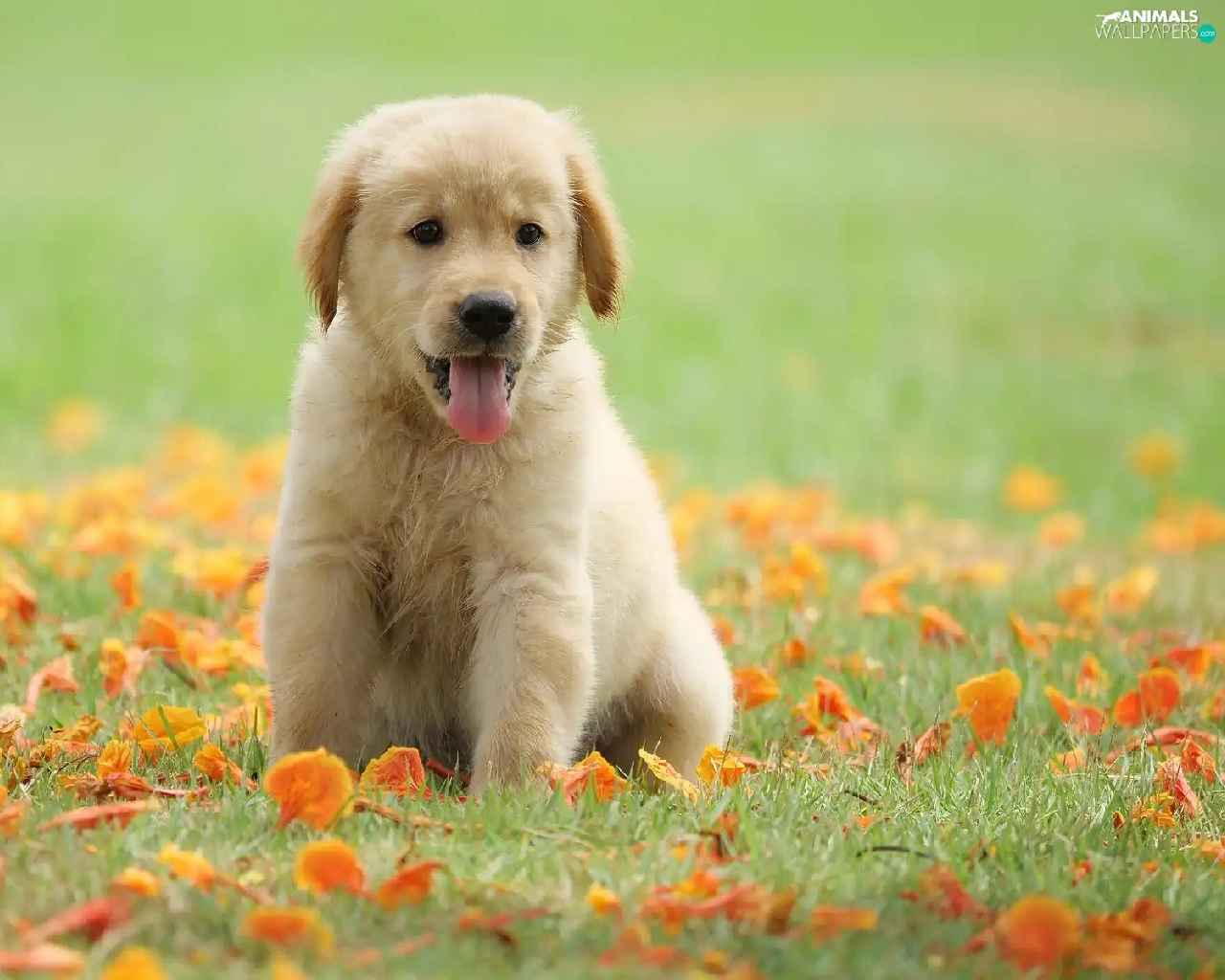 Meadow, Leaf, Golden Retriever, tongue, Puppy