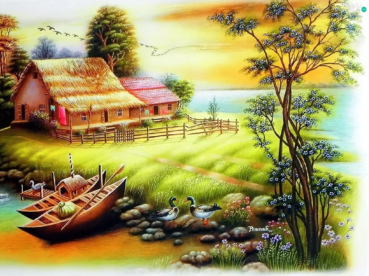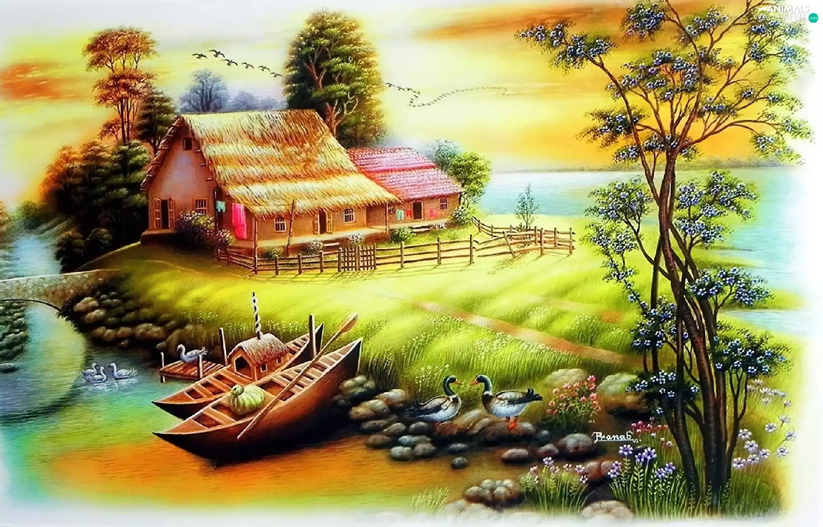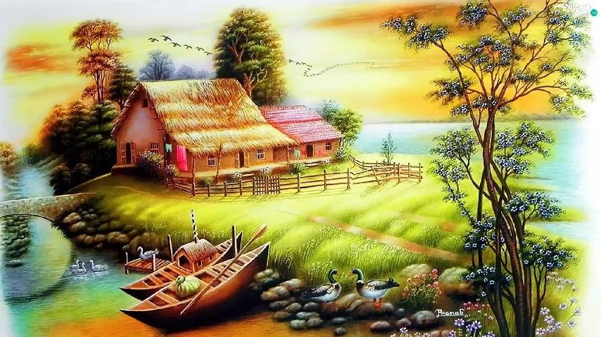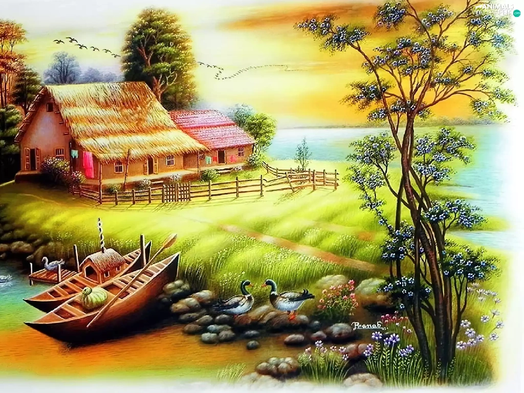 house, boats, birds, River