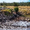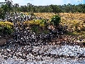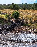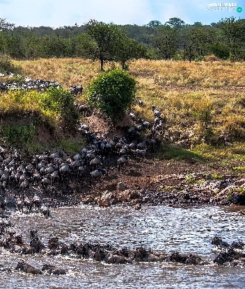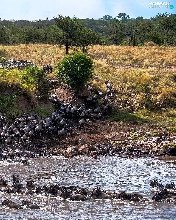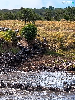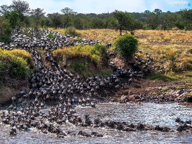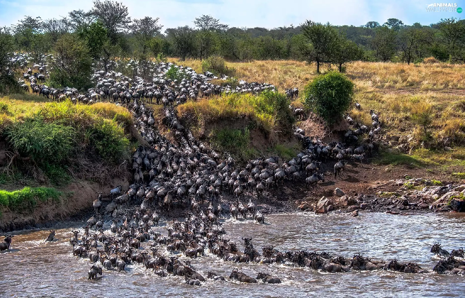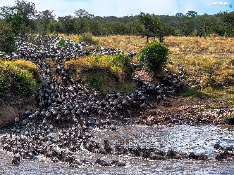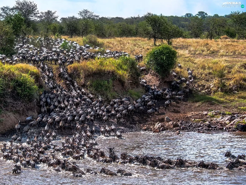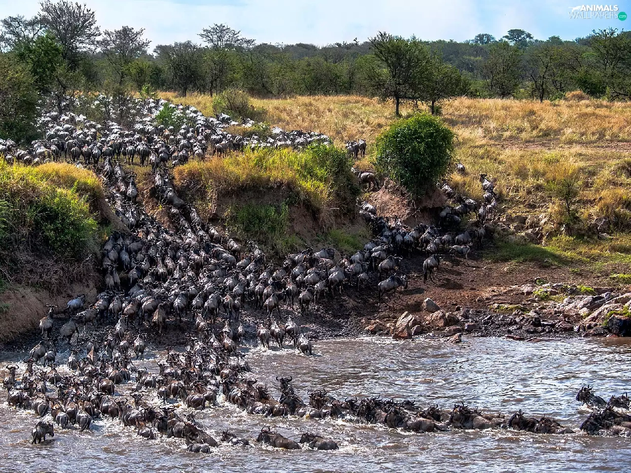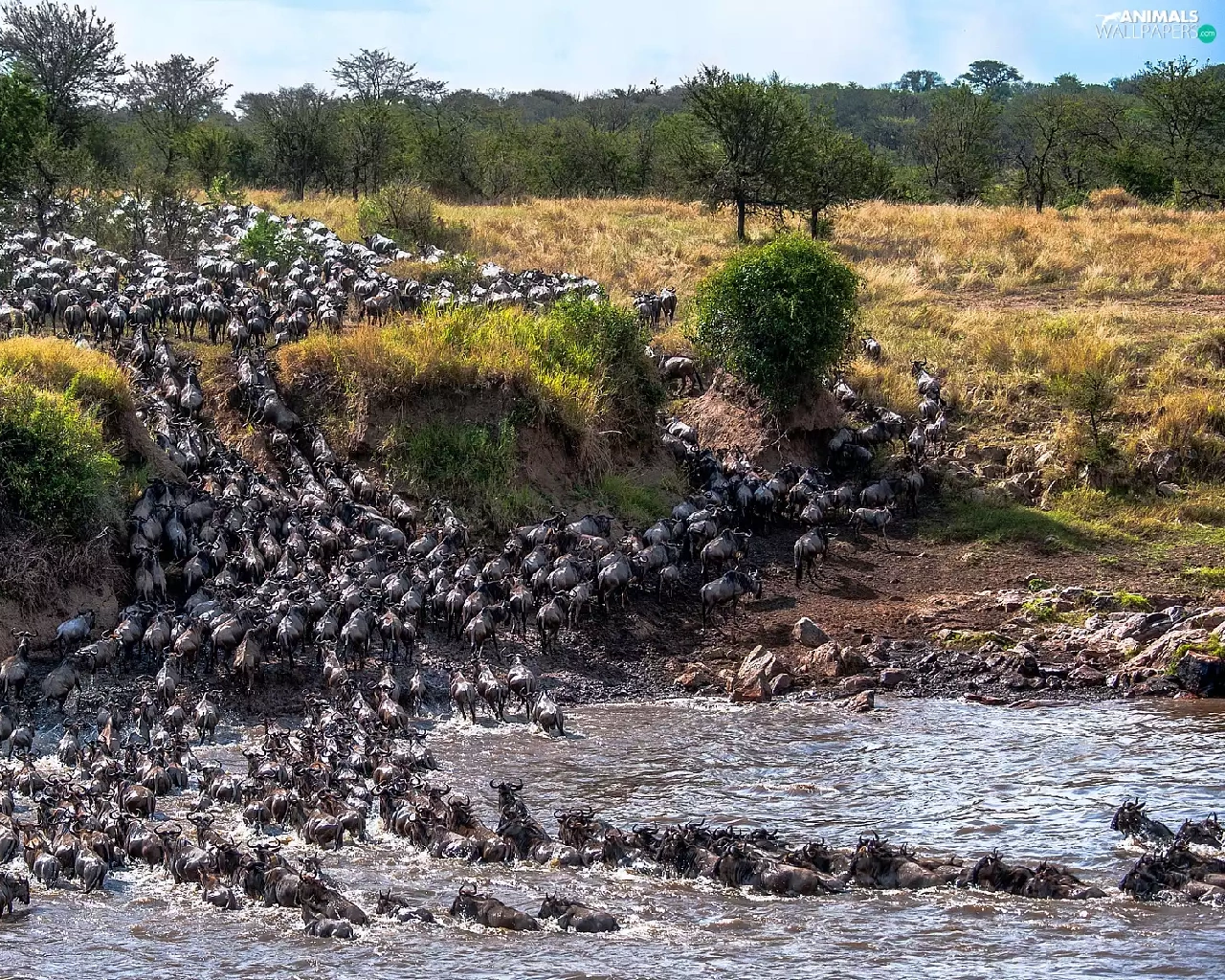 savanna, wildebeest, trees, River, Antelope, Stones, viewes