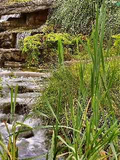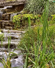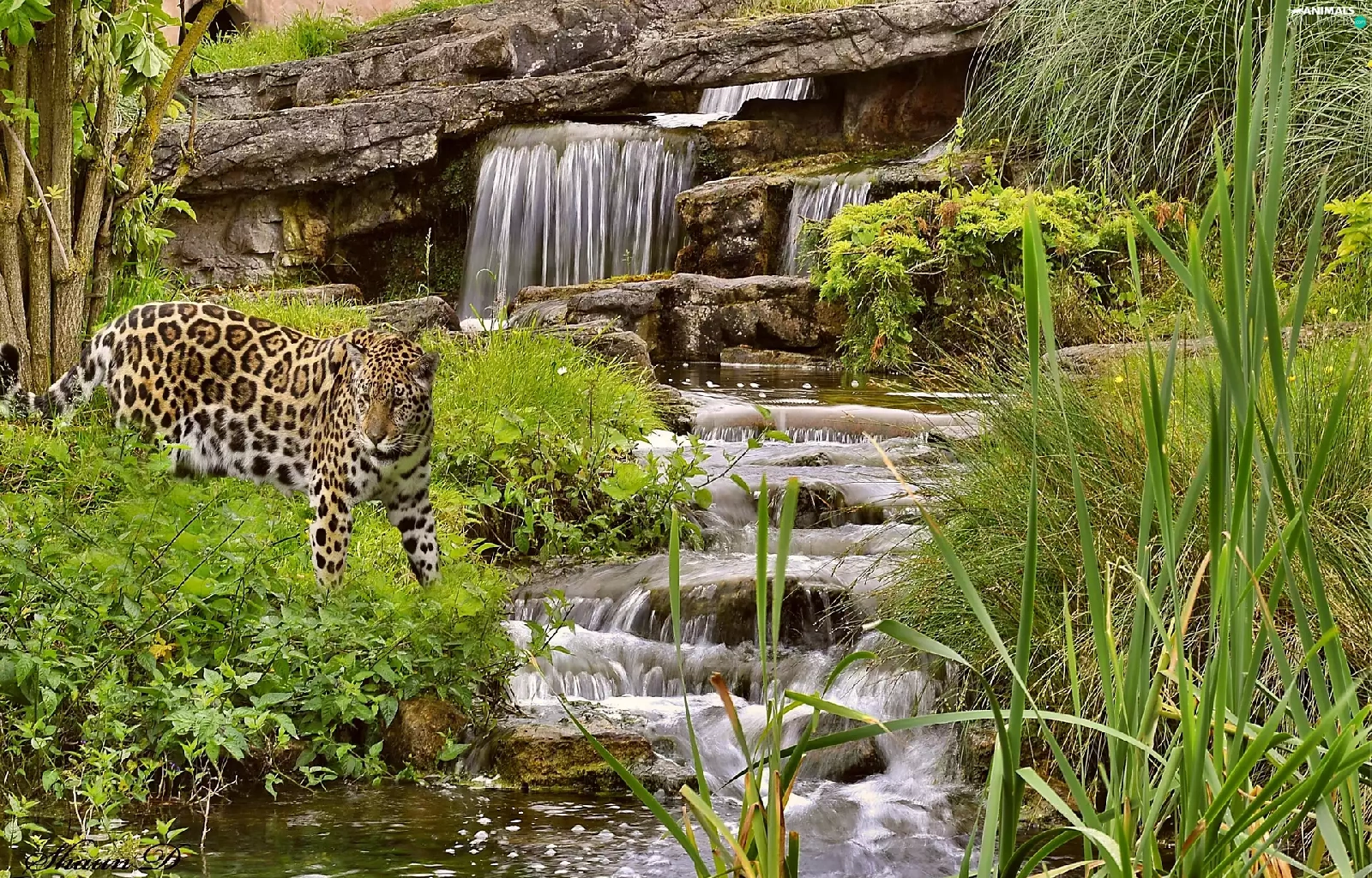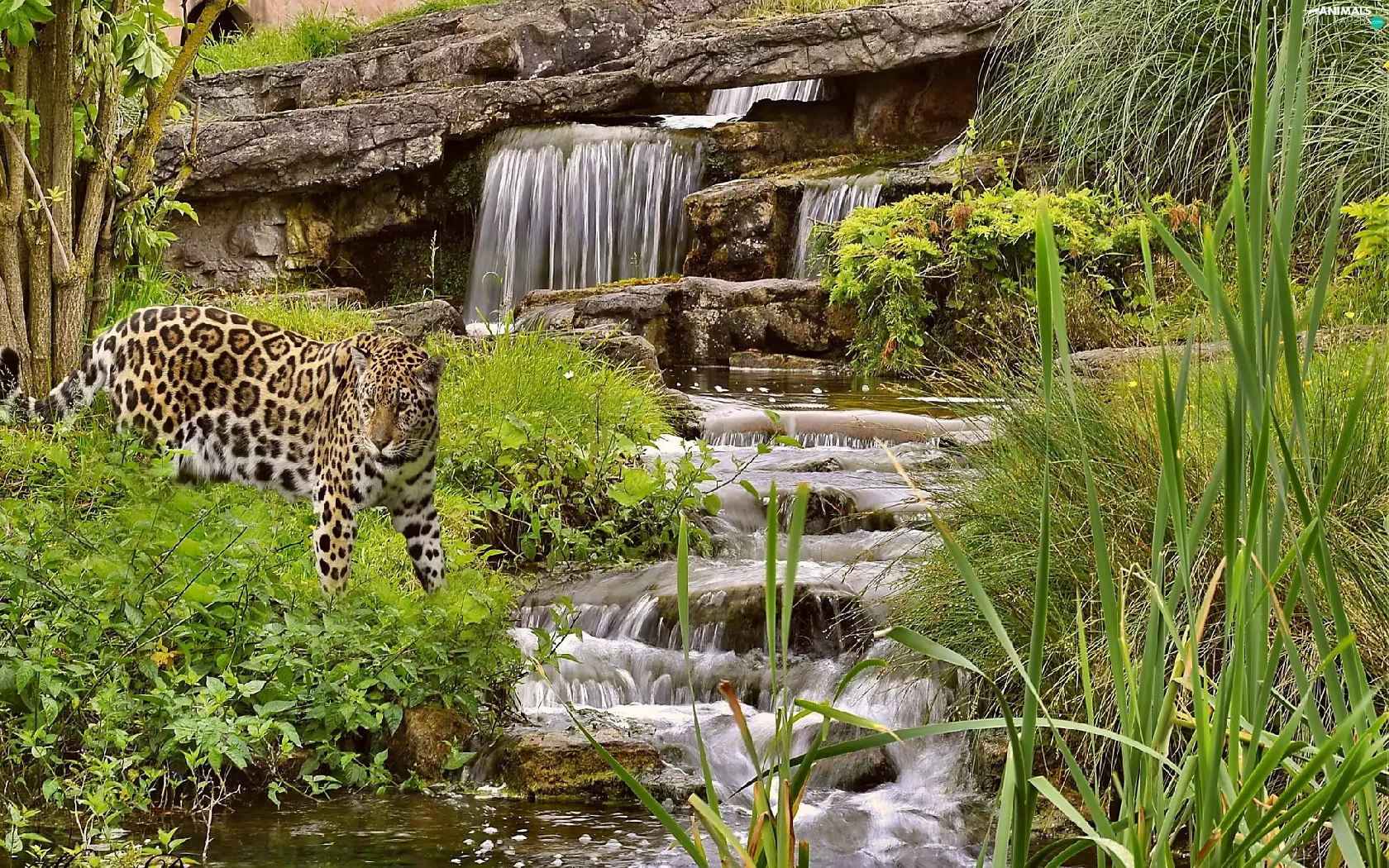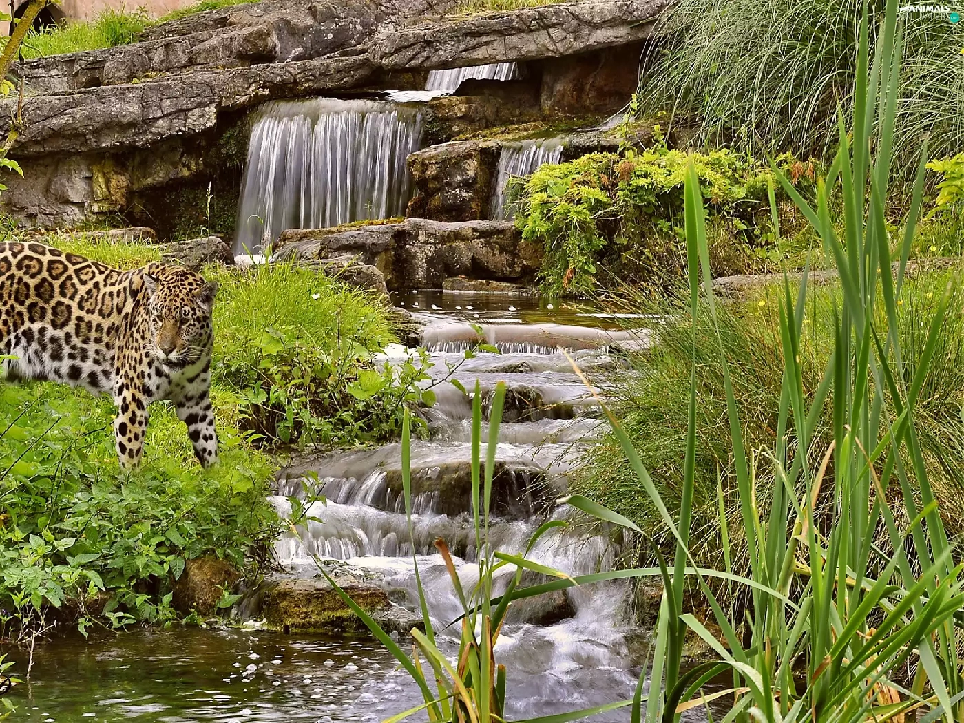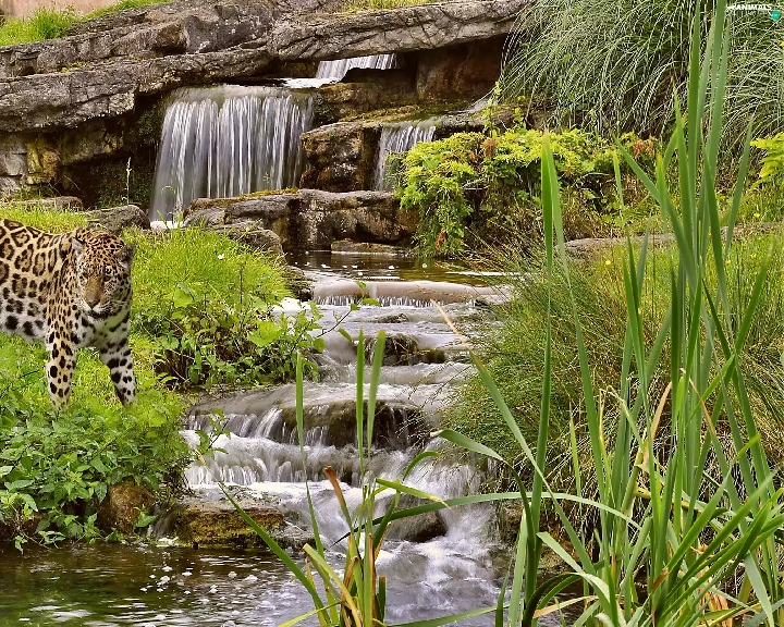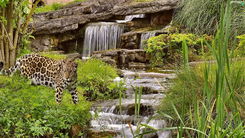 waterfall, green, Leopards, rocks