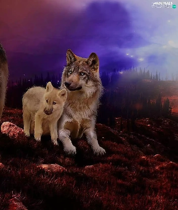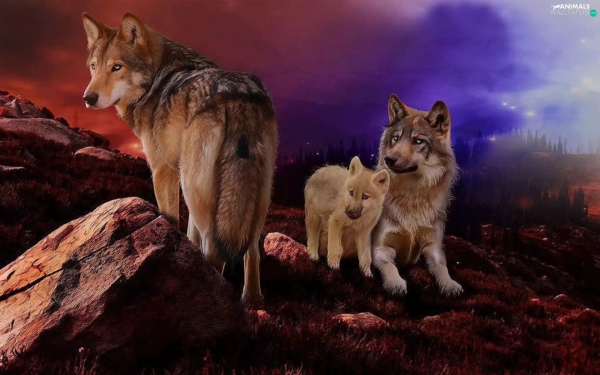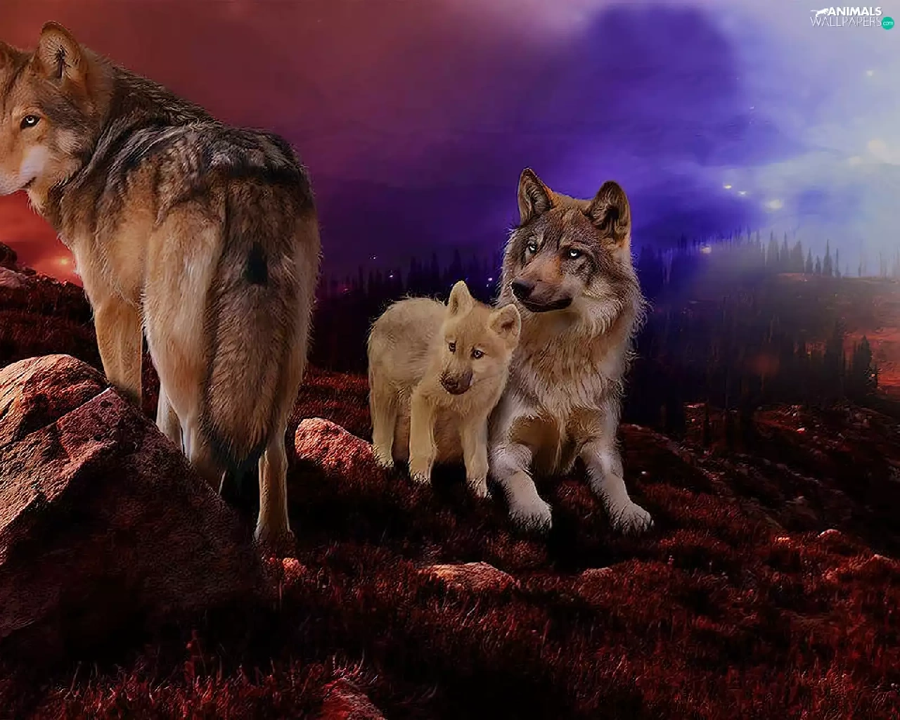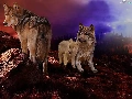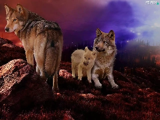 wolves, west, sun, rocks