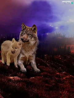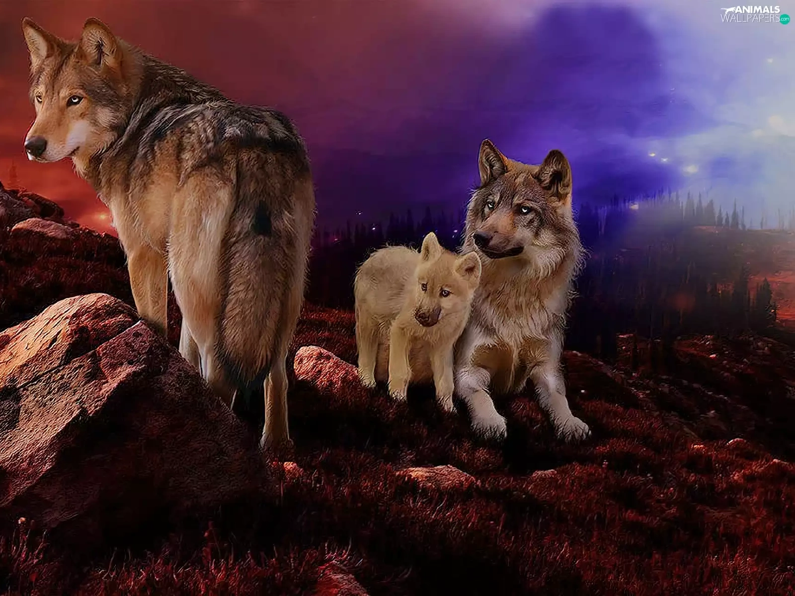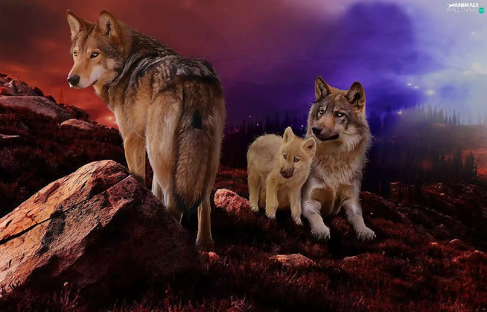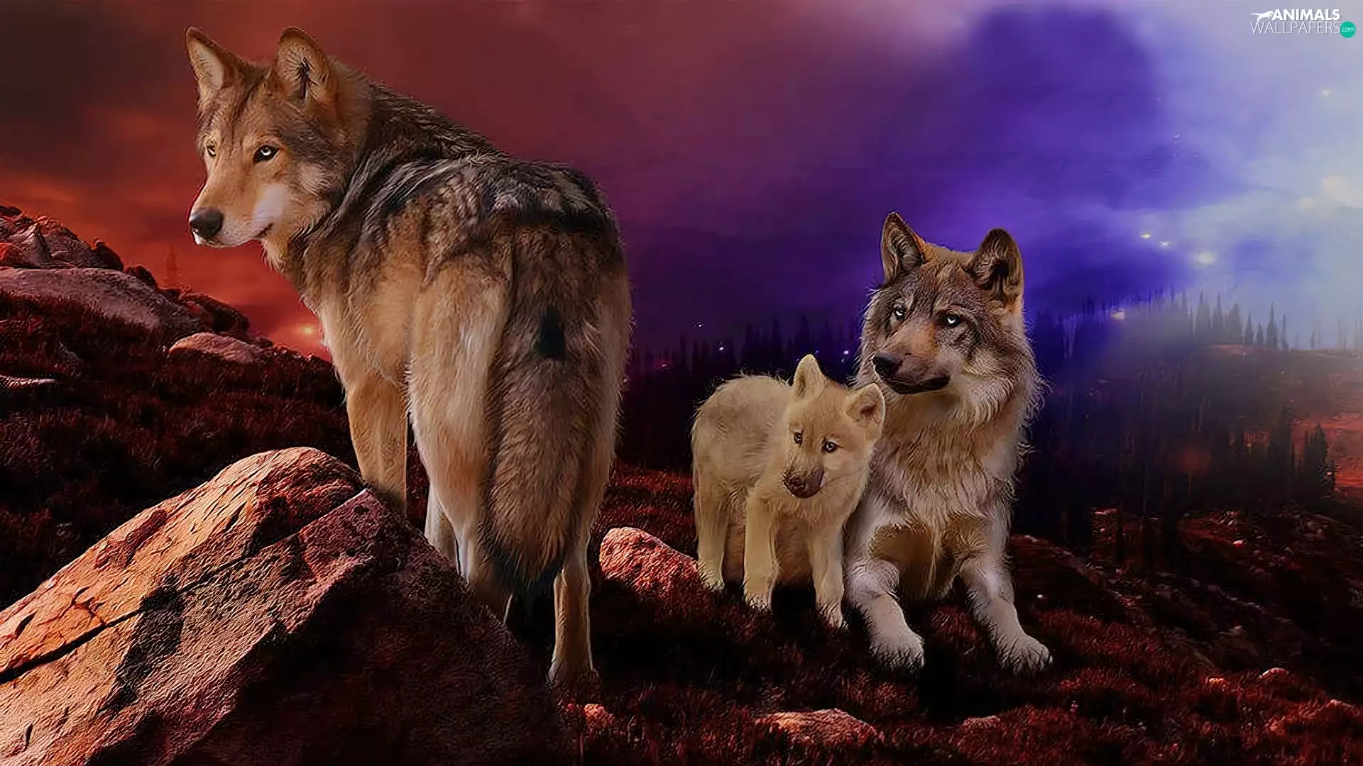 wolves, west, sun, rocks