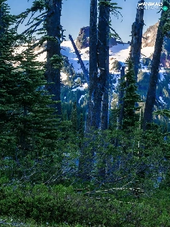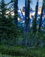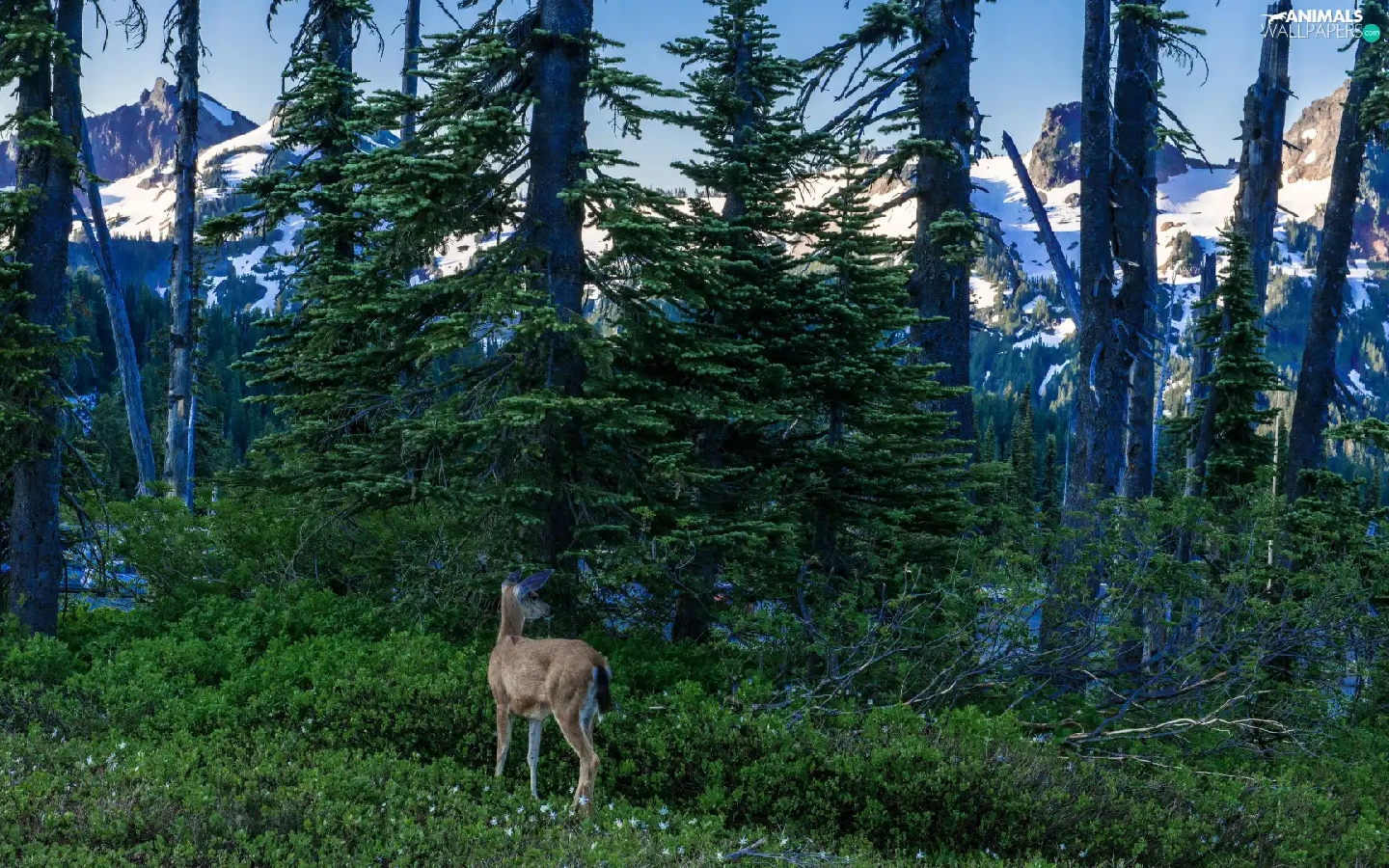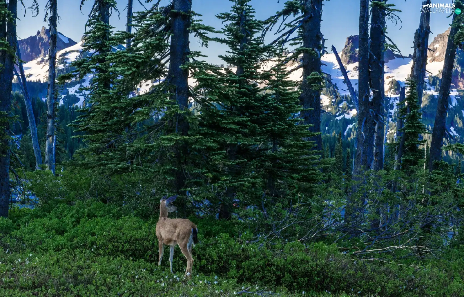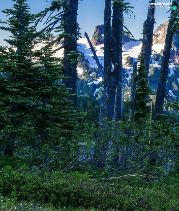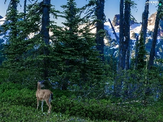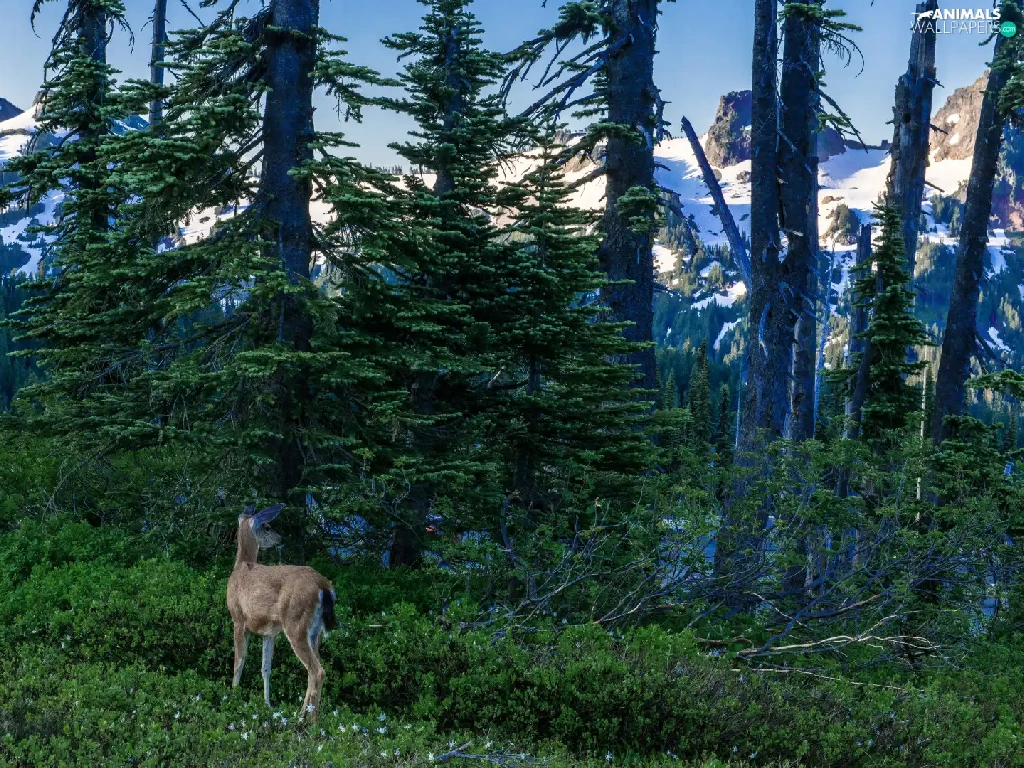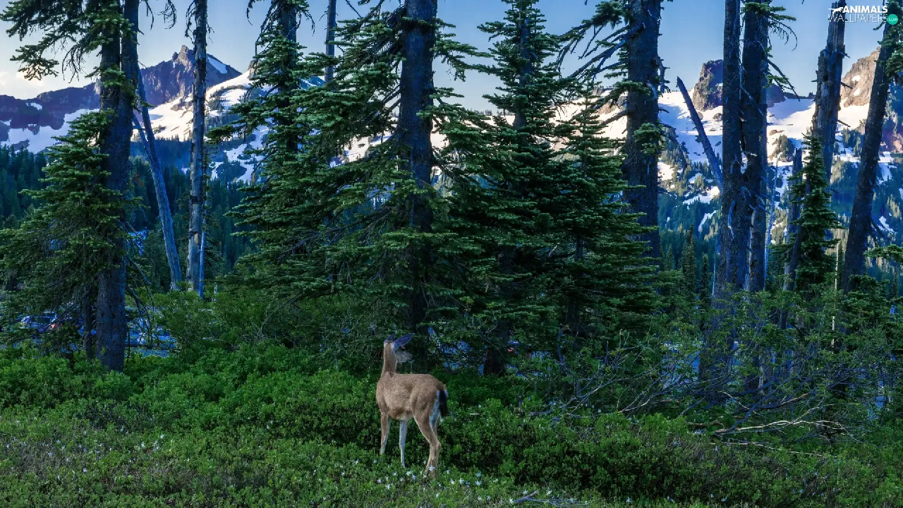 Mountains, roe, viewes, Snowy, trees