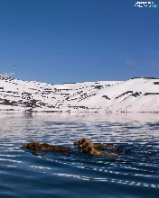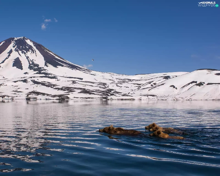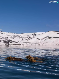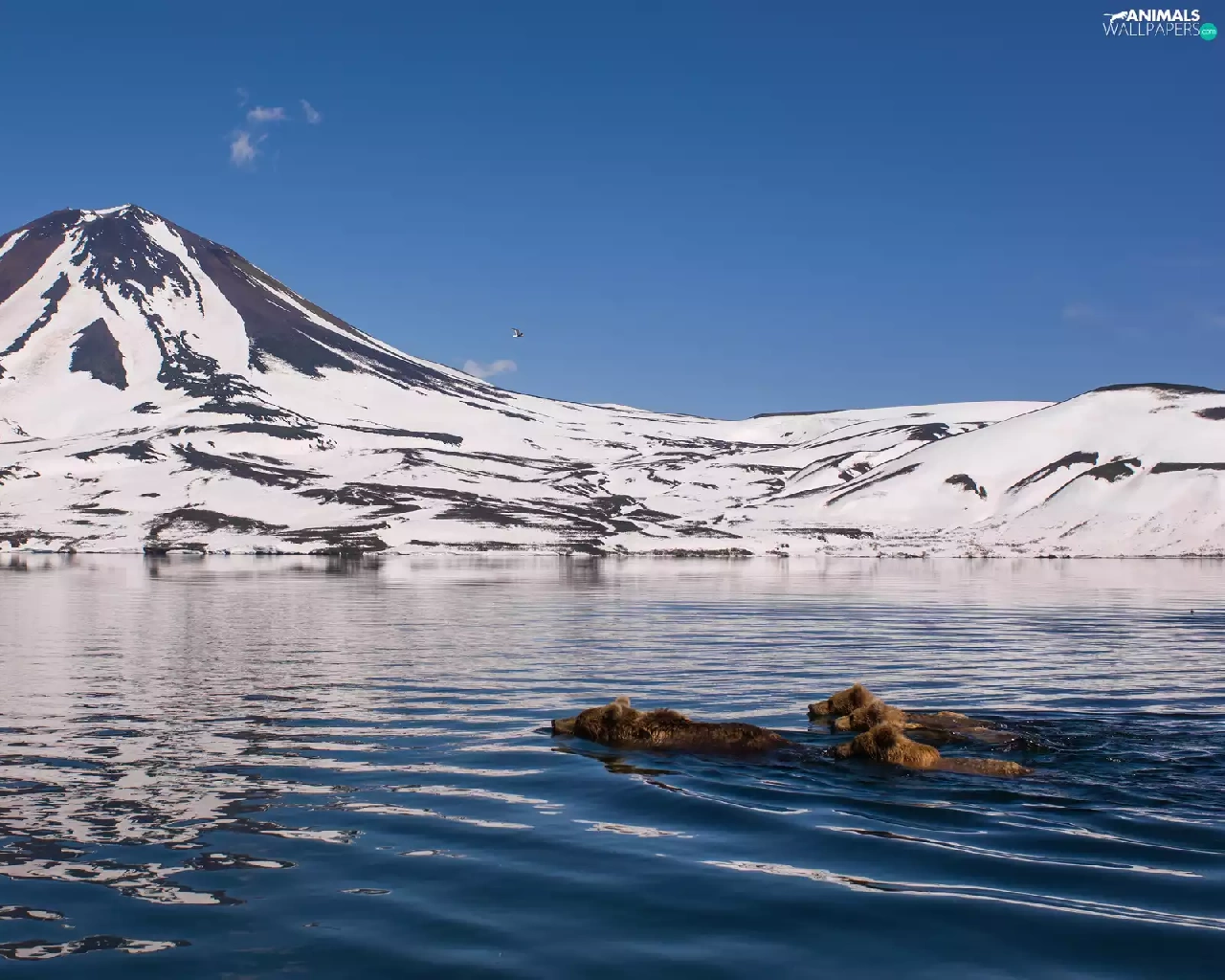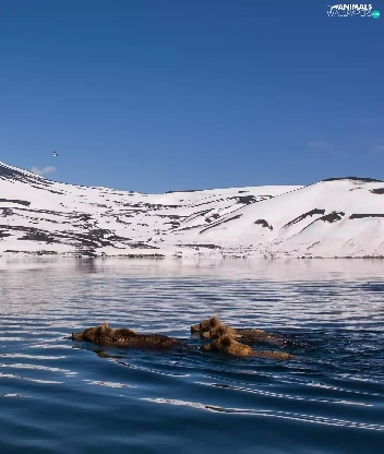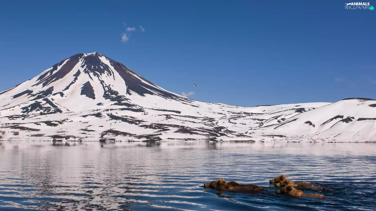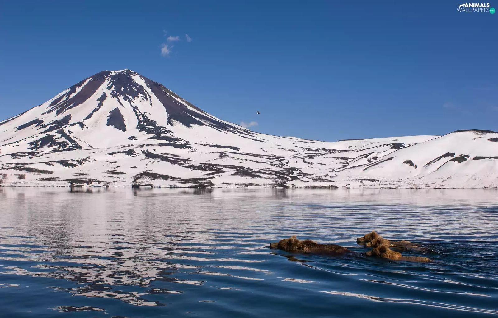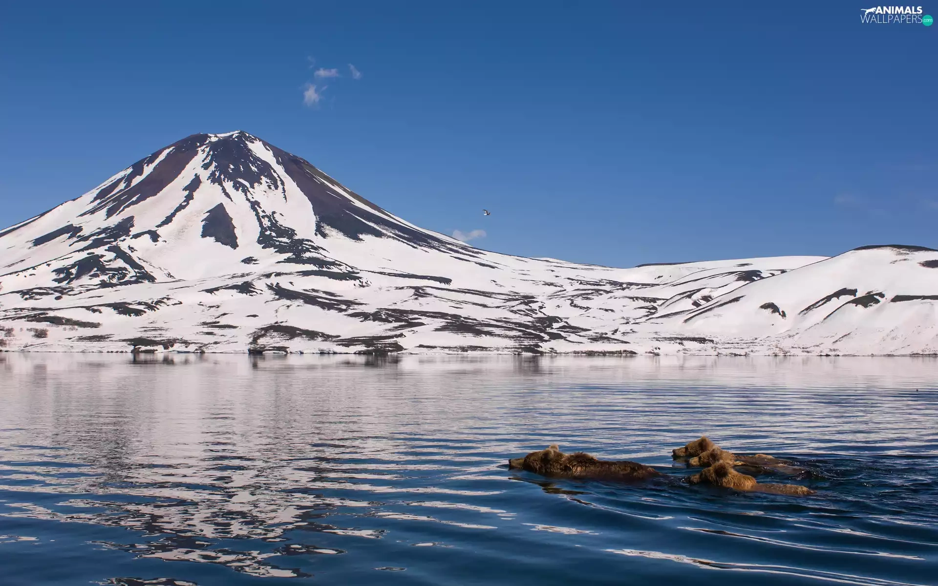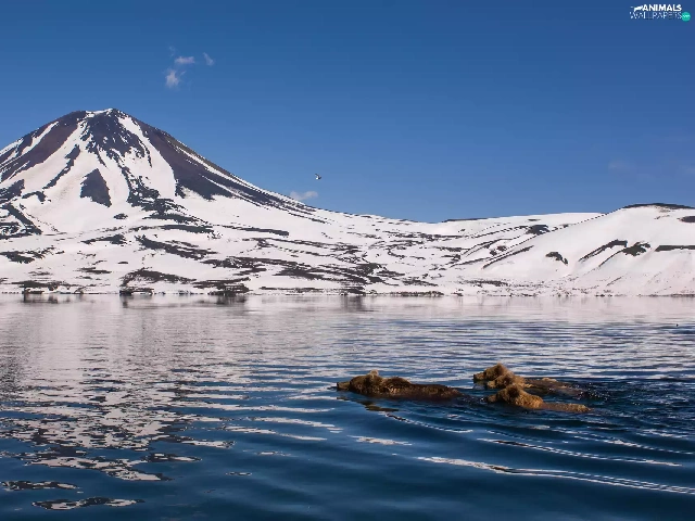 Brown Bears, mountains, Kamchatka, lake, winter, swimming, Russia