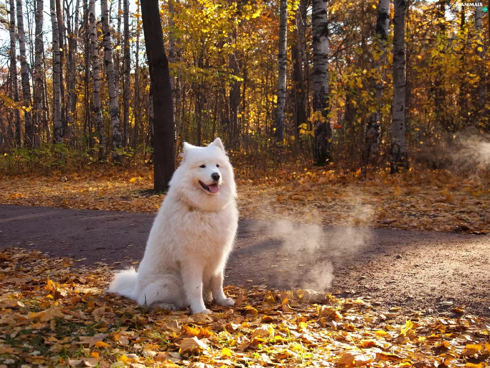 forest, dog, Leaf, Samojed, White, Way, autumn