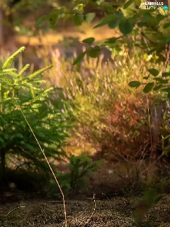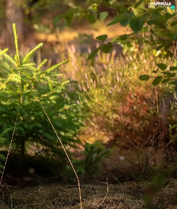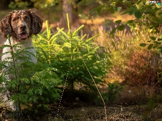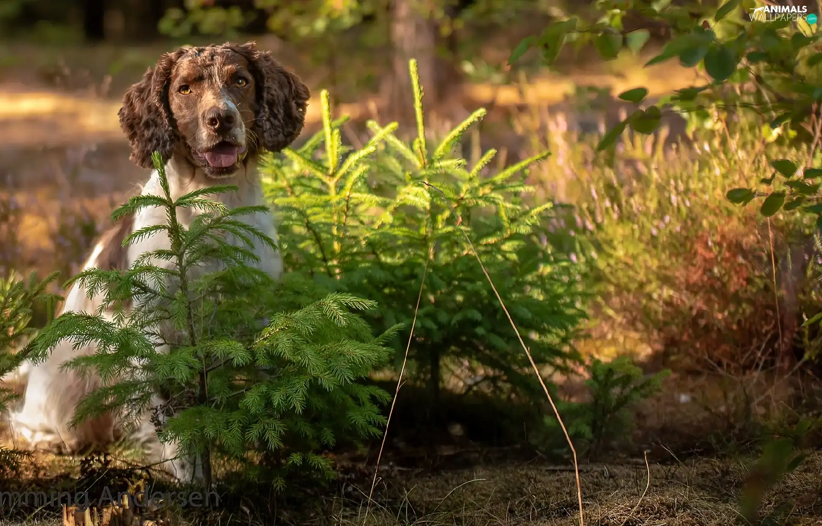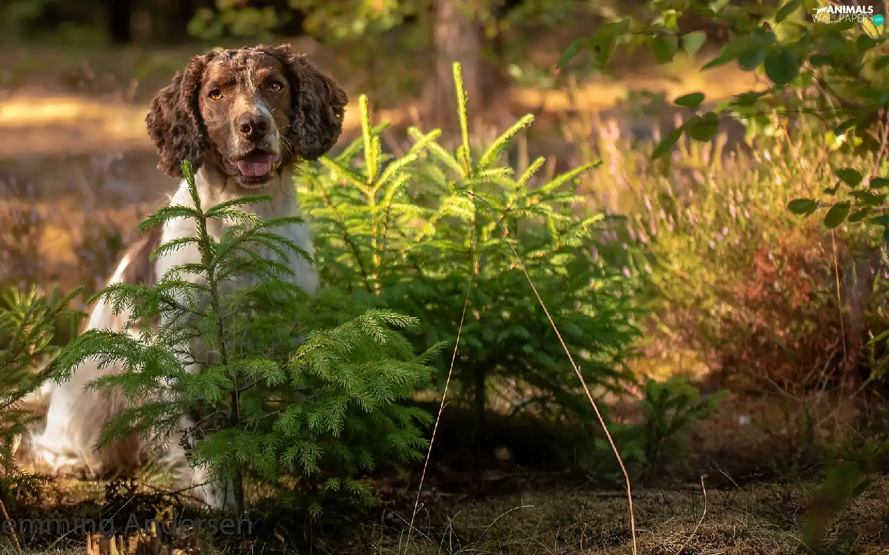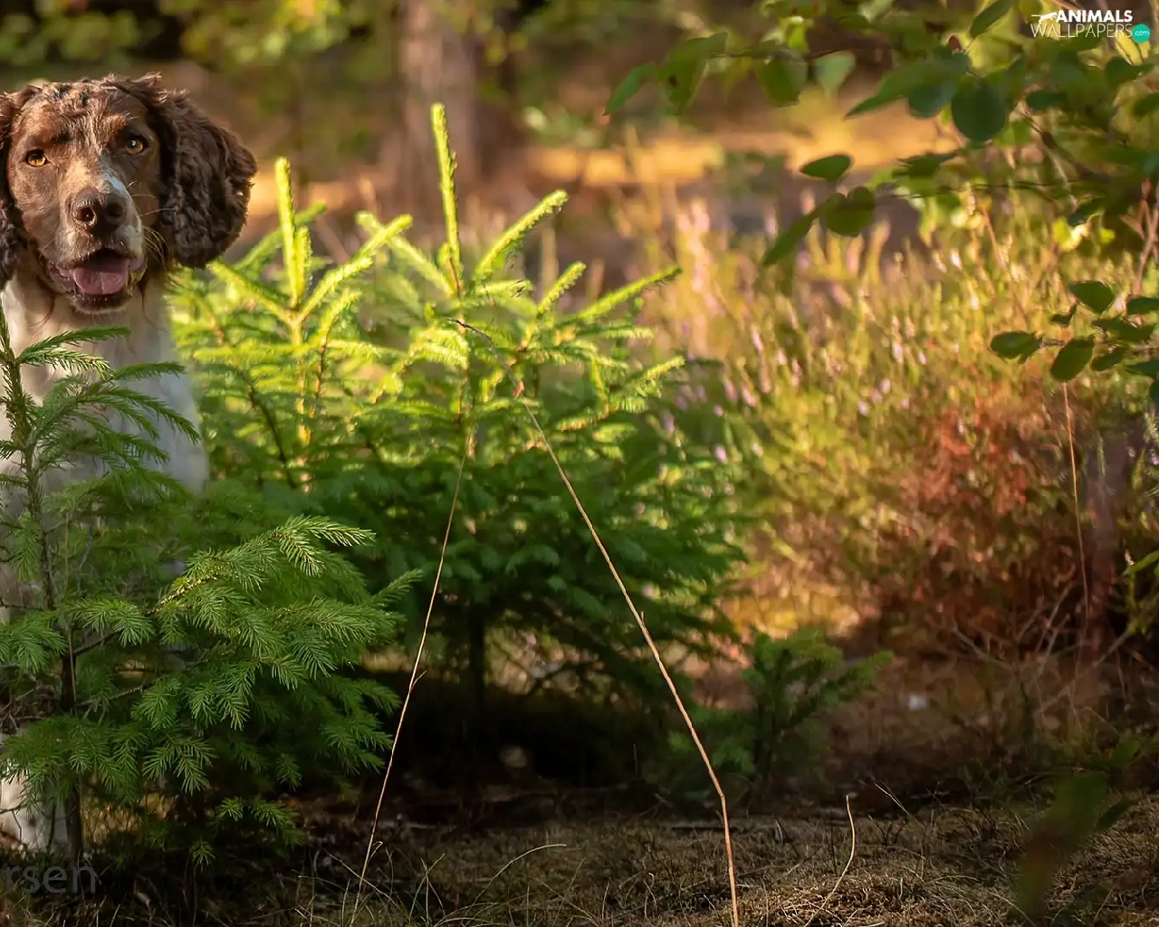 Sapling, English Springer Spaniel, Meadow, forest, dog, Spruces, Flowers