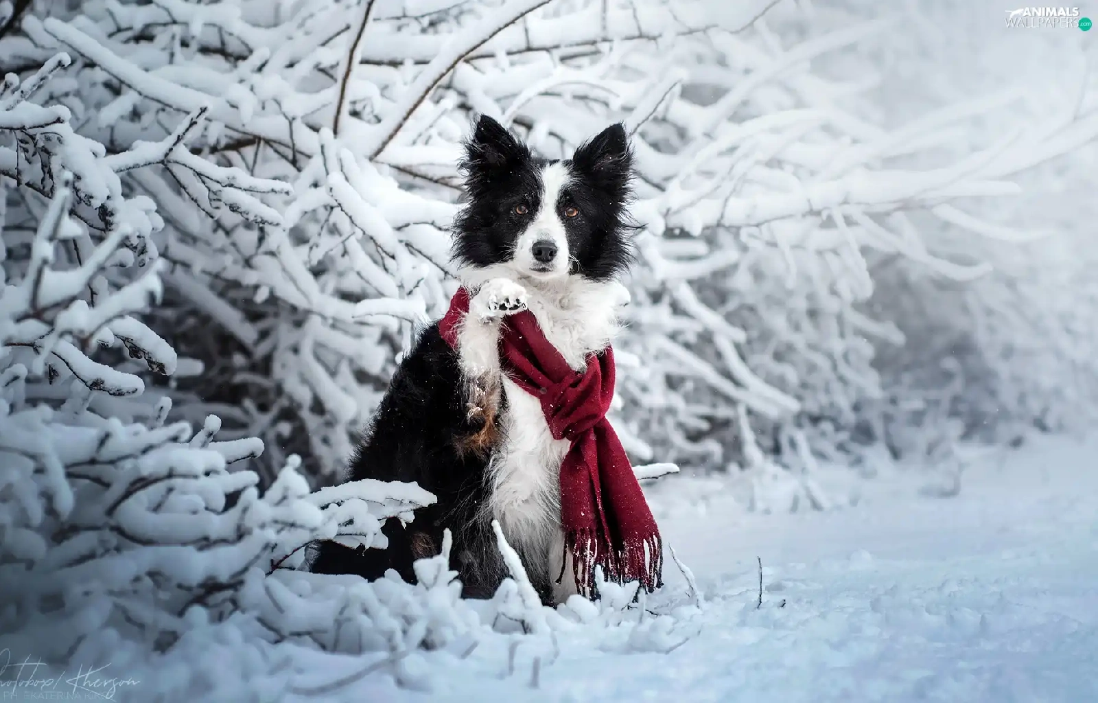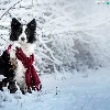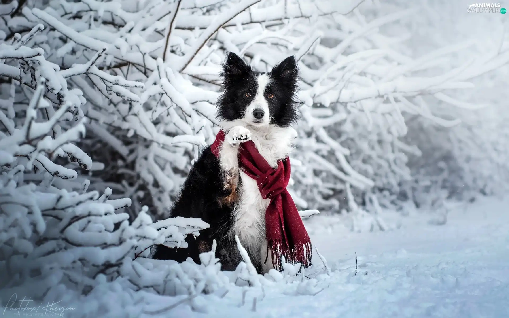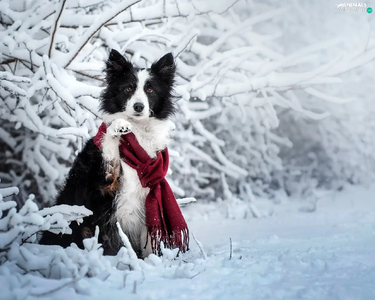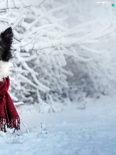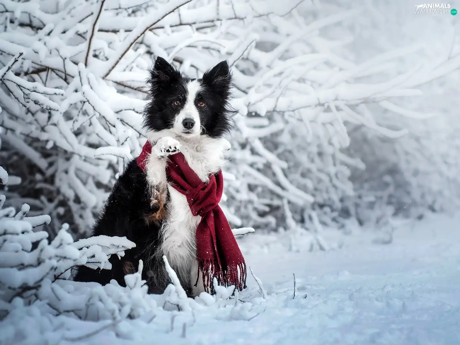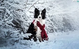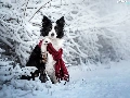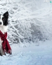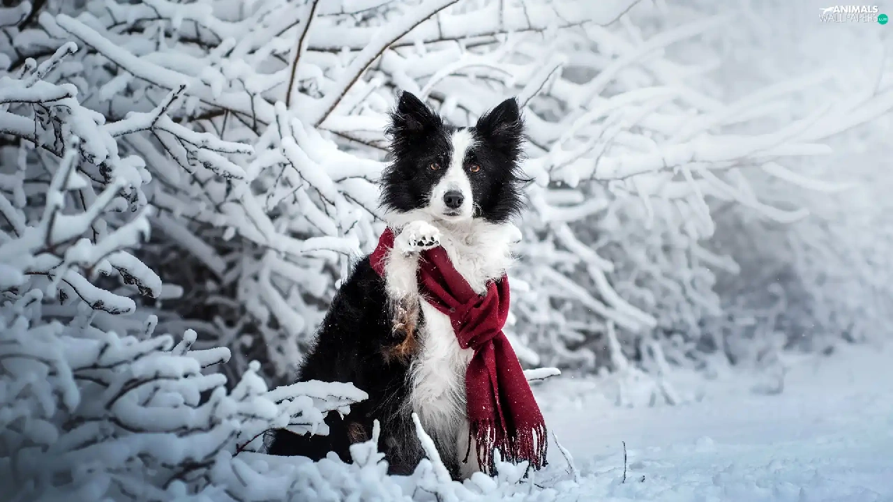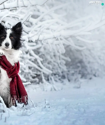 Scarf, dog, Twigs, Border Collie, White and Black, Snowy, winter