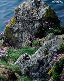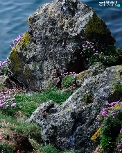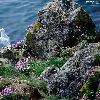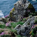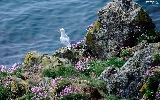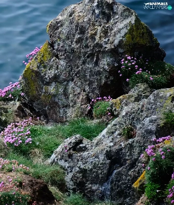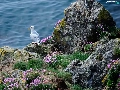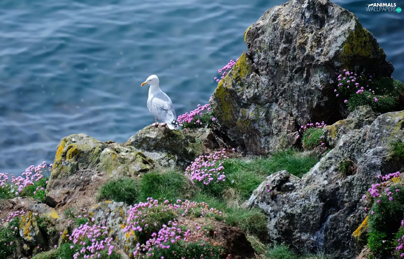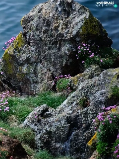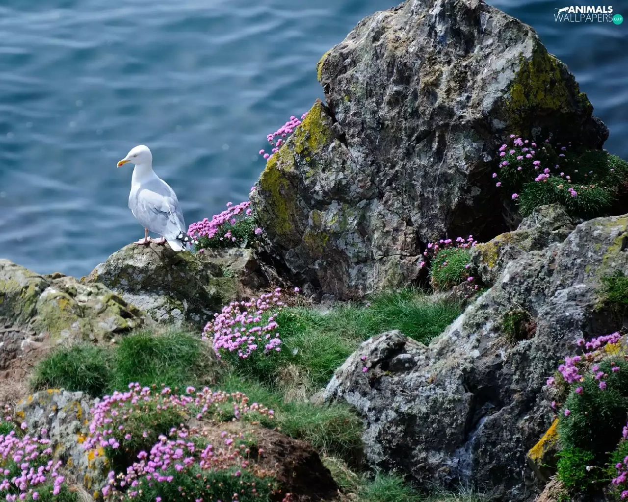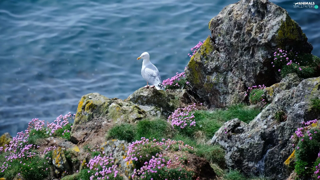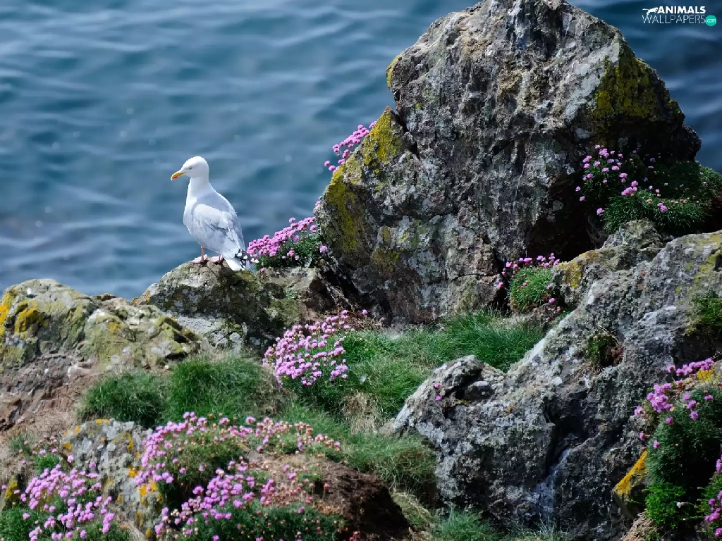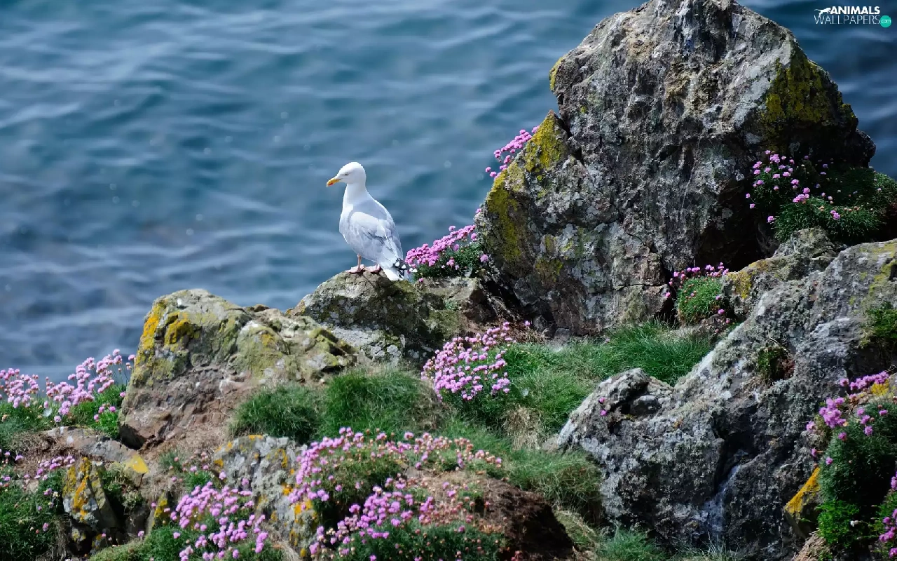 Rocks, sea, Bird, seagull, Flowers, grass