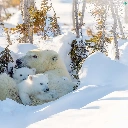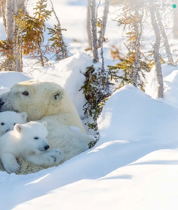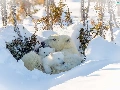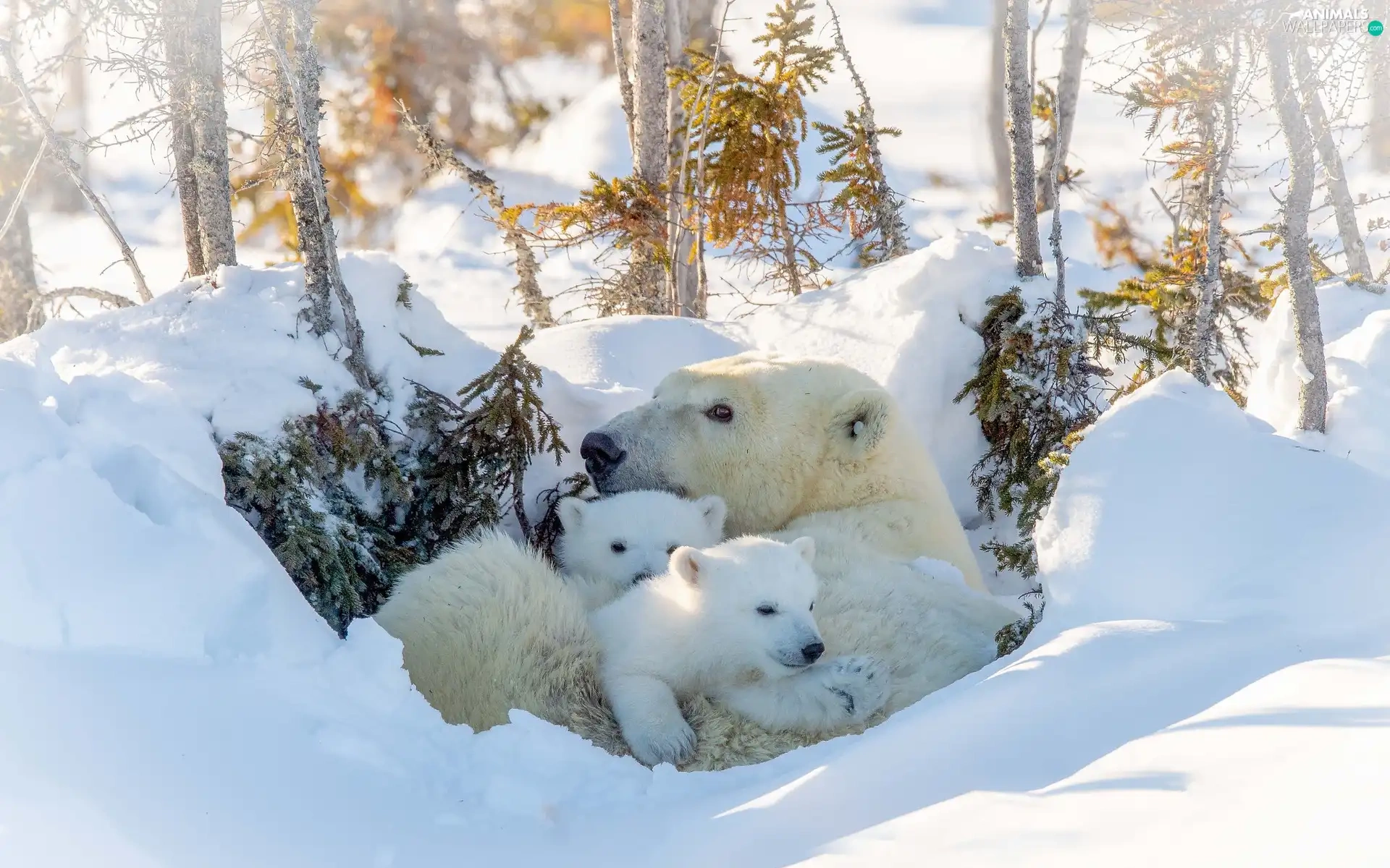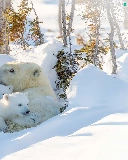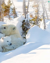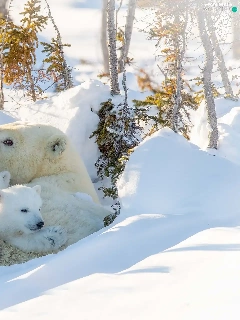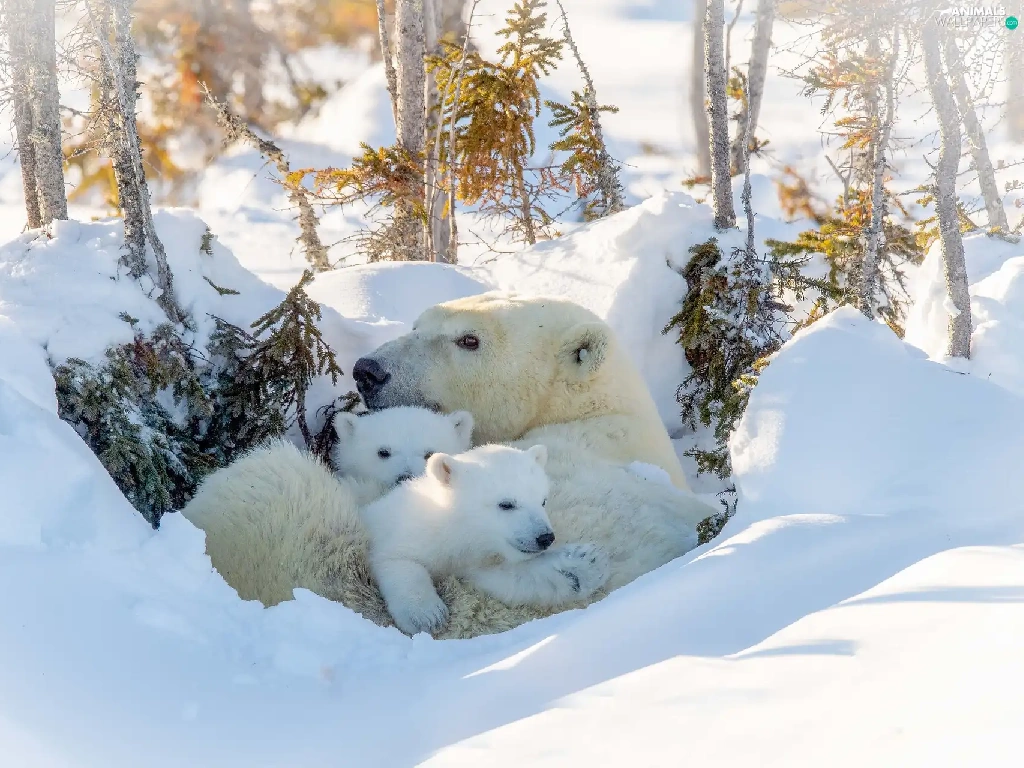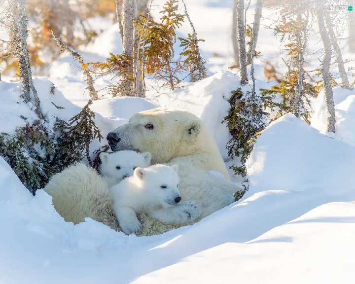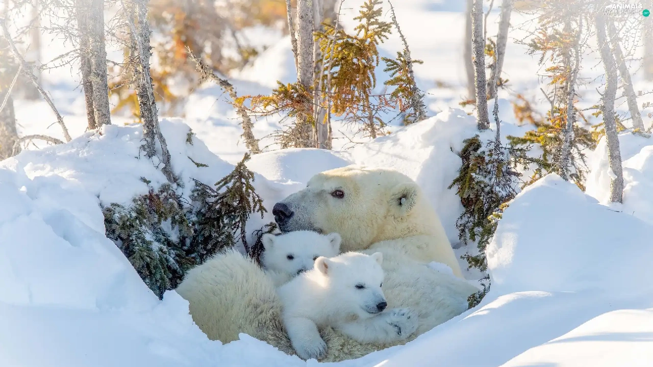she-bear, winter, trees, viewes, Little bears, Polar Bears