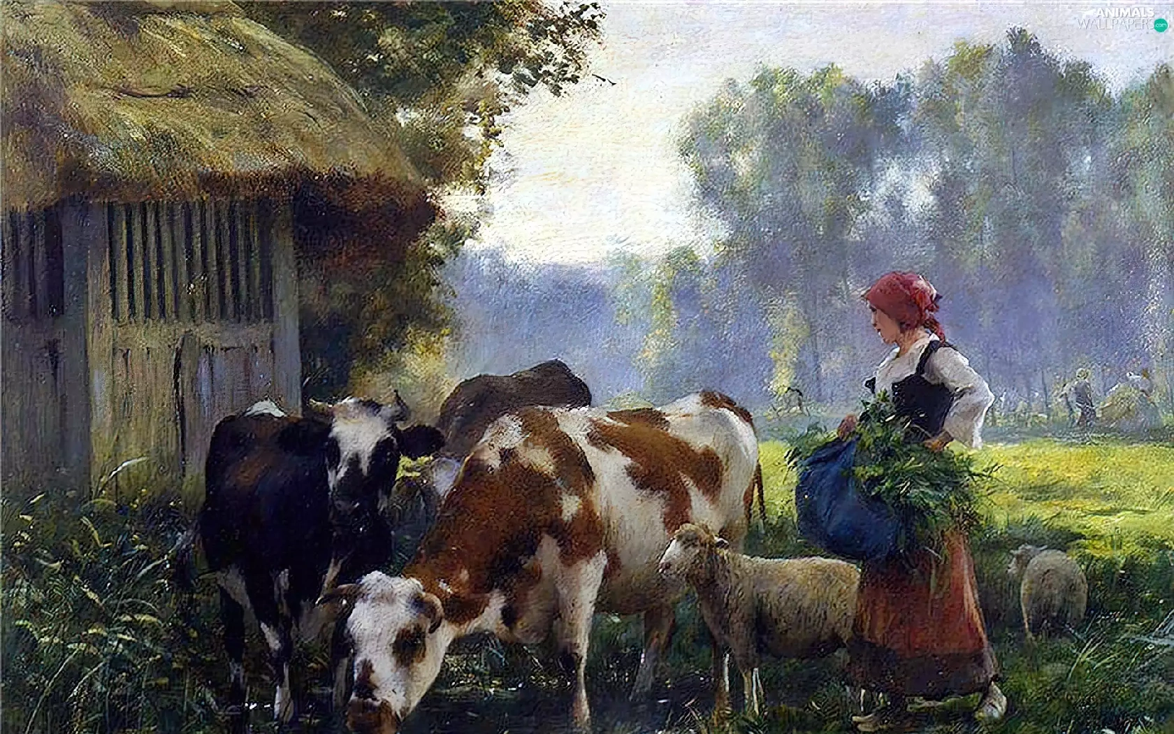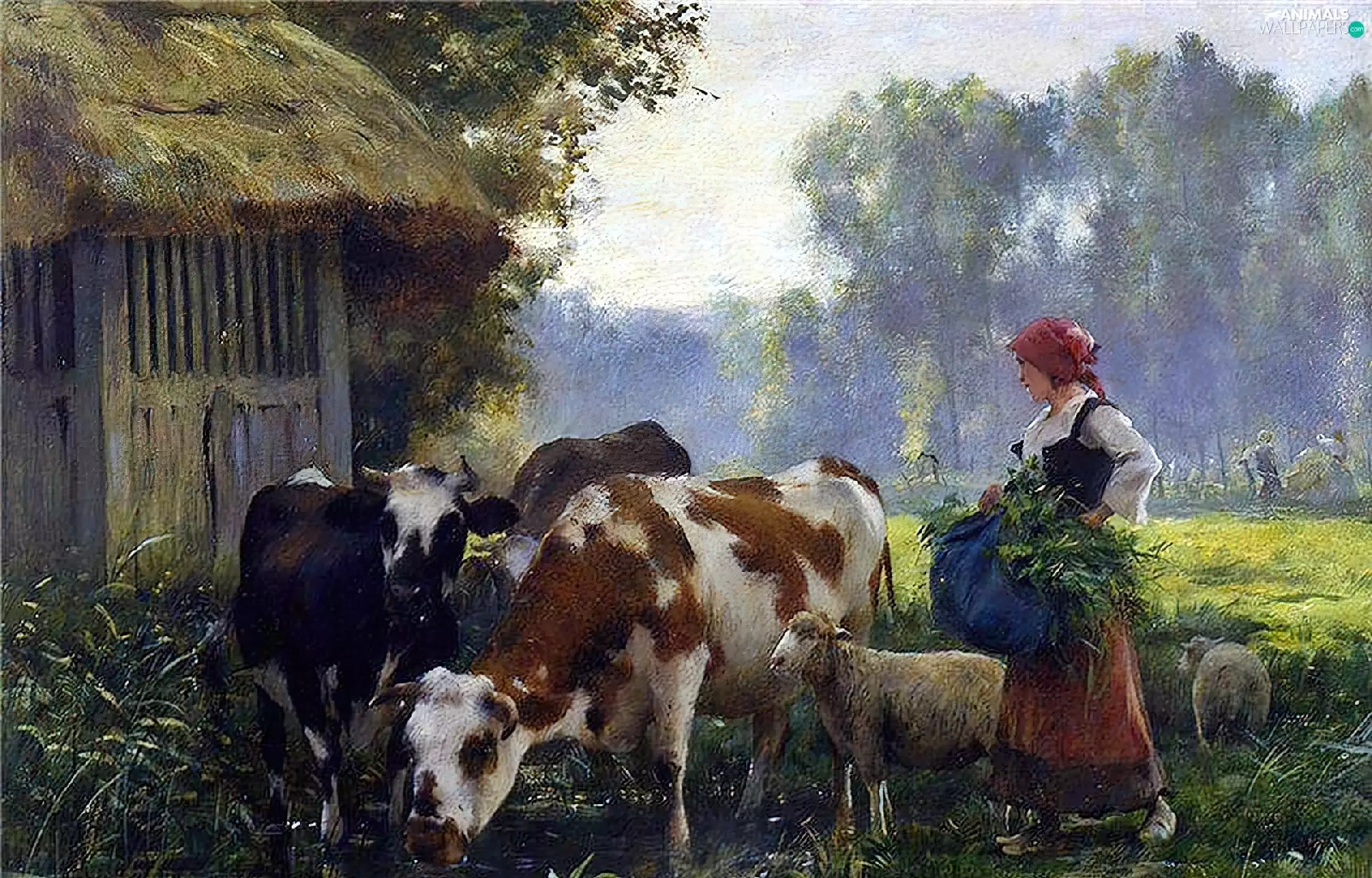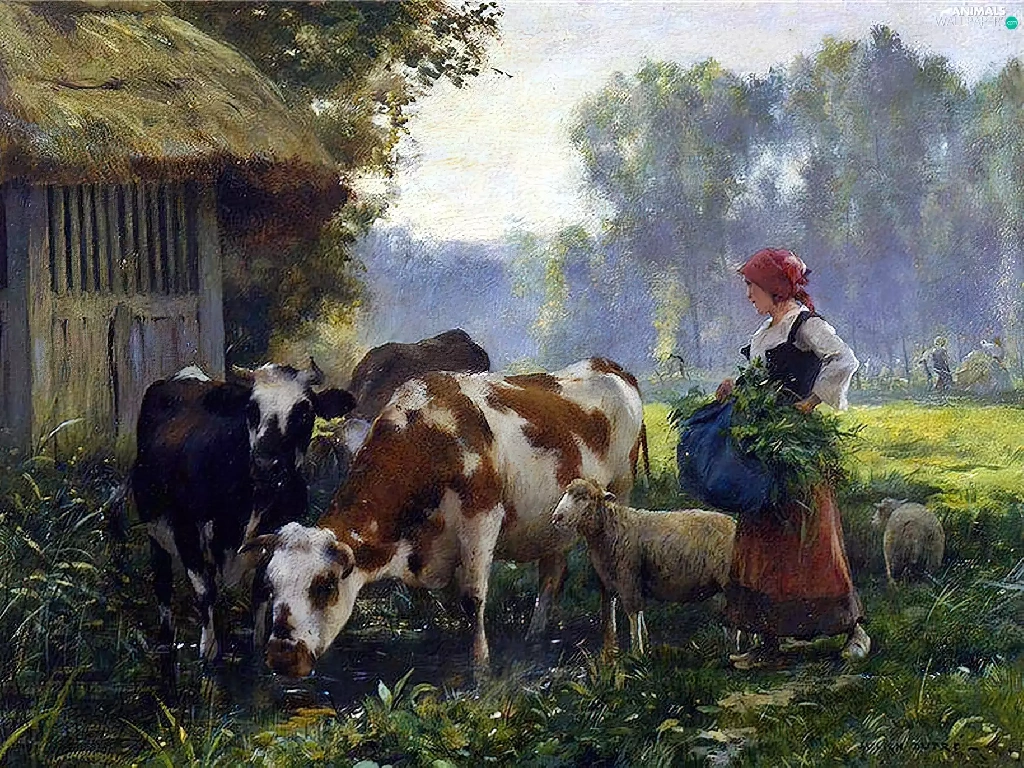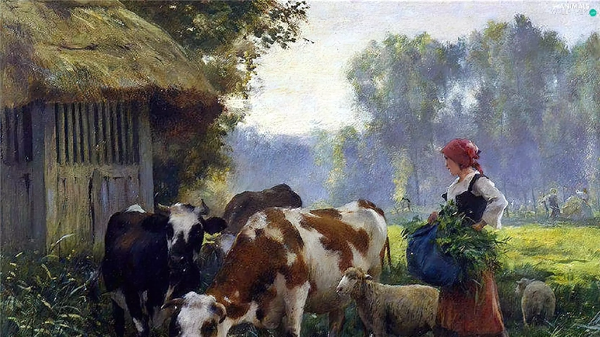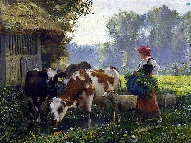 Cows, forest, Meadow, Sheep