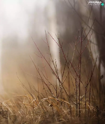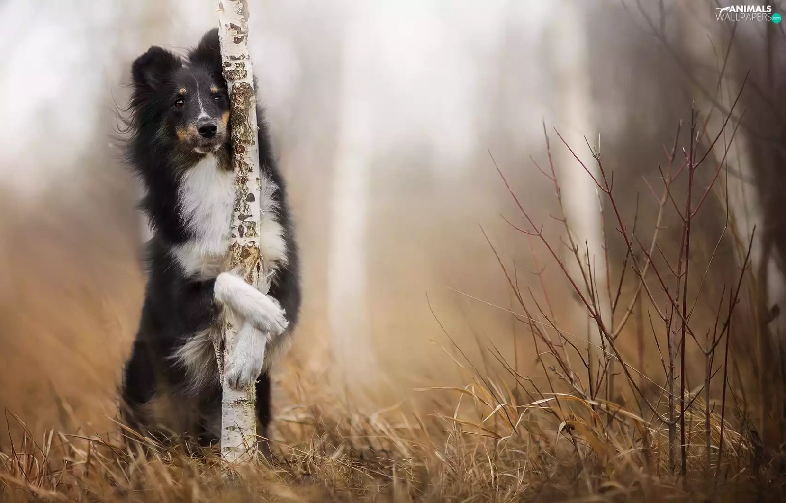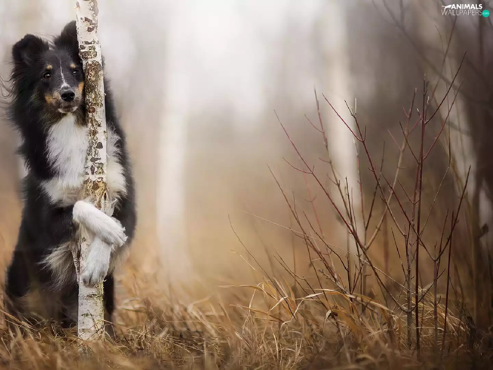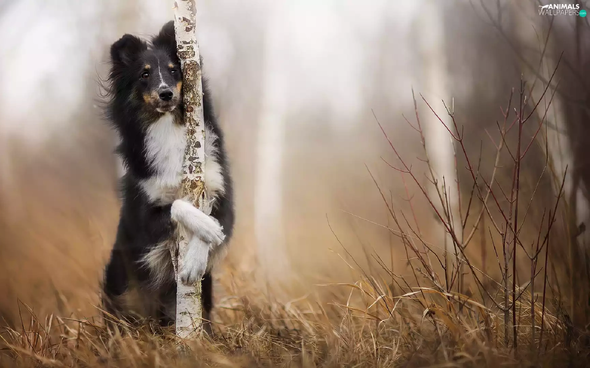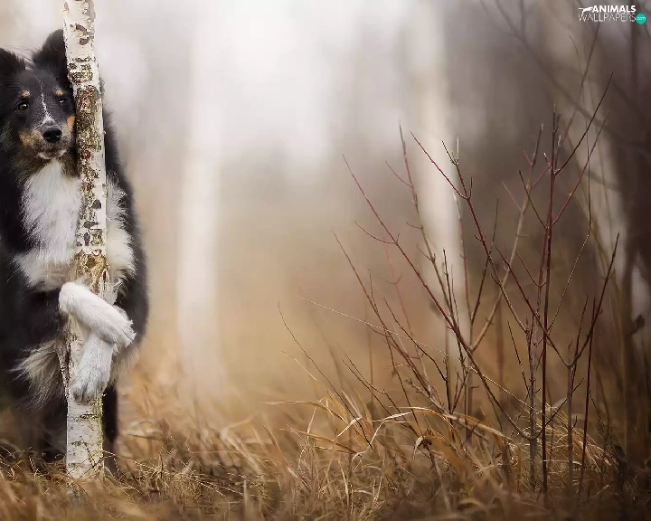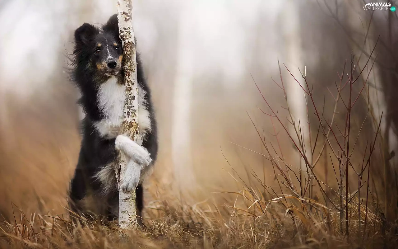 Bush, grass, shetland Sheepdog, birch, dog