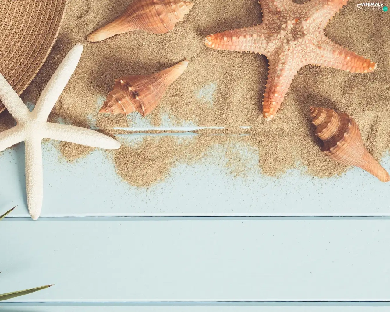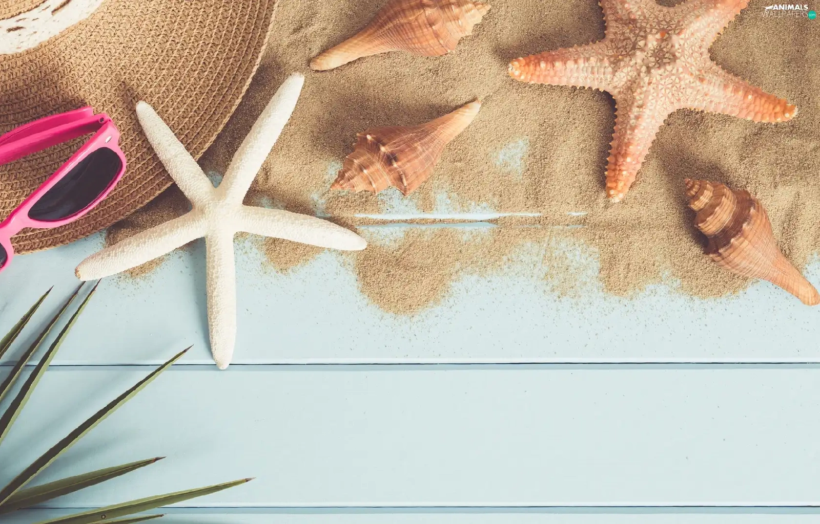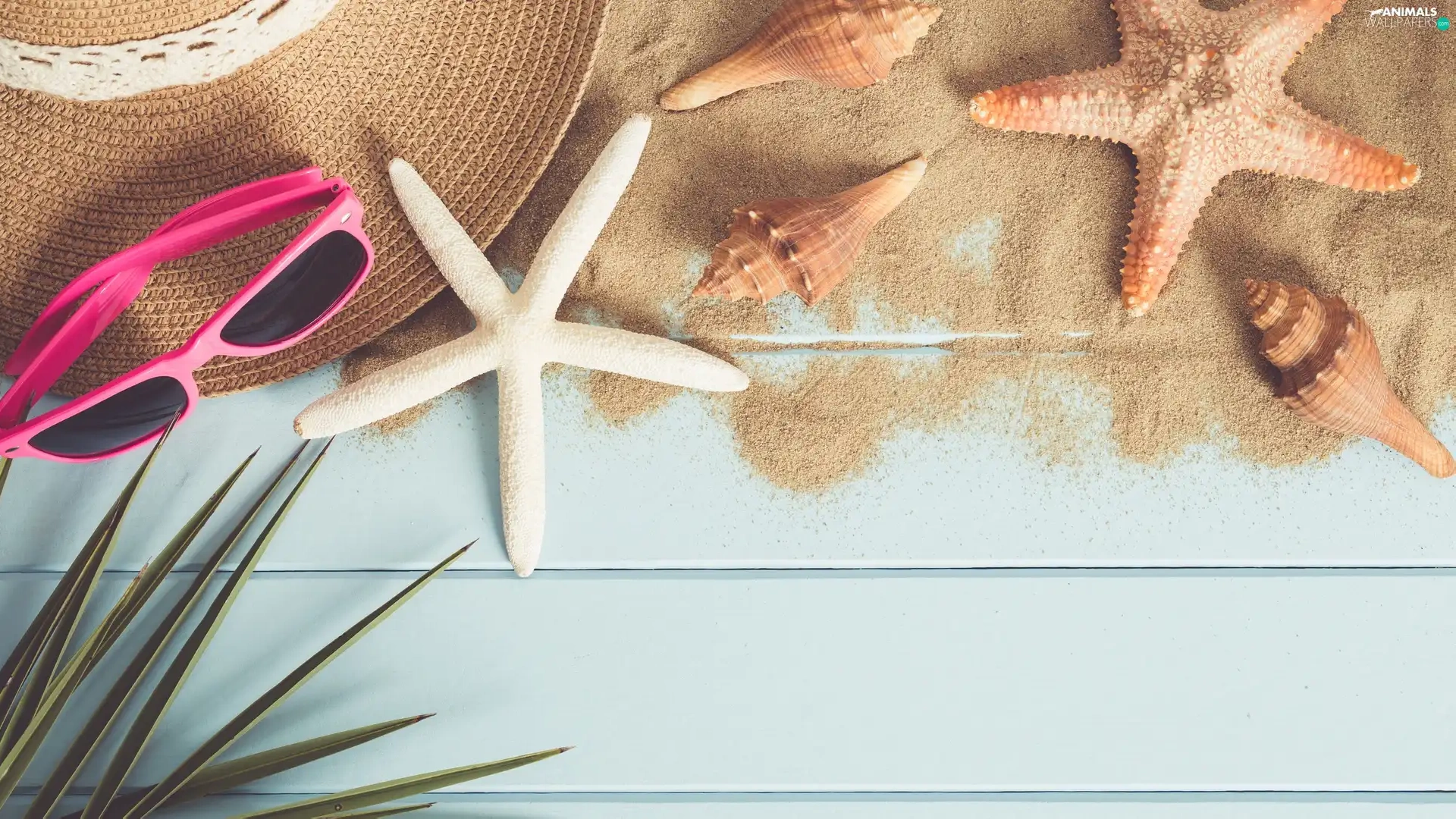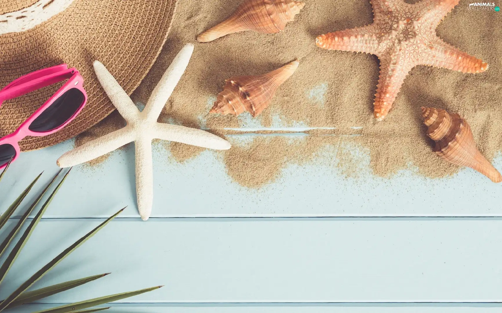 starfish, Glasses, composition, Shells, Hat, Sand, holiday