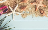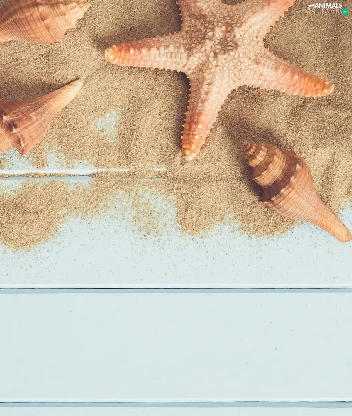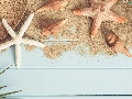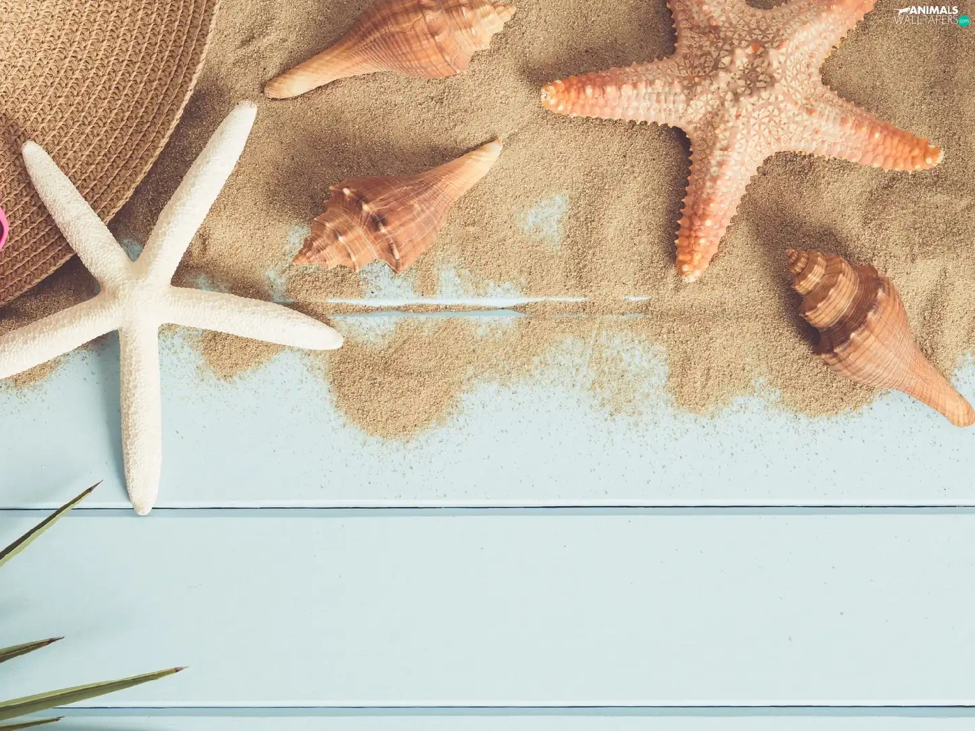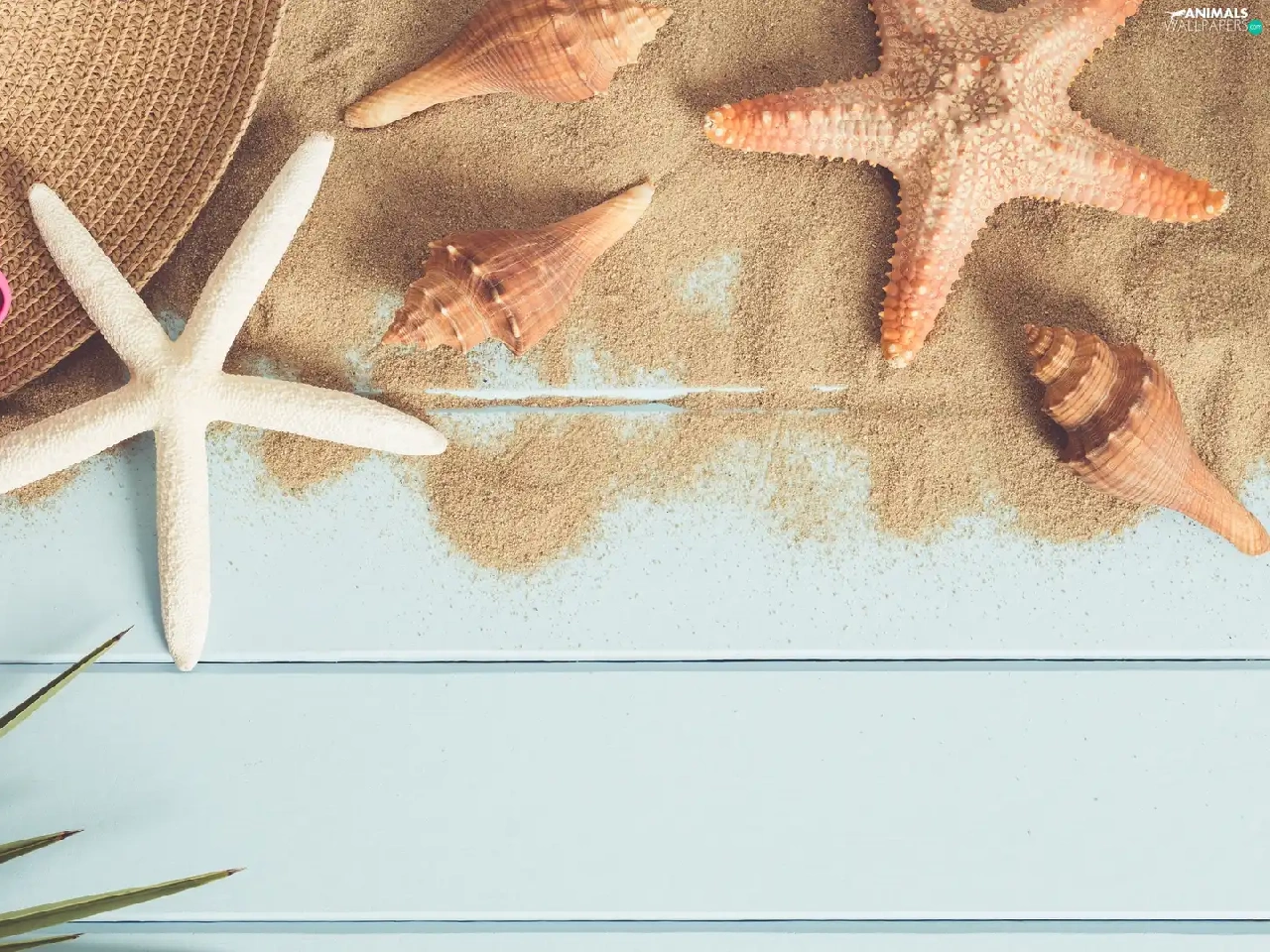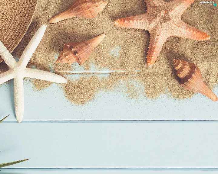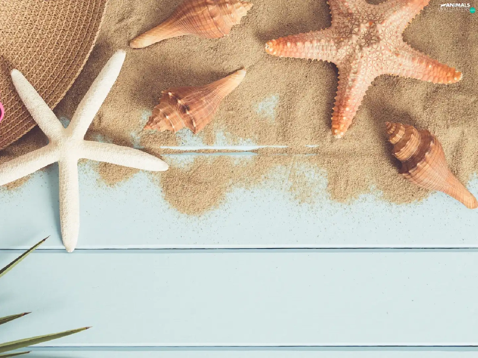 starfish, Glasses, composition, Shells, Hat, Sand, holiday