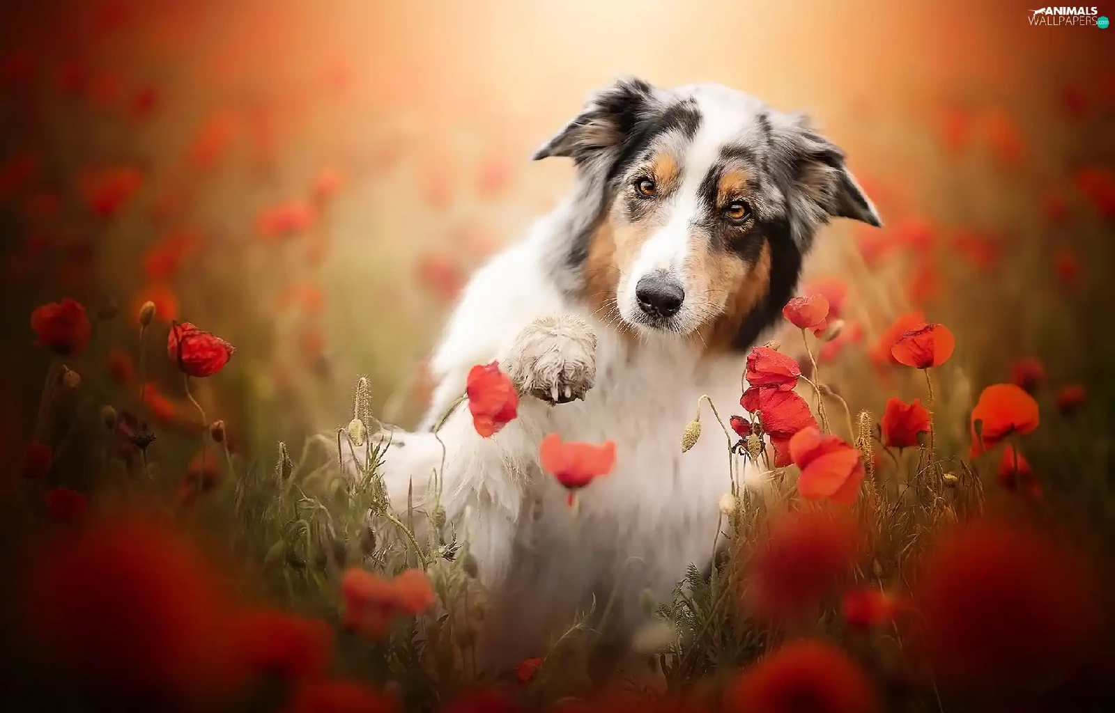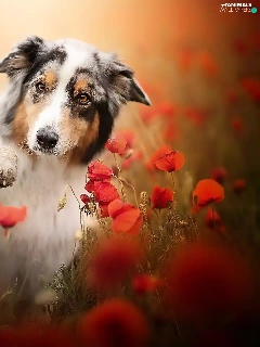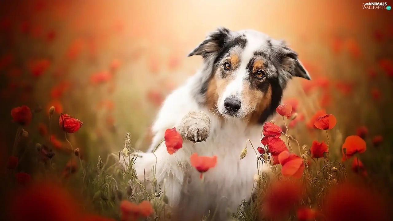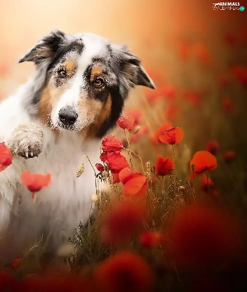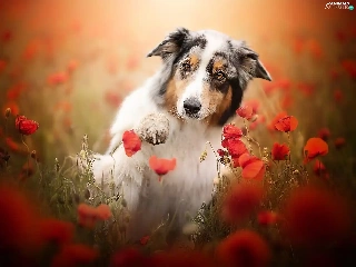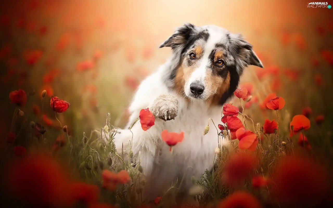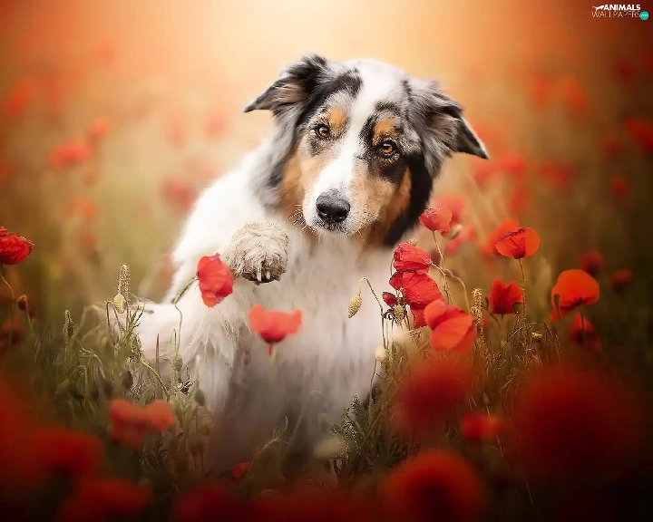 pud, papavers, Australian Shepherd, The raised, dog