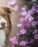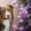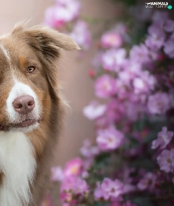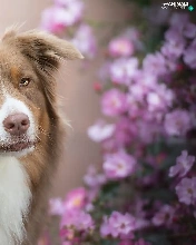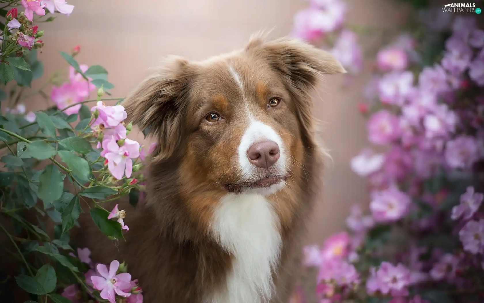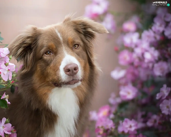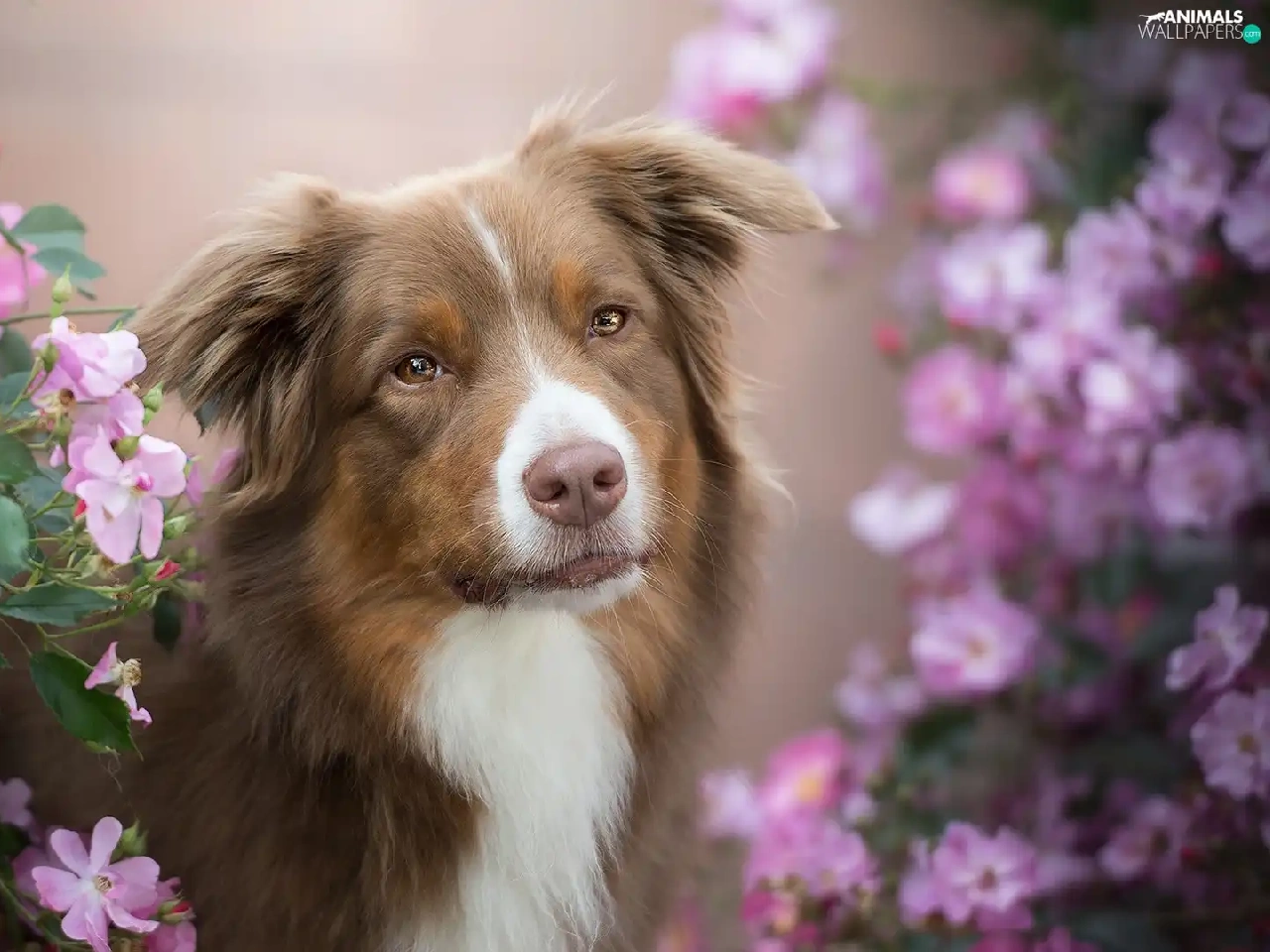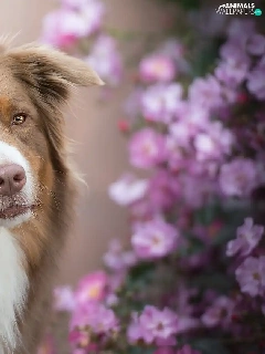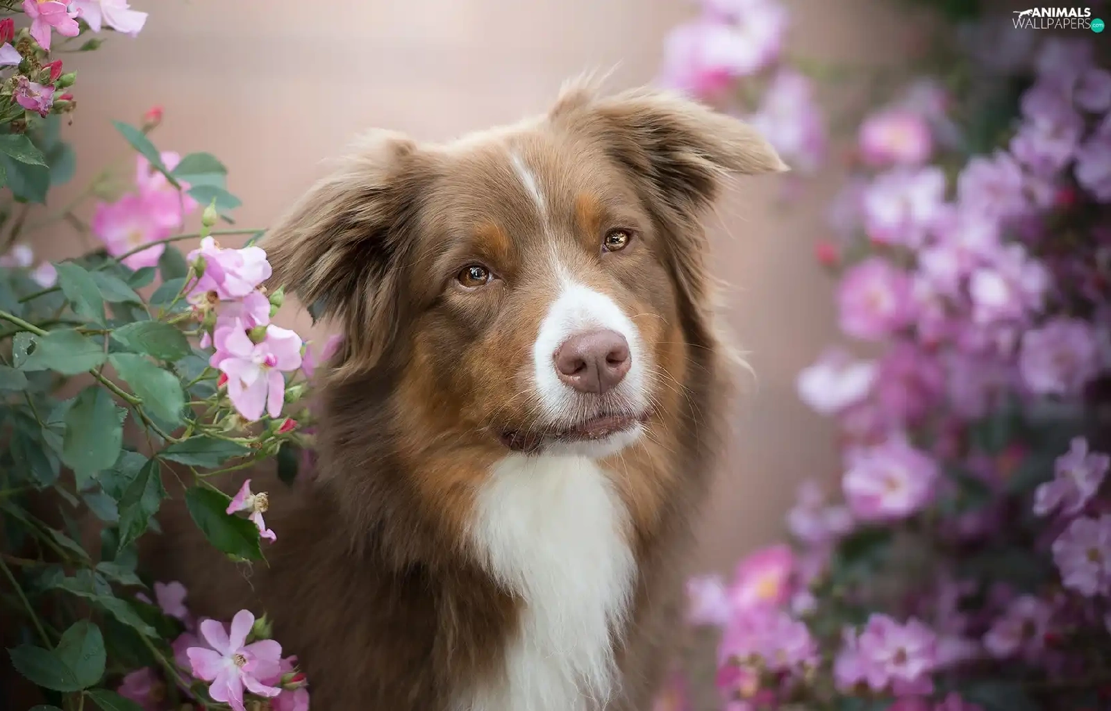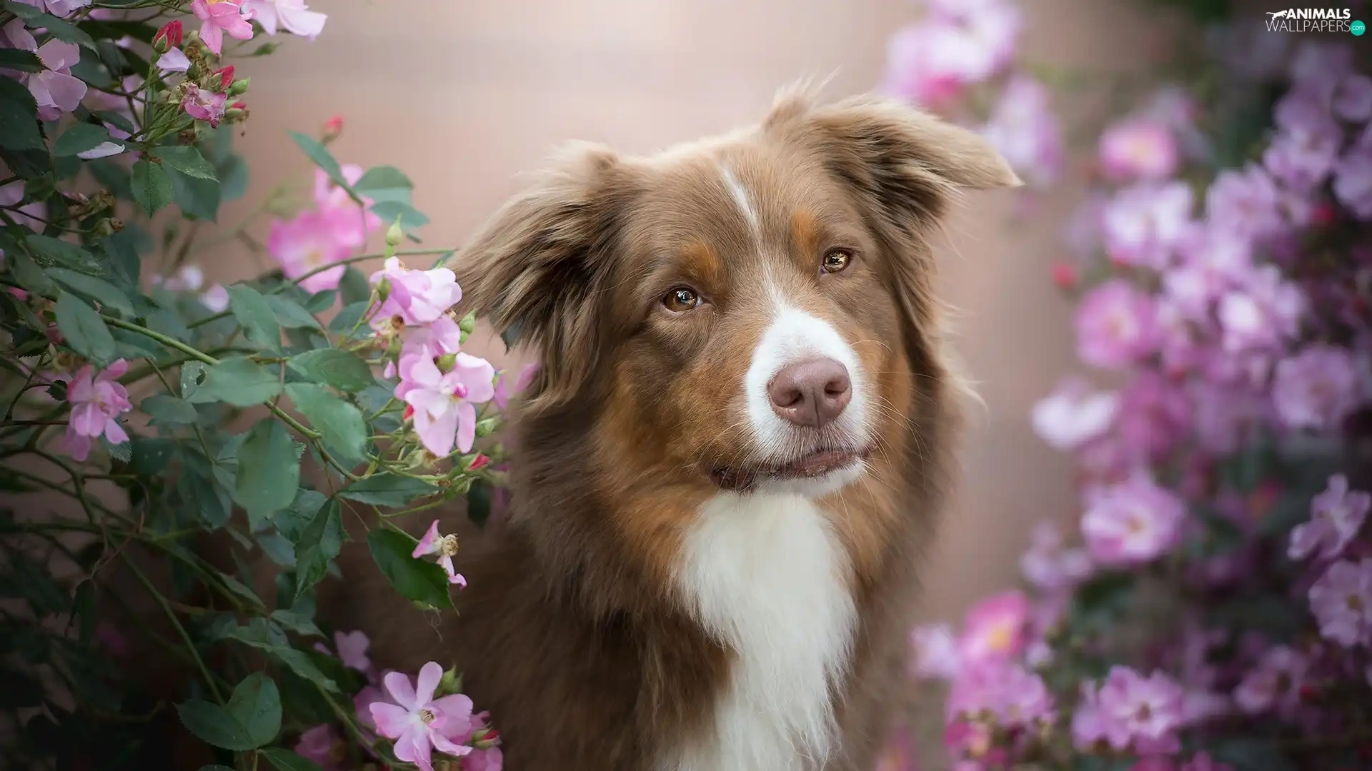 Bush, Flowers, Australian Shepherd, muzzle, dog
