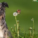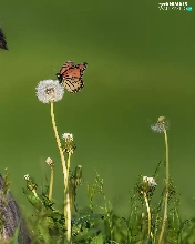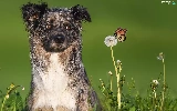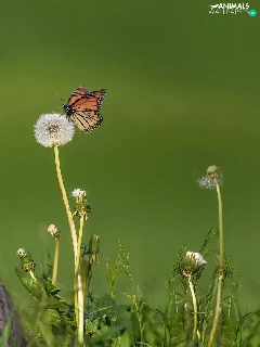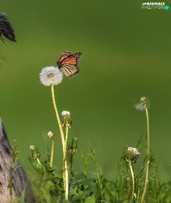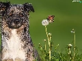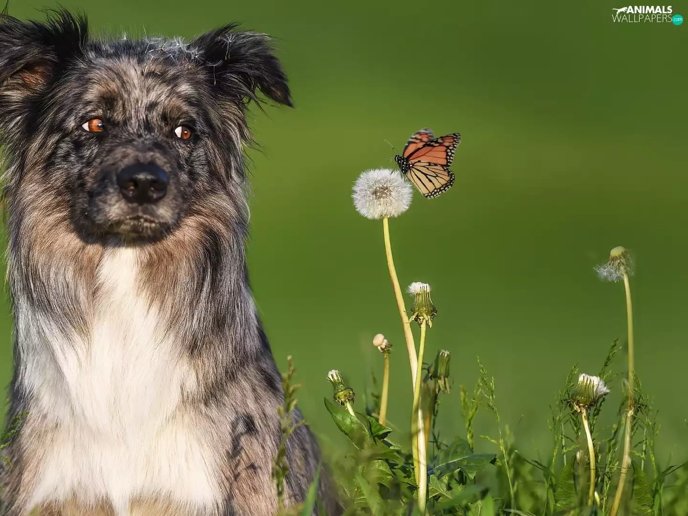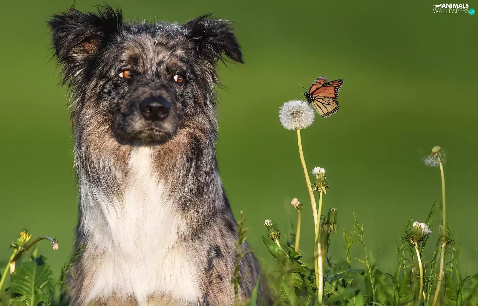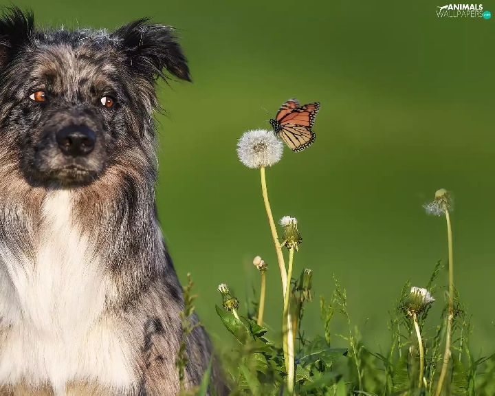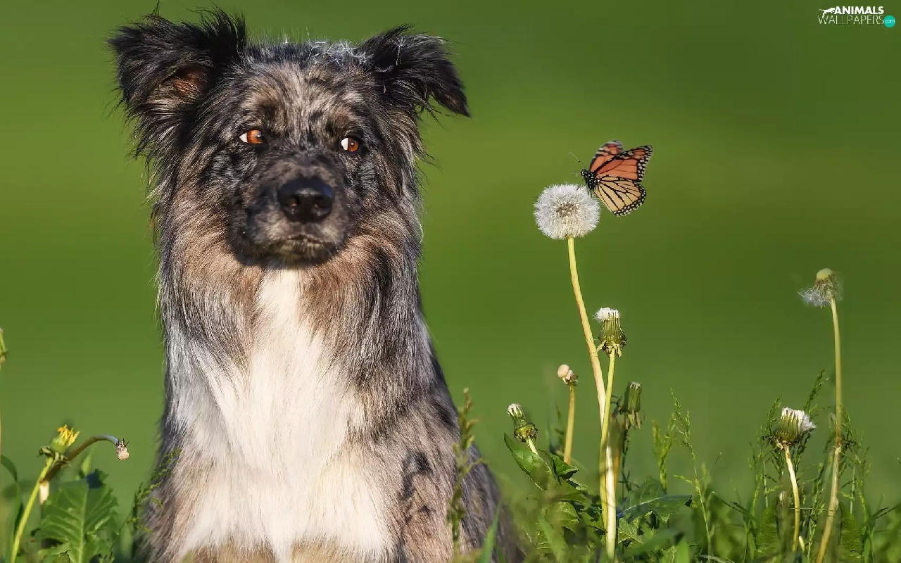 dandelion, butterfly, Australian Shepherd, Flowers, dog