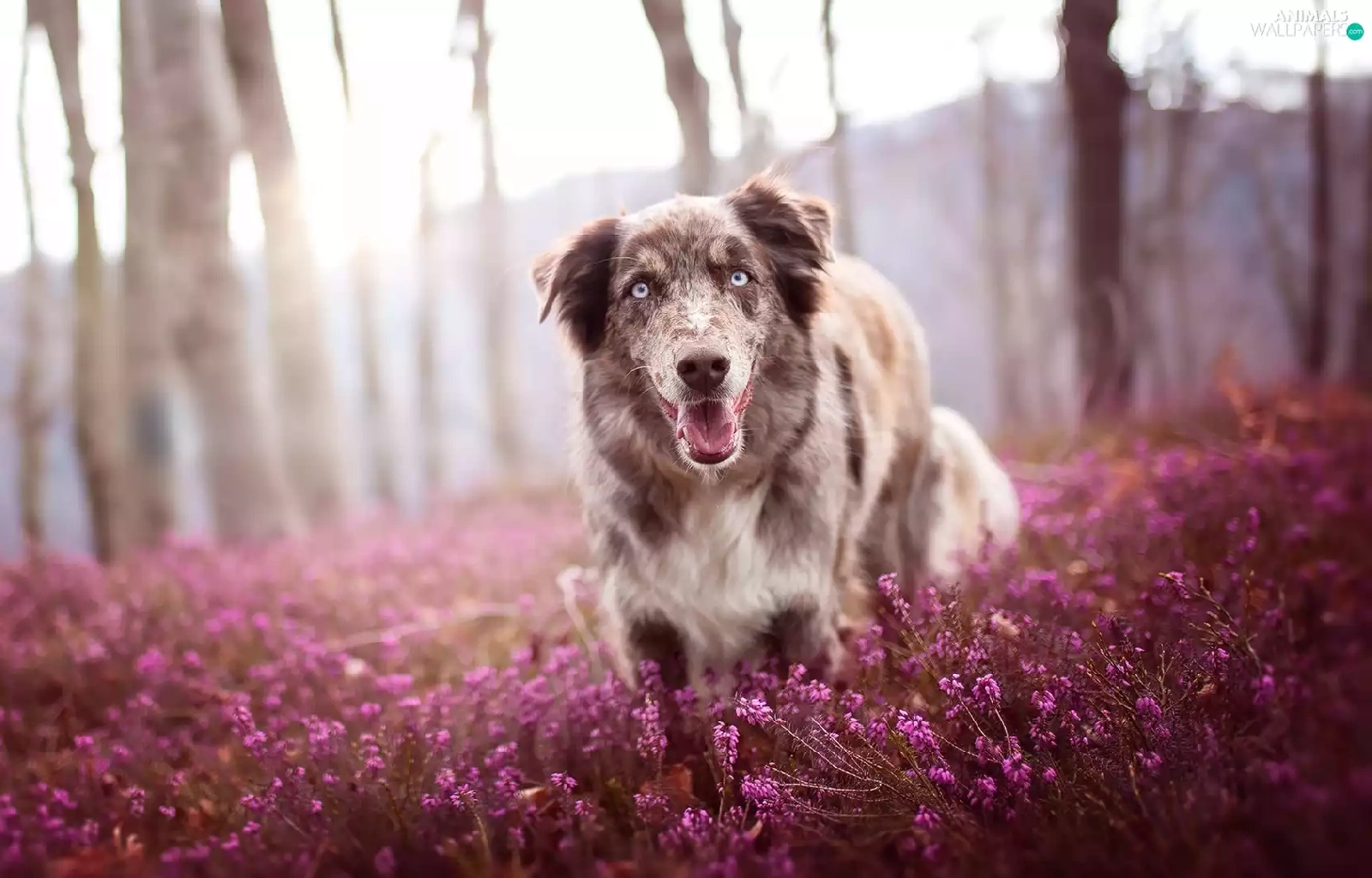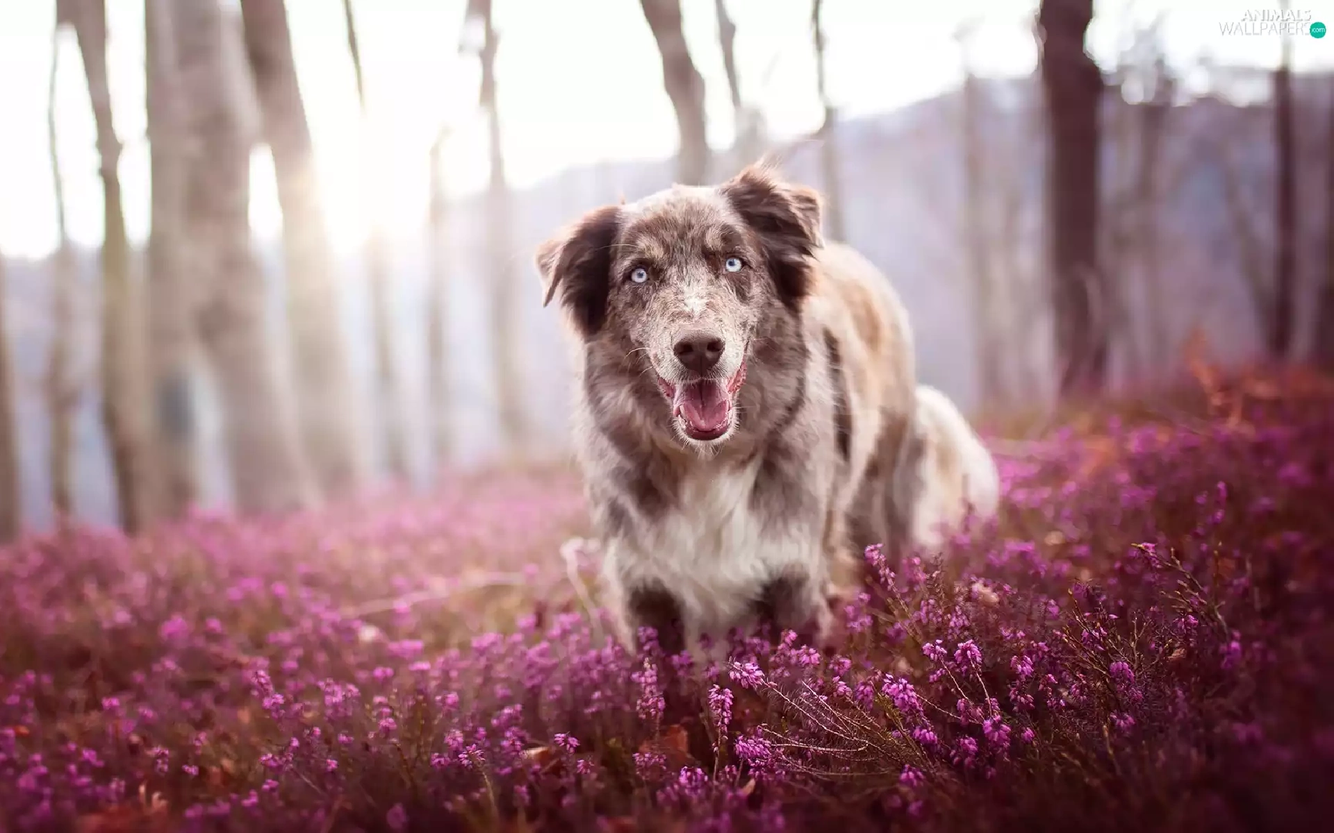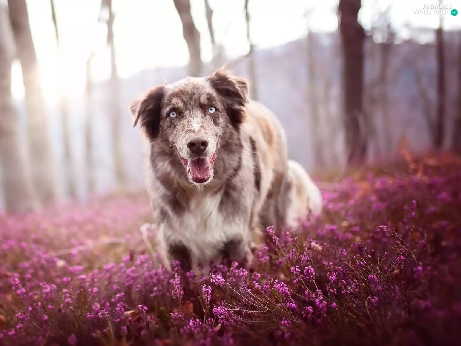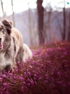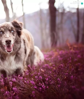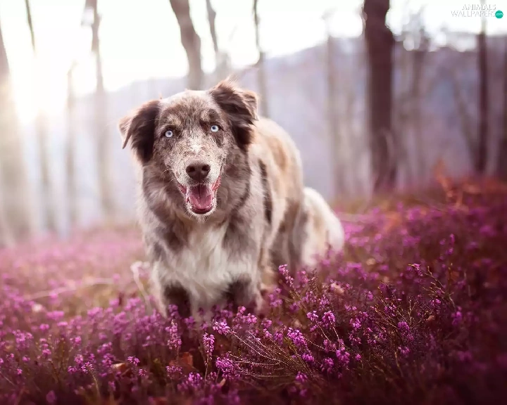 trees, viewes, Australian Shepherd, heather, dog