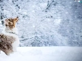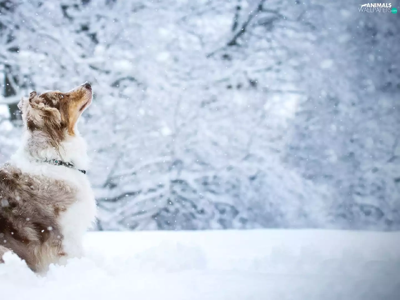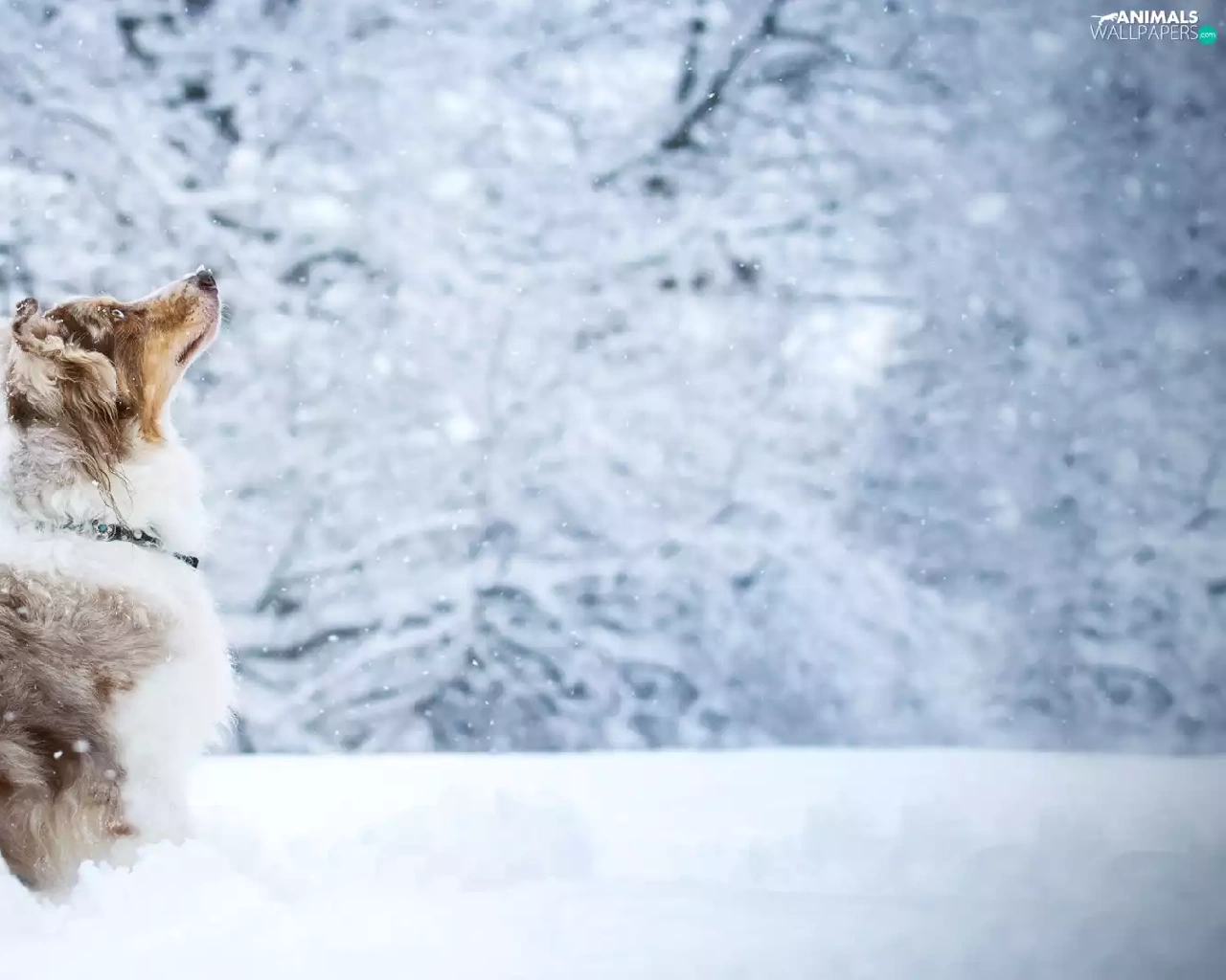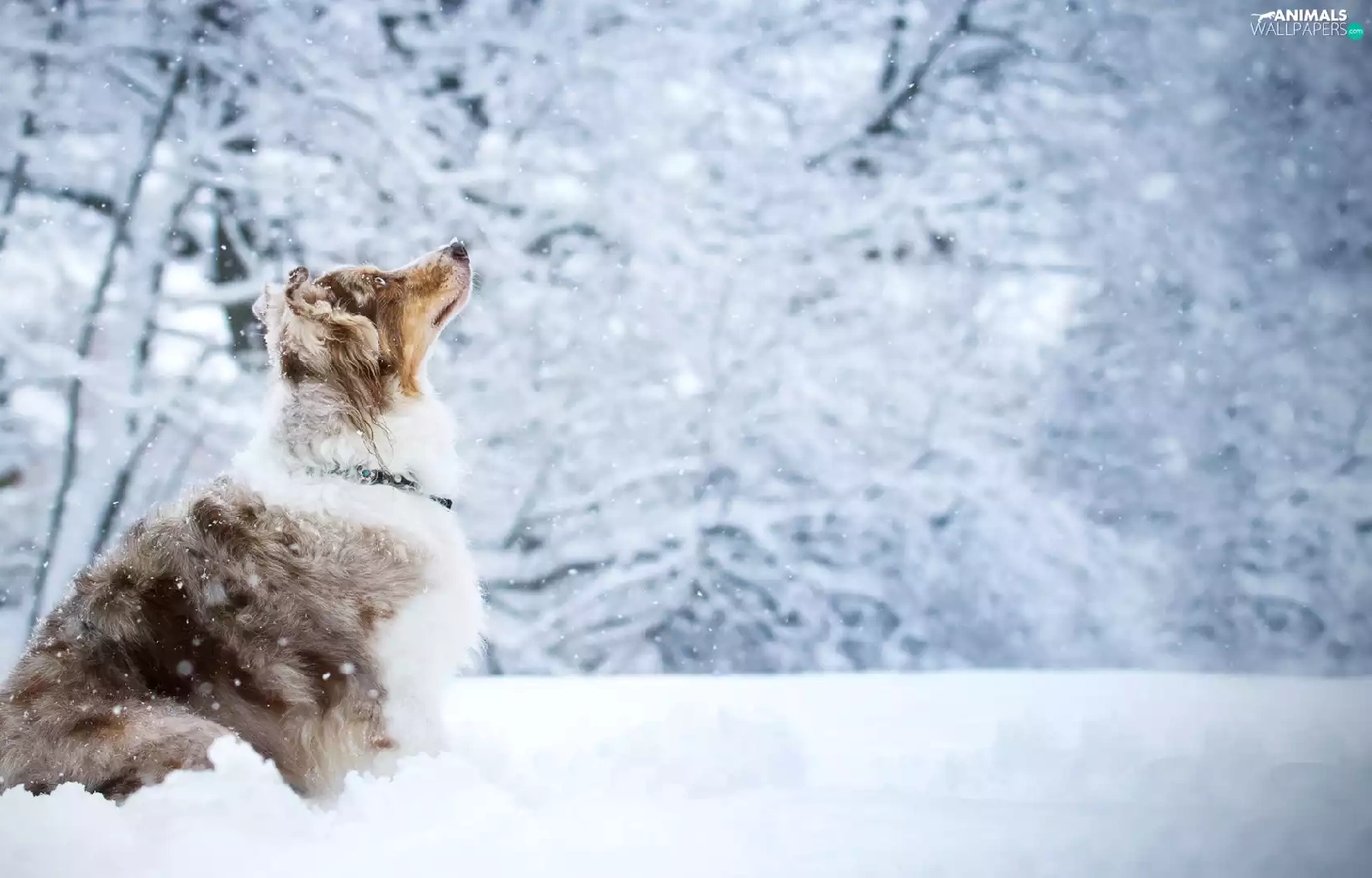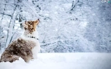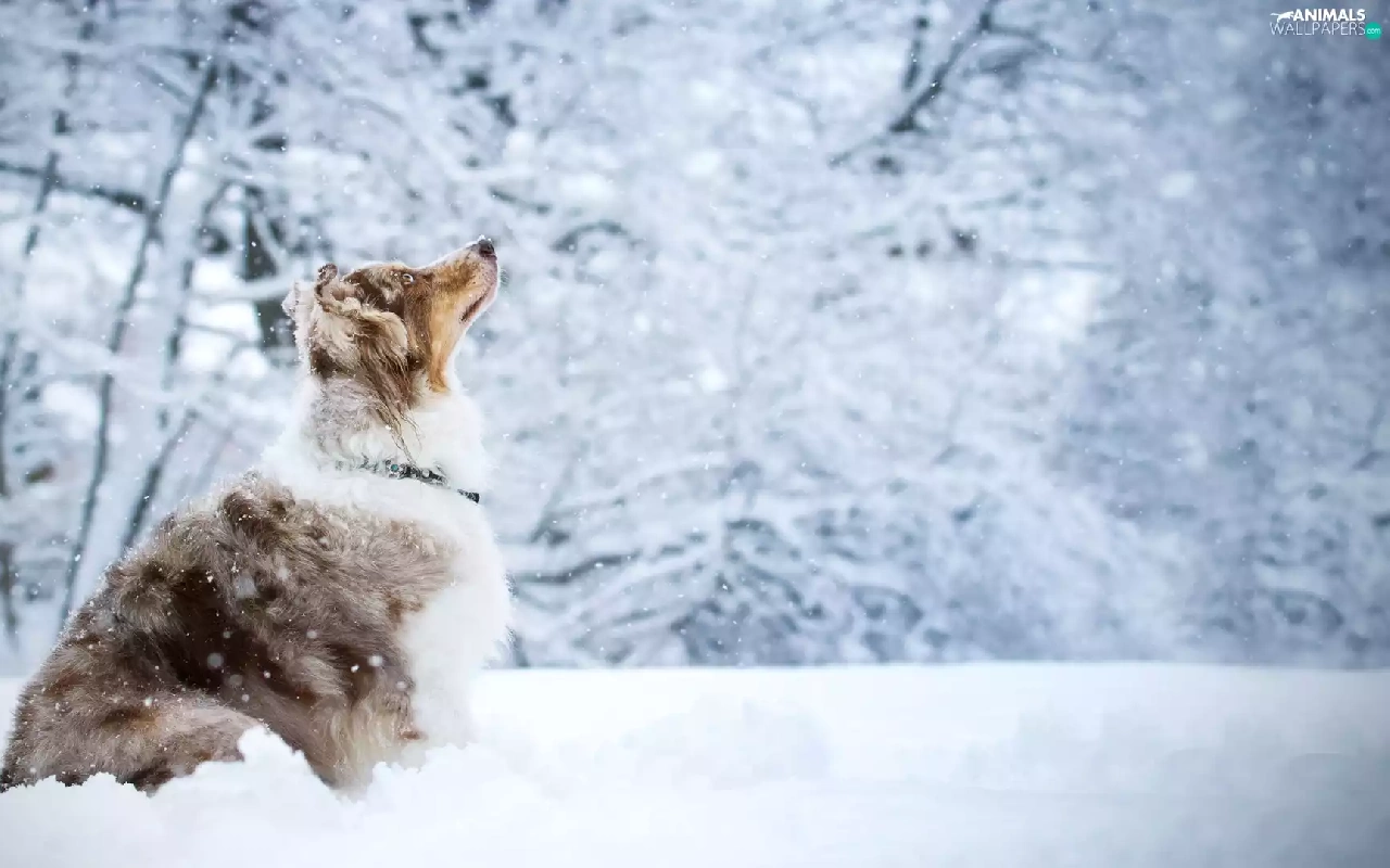 viewes, snow, Australian Shepherd, trees, dog