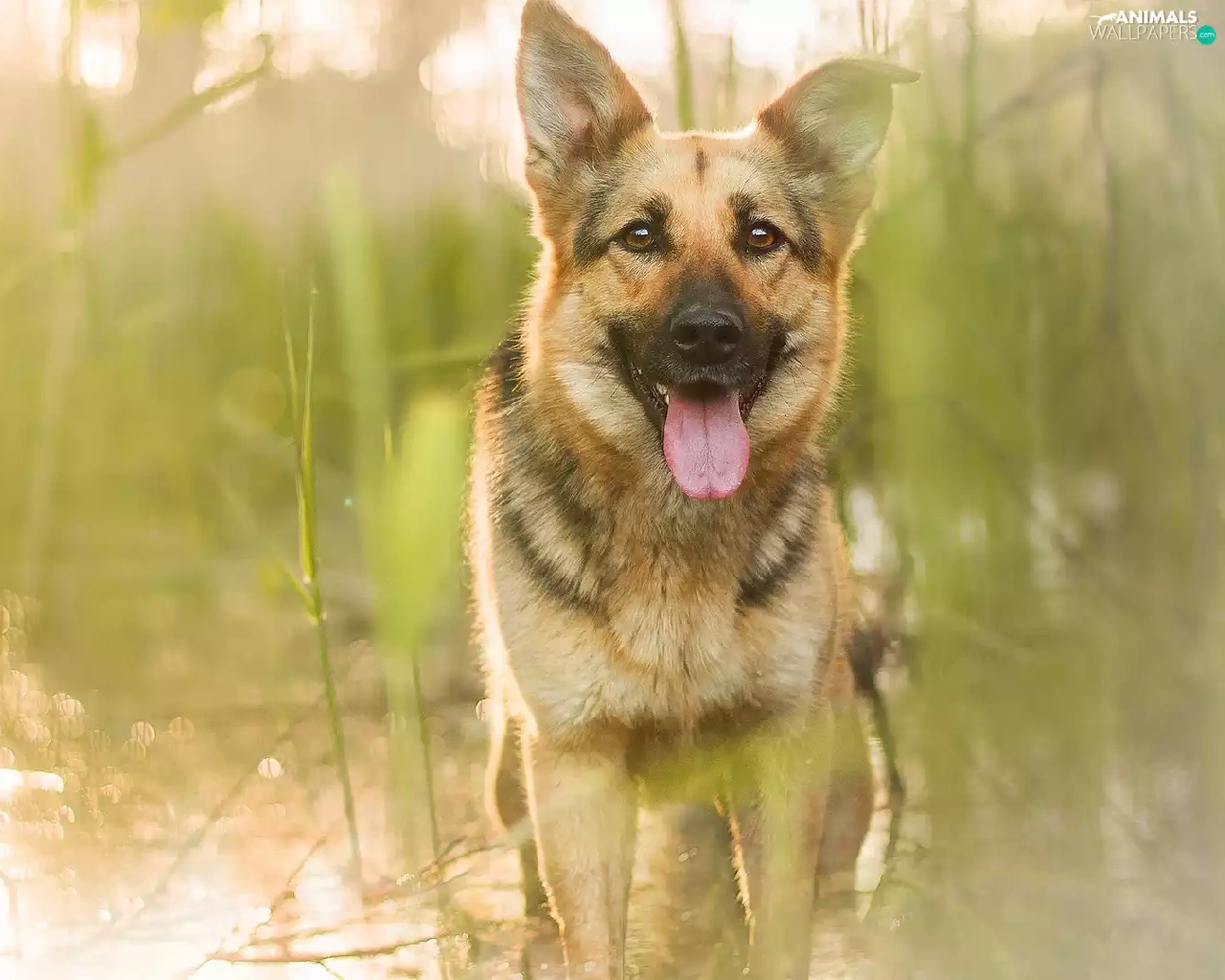 scrub, grass, German Shepherd, water, dog