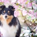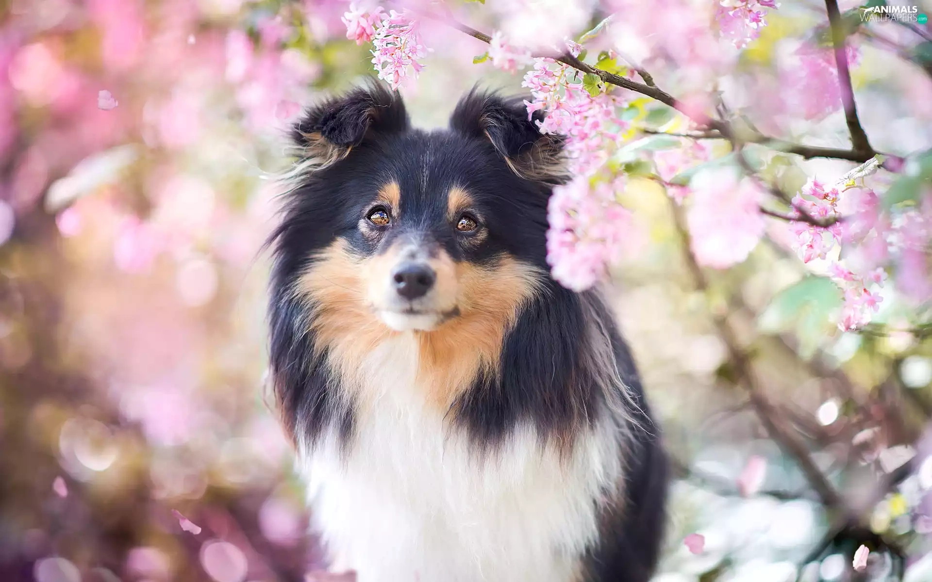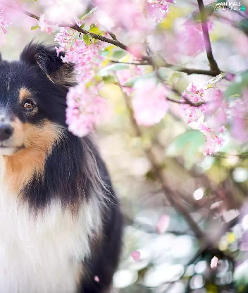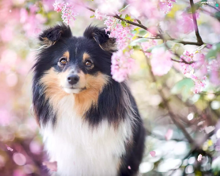 Pink, Flowers, Scottish Shepherd, Twigs, dog