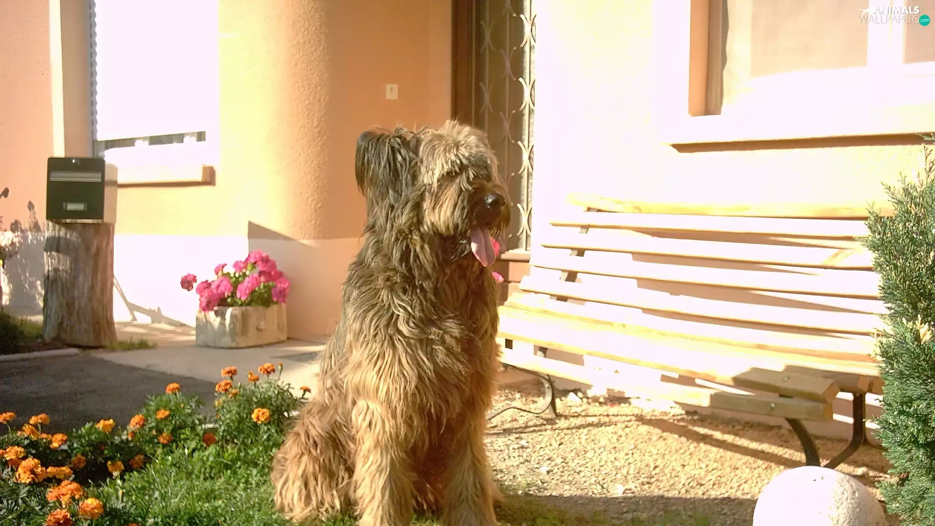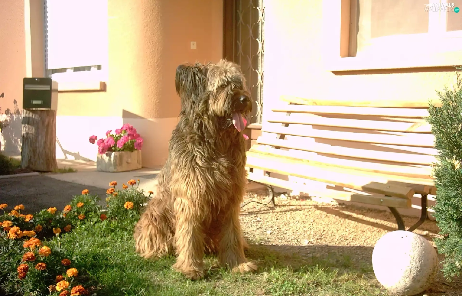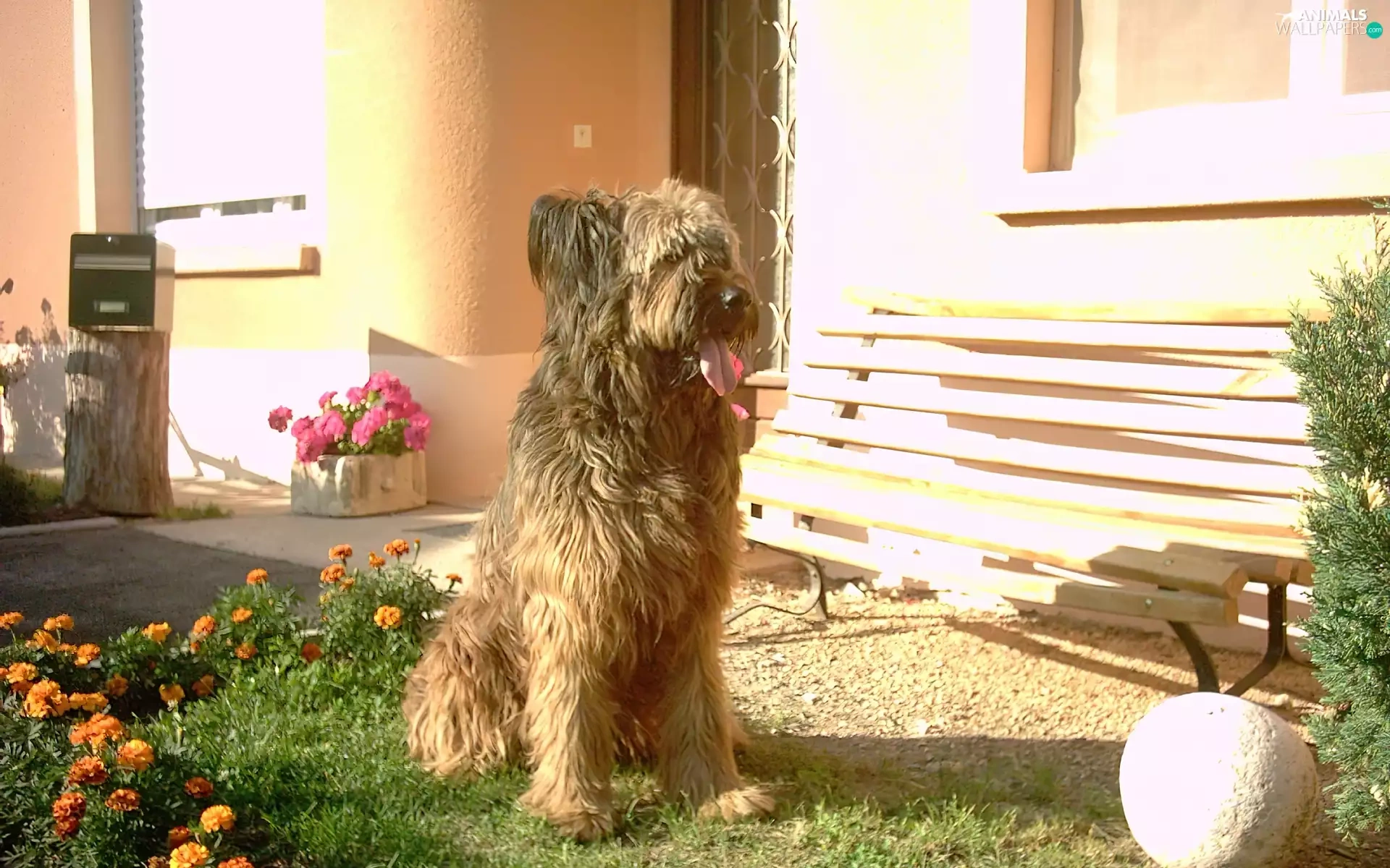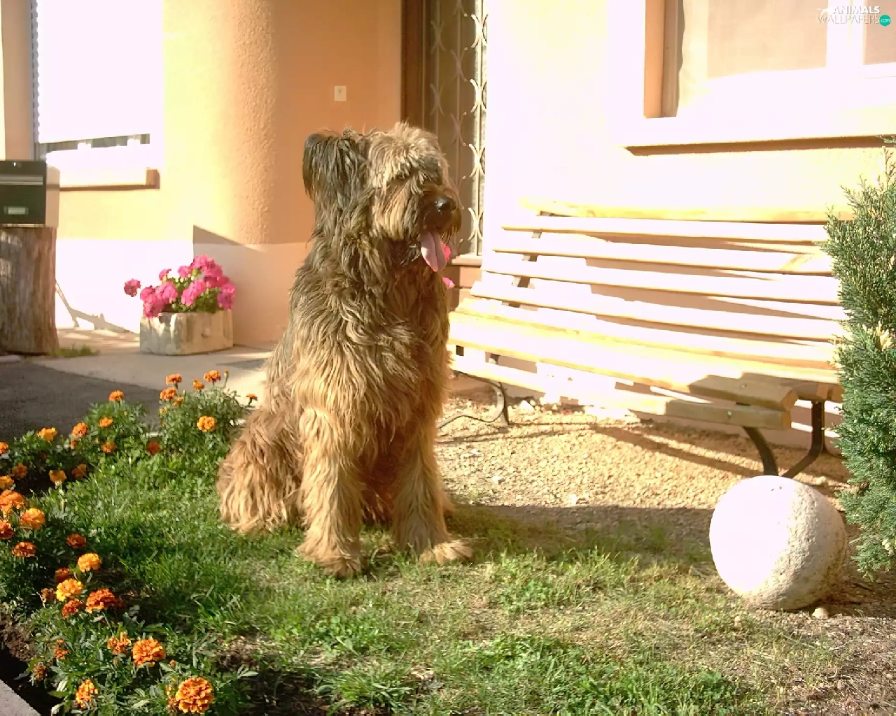 Flowers, Shepherd French Briard, Bench