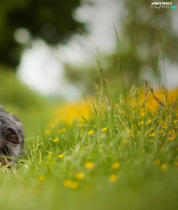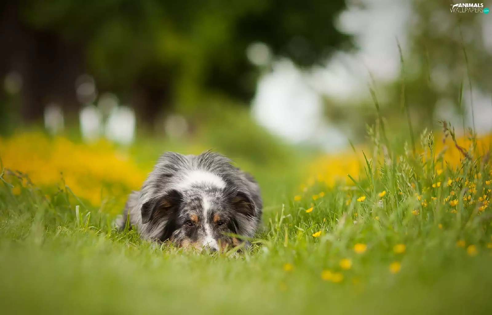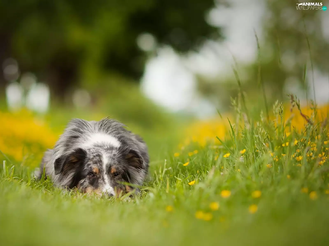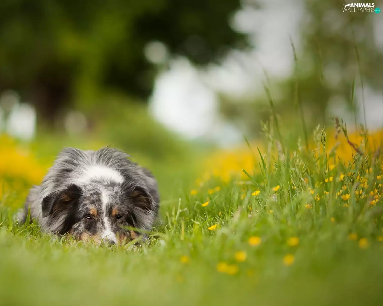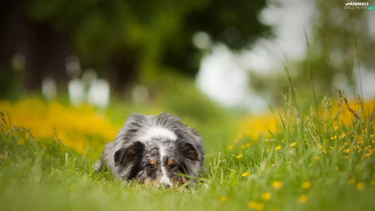 Australian Shepherd, grass, Flowers, Meadow