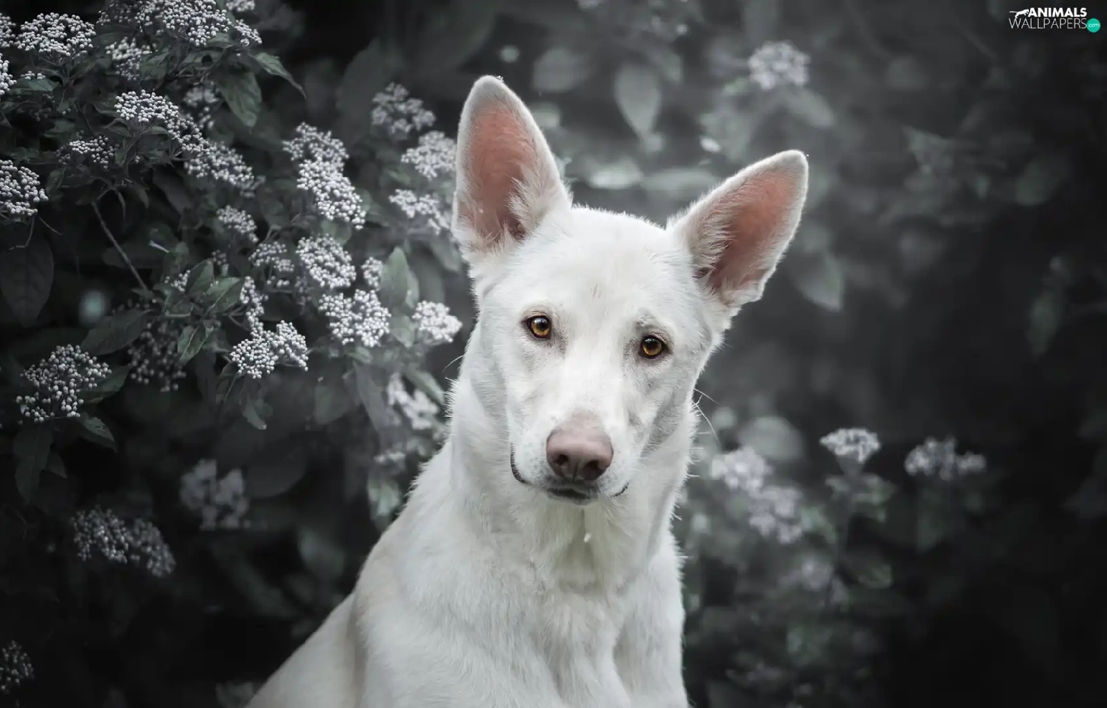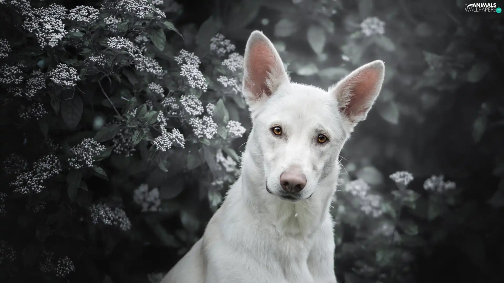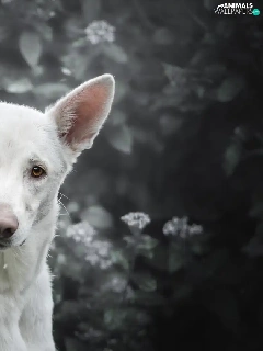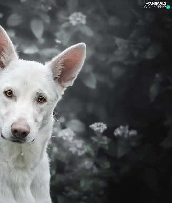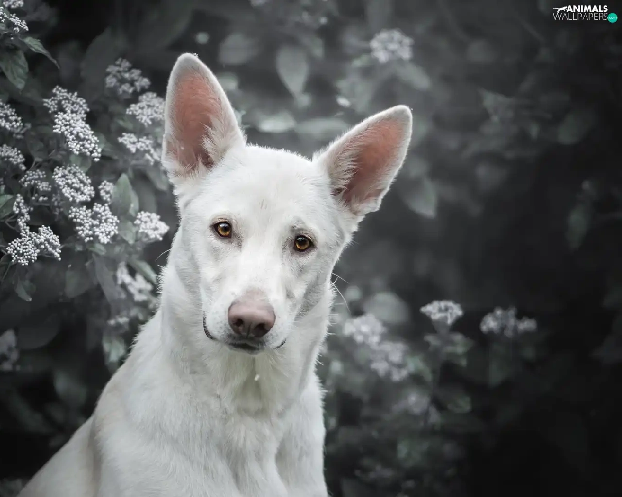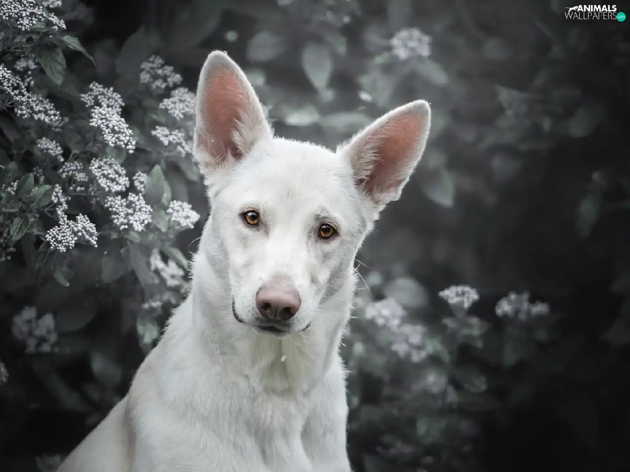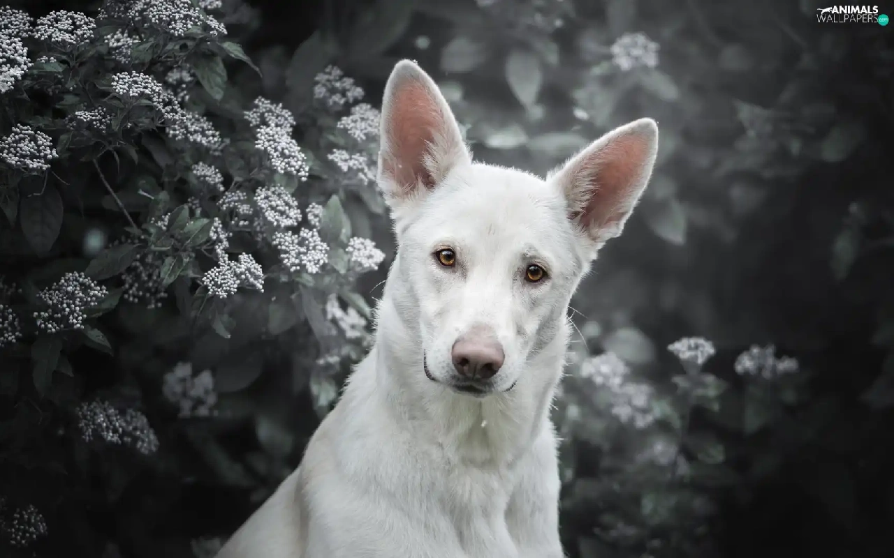 Shepherd US-Canadian, dog, Bush, Flowers, muzzle, White Swiss Shepherd